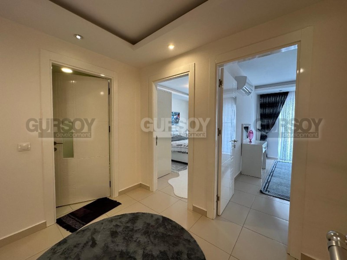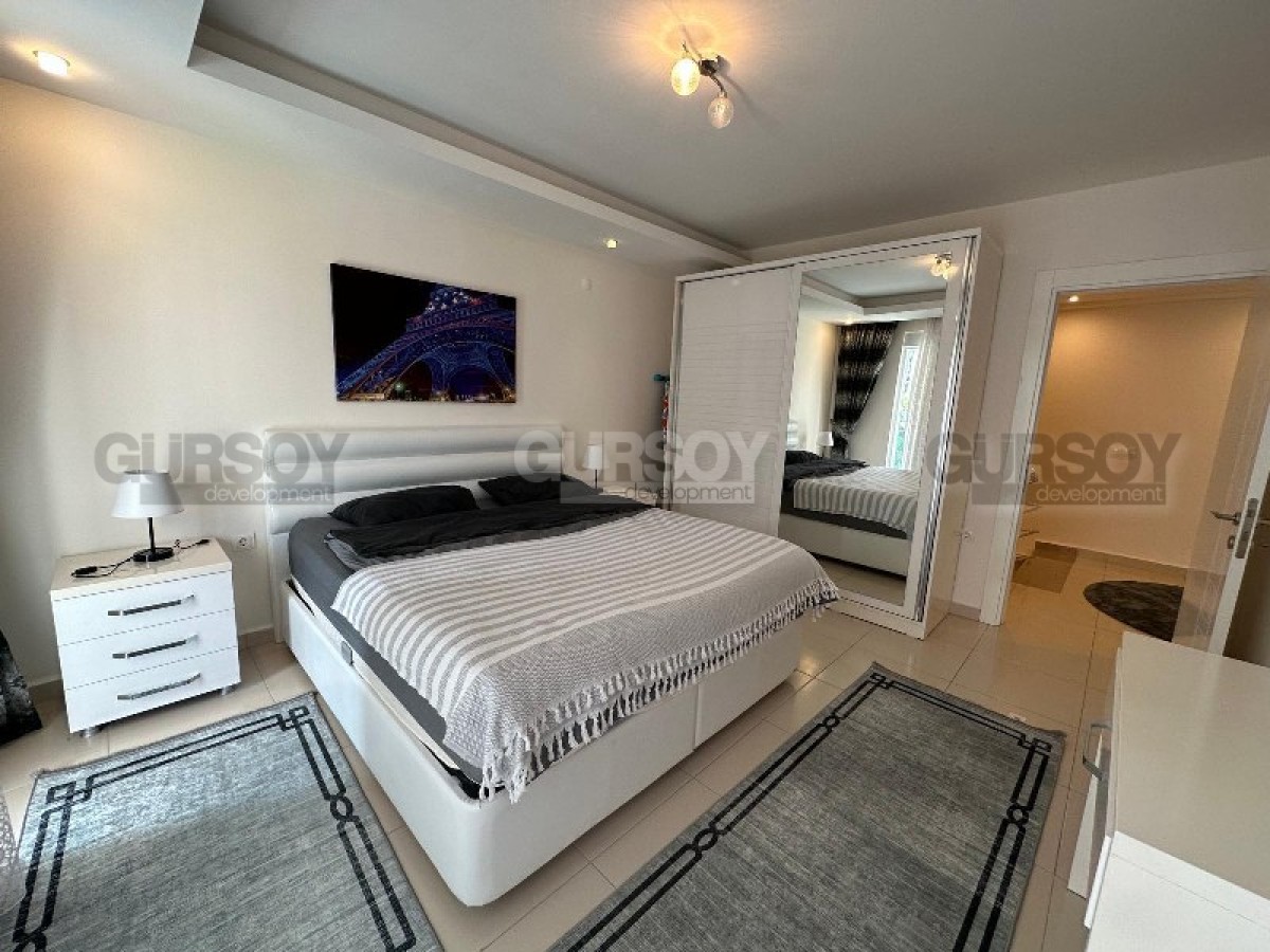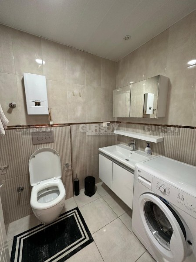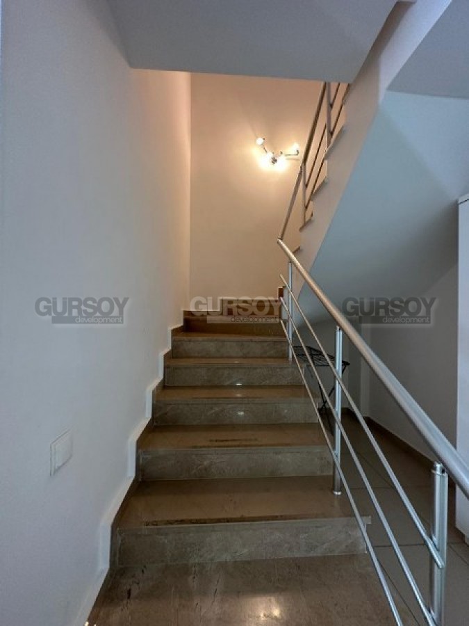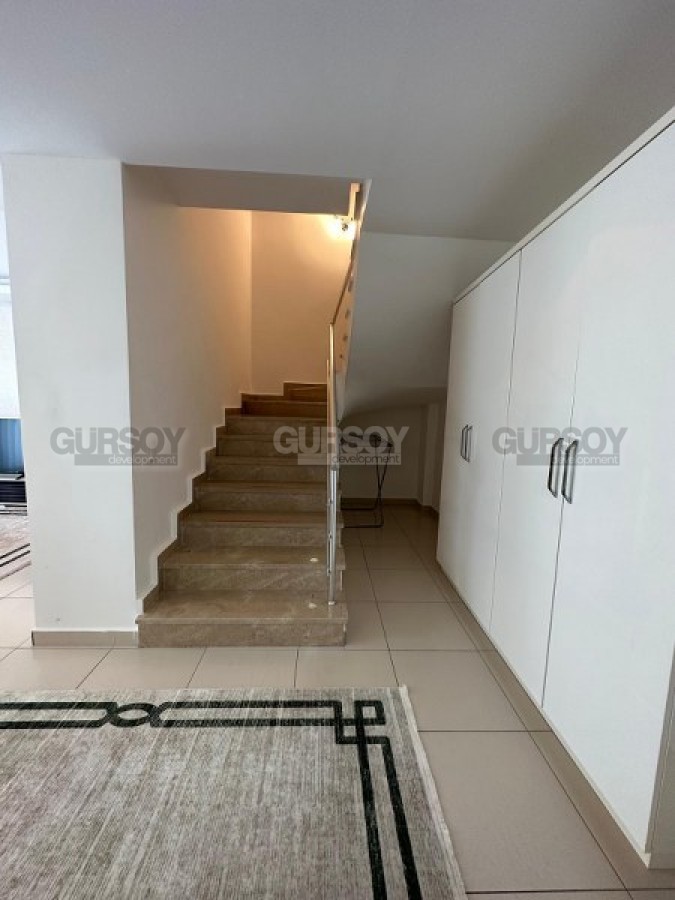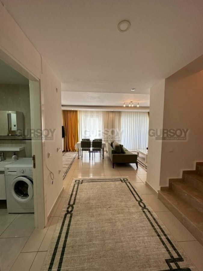 Дуплекс 2+1 предлагает продуманную планировку, включающую светлый зал, совмещенный с кухней, что создает пространство для комфортного отдыха и приема гостей. На первом уровне расположены спальня и общий санузел. Второй уровень включает вторую спальню с выходом на один из двух балконов, а также большую террасу, идеально подходящую для летних вечеров на свежем воздухе. Квартира полностью меблирована и оборудована современной техникой, что обеспечивает максимальный комфорт для проживания.