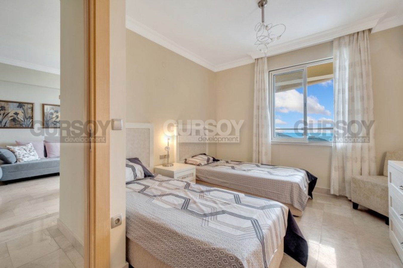 Квартира 2+1, на площади 90 м2, состоит из совмещенной с кухней гостиной, двух спален, оснащенного душевой кабиной санузла, и открытого балкона, с видом на море. Дизайн комнат - современный и лаконичный, с теплыми оттенками в интерьере, практичной мебелью, картинами и предметами декора, создающими уют. Просторная гостиная укомплектована мягкими креслами, диваном, журнальным столиком, тумбой и навесными полками. Компактный кухонный уголок оснащен встроенной бытовой техникой, в спальнях установлены комфортабельные кровати и гарнитуры, а на панорамном балконе имеется набор садовой мебели.