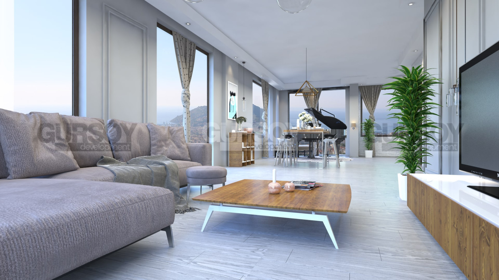 Gürsoy Development, ведущая строительная компания Алании и агентство недвижимости, представляет вам просторную квартиру 3+1, дублекс площадью 175 кв.м. Роскошные апартаменты подарят вам незабываемые виды на море и город.