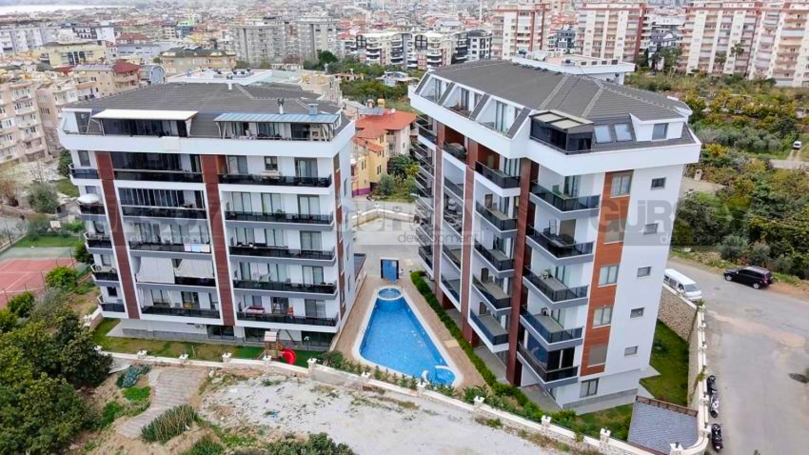 Комплекс расположен в районе Тосмур, всего в 800 метрах от моря, что является отличным преимуществом для любителей пляжного отдыха. Район отличается развитой инфраструктурой, рядом есть магазины, рестораны, кафе и другие необходимые объекты для комфортной жизни.
