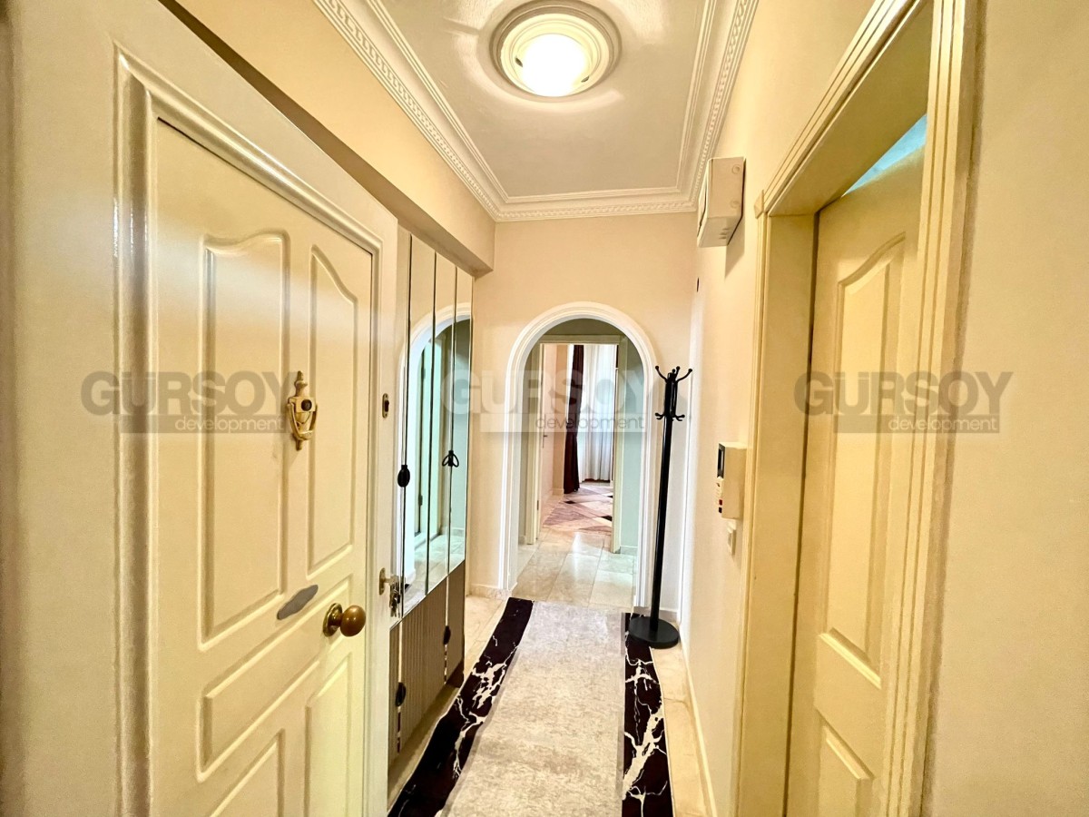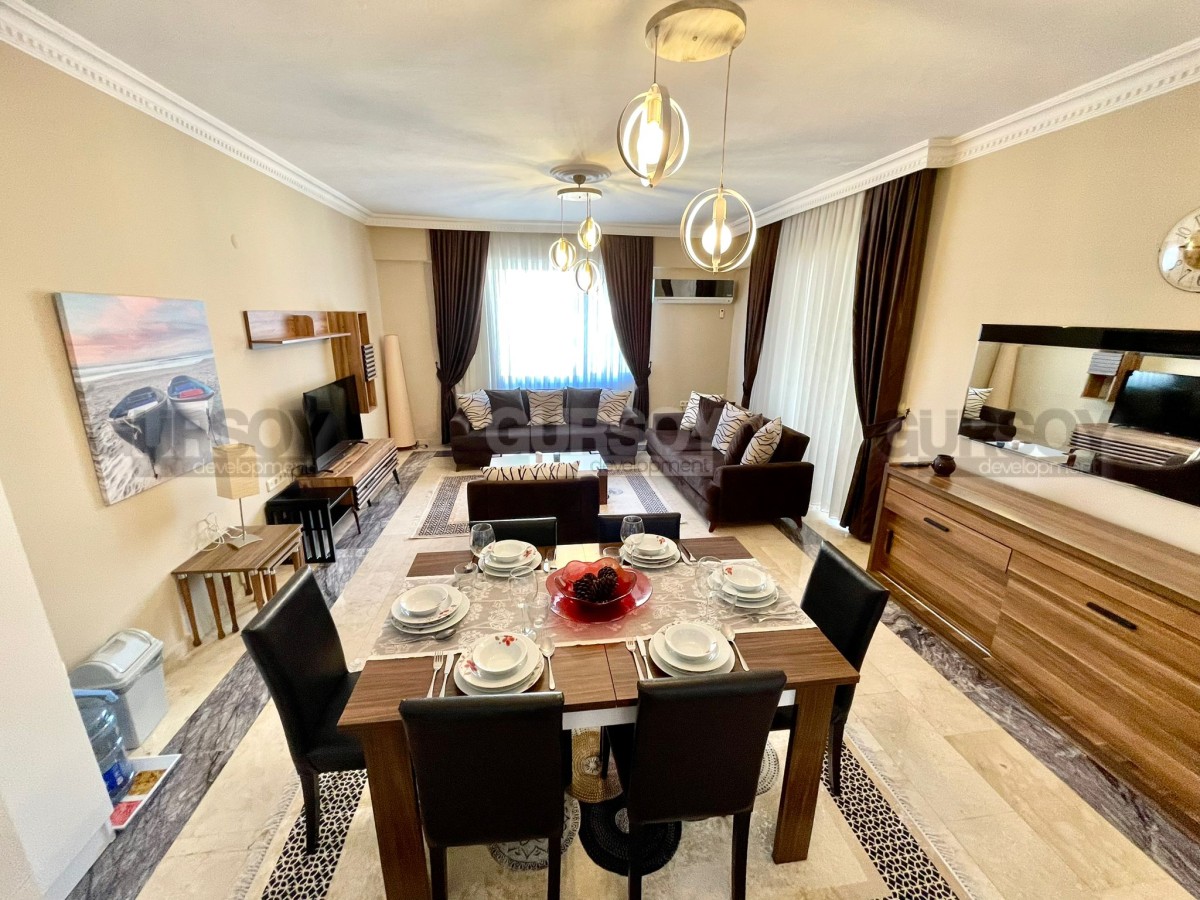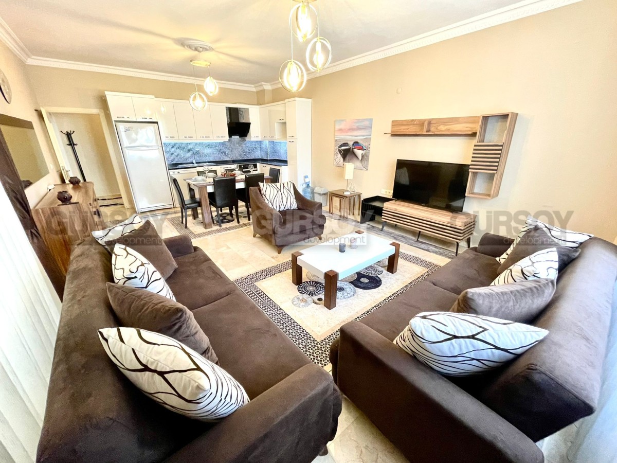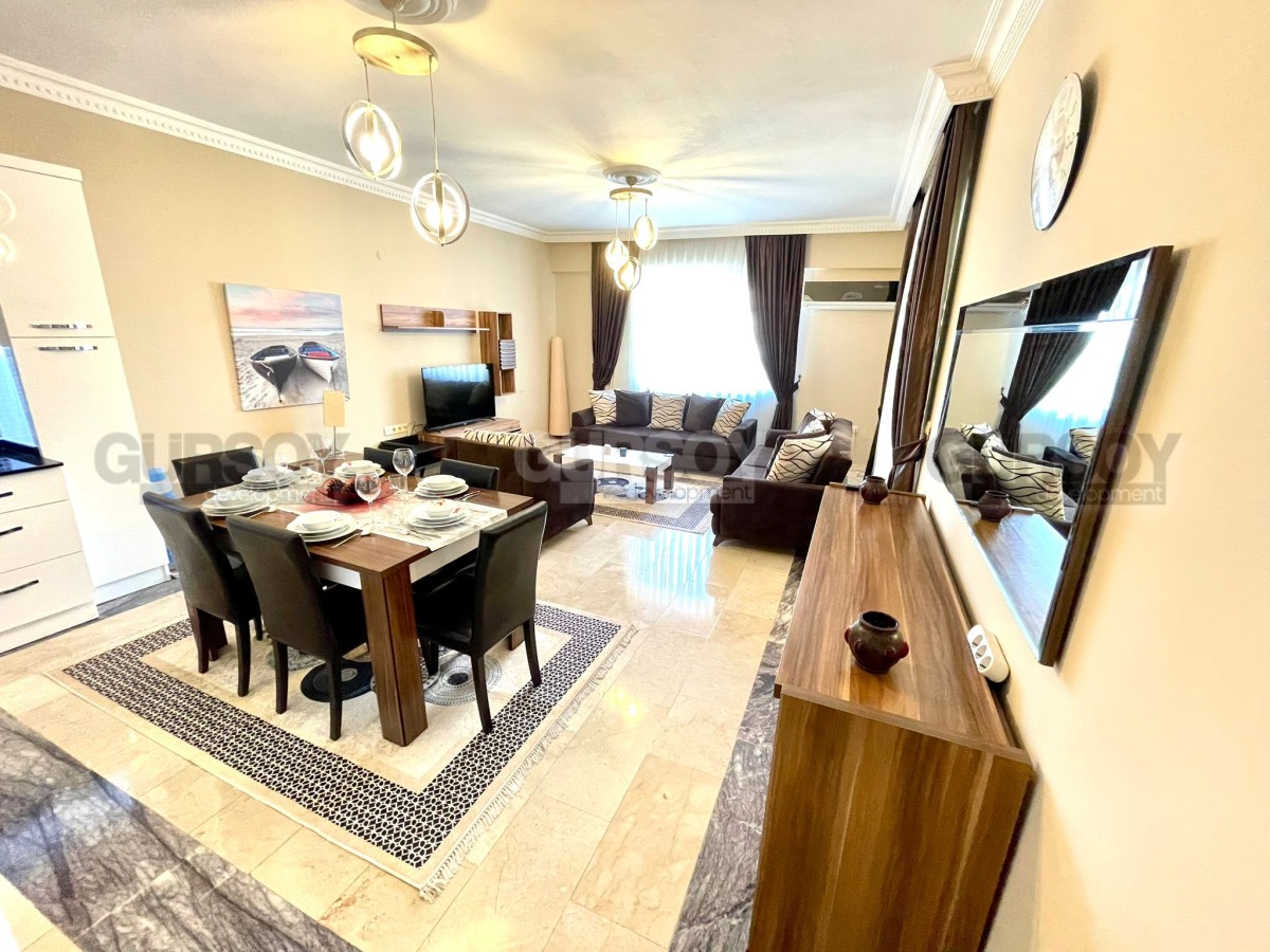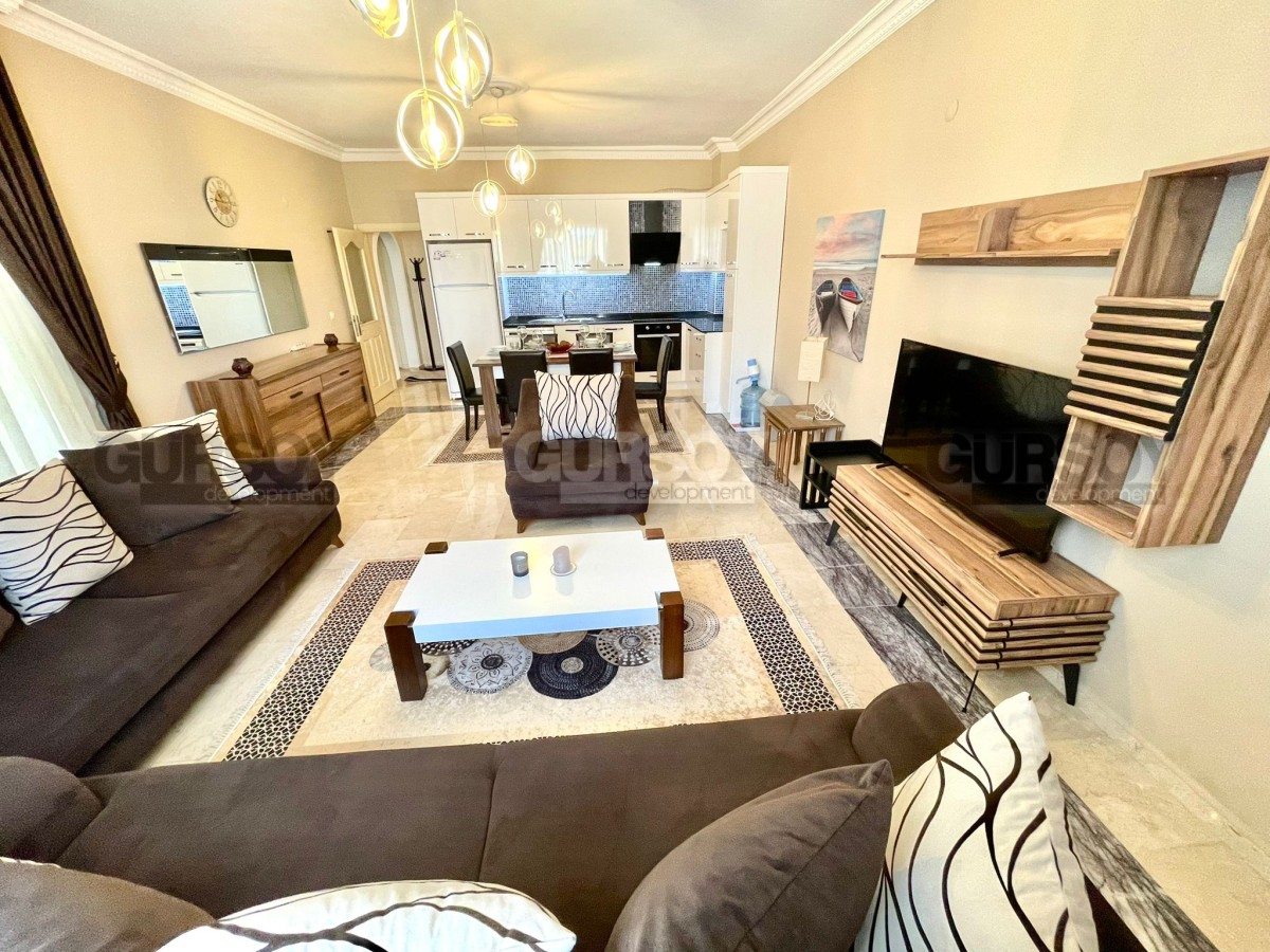 На продажу выставлена квартира 2+1 площадью 110 м2 в районе Оба. Вначале квартиры длинный коридор, где установлен удобный большой шкаф. Слева от входа расположен санузел, а далее по правую сторону открывается просторная гостиная с кухней американского типа. Из зала есть выход на балкон, где установлен стол для трапез на свежем воздухе. В конце коридора находятся две уютные спальни и ещё один санузел.