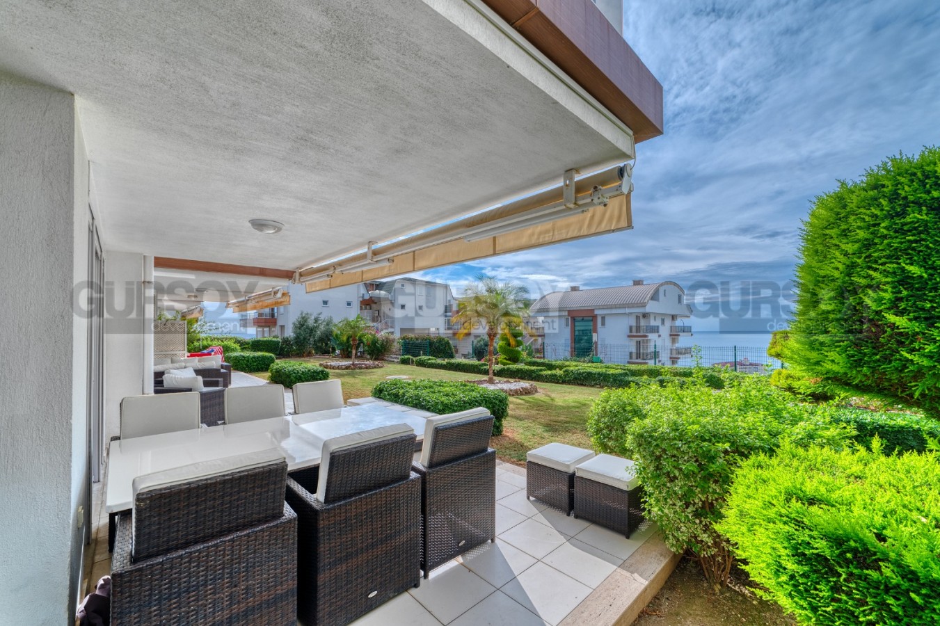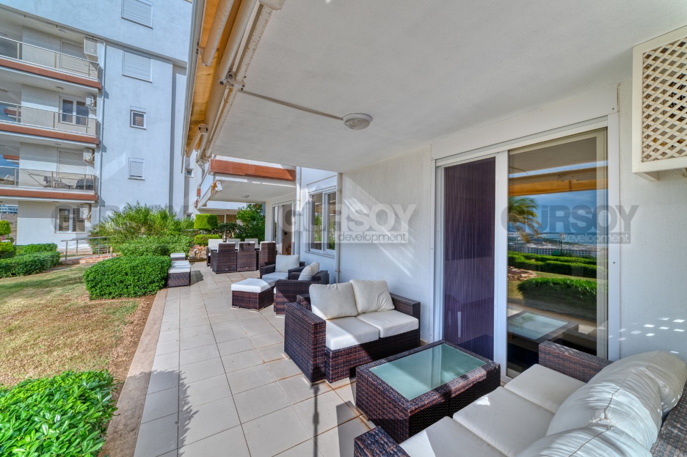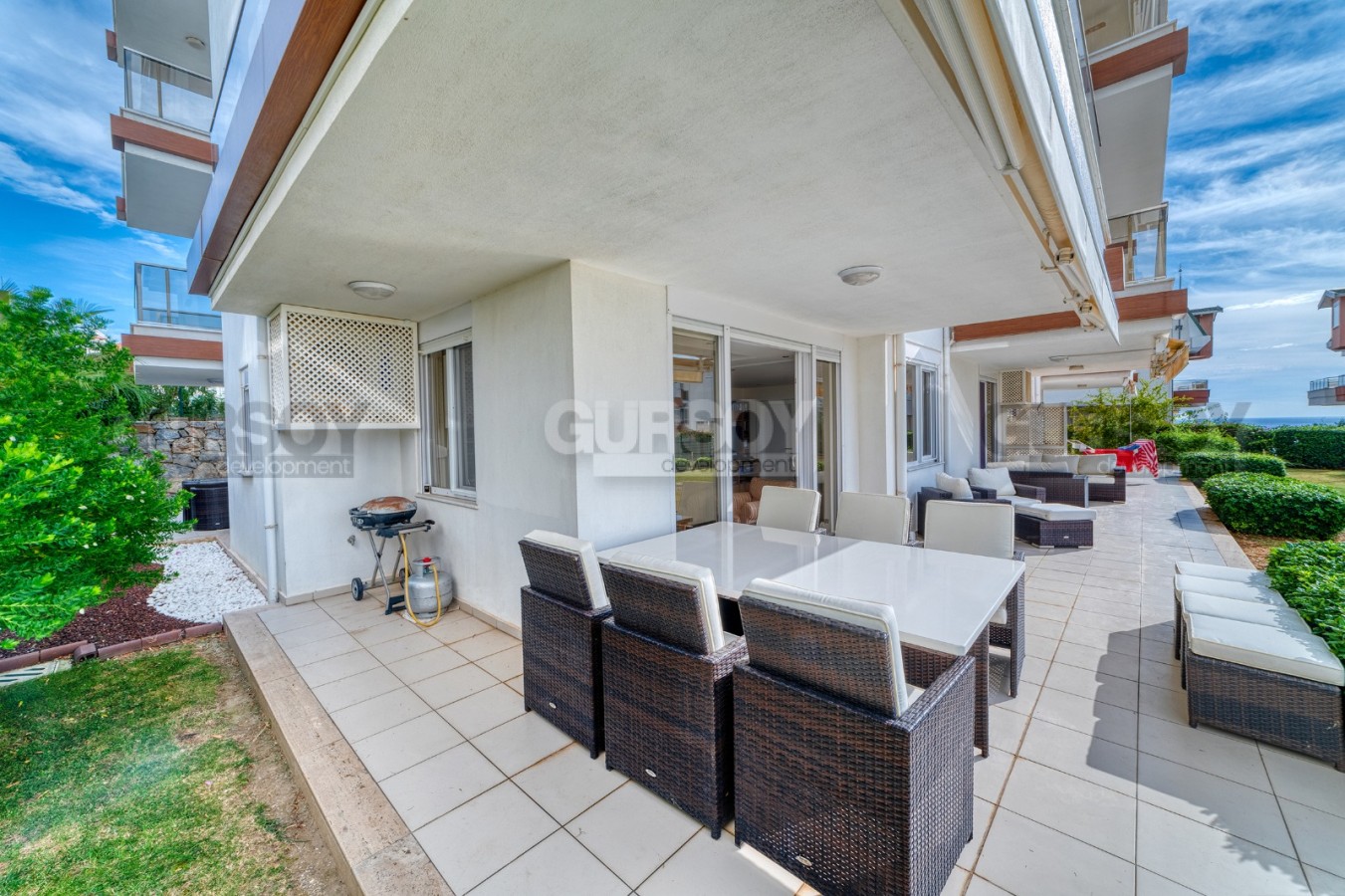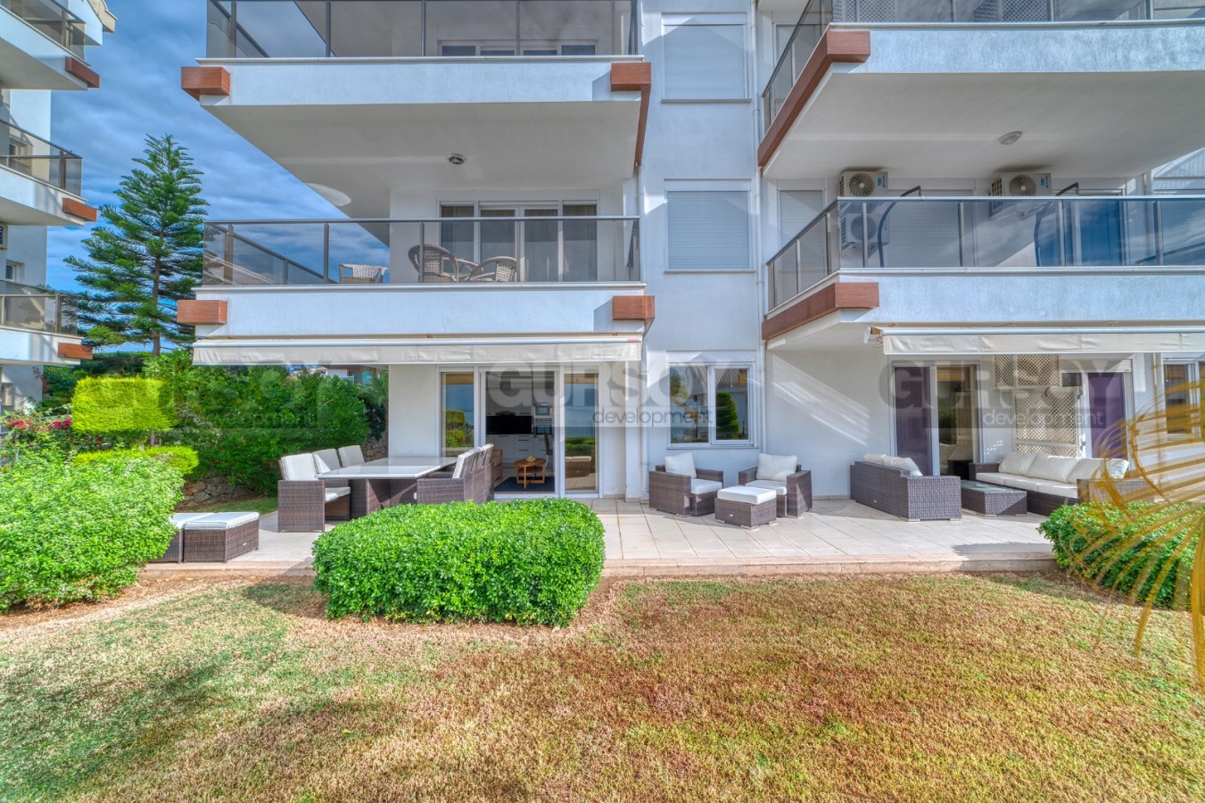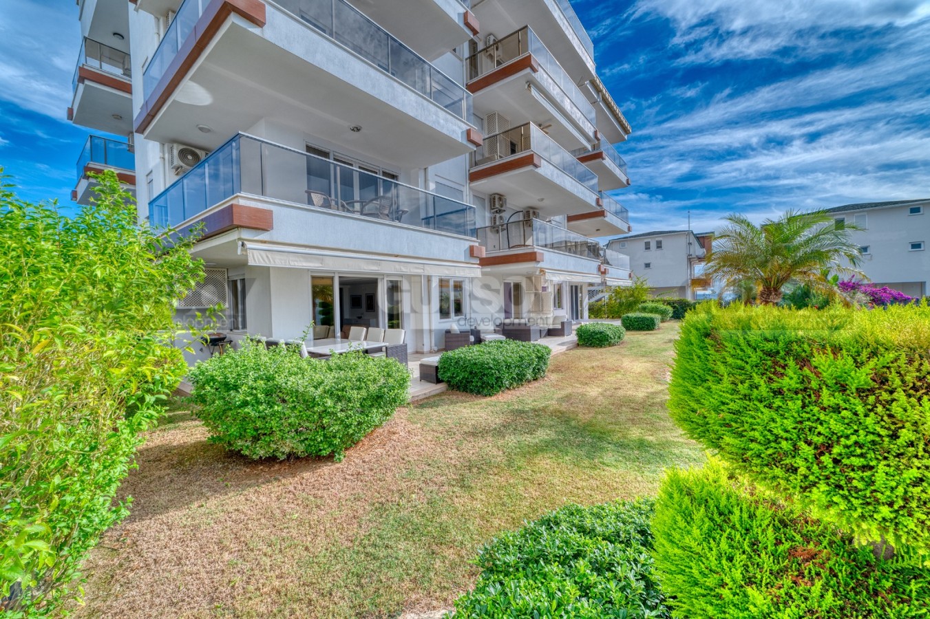 В этом разделе представлена просторная квартира 3+1 с большой открытой террасой в саду, так что если вы не можете выбрать между частным домом и апартаментами в комфортабельном жилом комплексе, это может стать отличной альтернативой. Расположена квартира на 1-м этаже в резиденции 2008 года постройки, в спокойном районе Аланьи - Конаклы. Просторная, общей площадью 160 м2, она состоит из американской кухни, салона, трех спальных комнат, небольшой кладовой, трех оснащенных душевыми кабинами санузлом и открытой террасы с видом на море. В квартире сделан новый ремонт, а дизайн оформлен в современном стиле. В основе интерьера - белый цвет, в котором гармонично смотрятся дерево, яркие картины и предметы декора. Гостиная визуально разделена на несколько функциональных пространств - 2 зоны отдыха с мягкими диванами, креслами, книжным шкафом и журнальными столиками; и кухню с обеденным столом и рабочей поверхностью, оснащенную холодильником, посудомоечной машиной и духовым шкафом. Уютные спальни укомплектованы мягкими кроватями, тумбами и гардеробными шкафами, а при входе имеется дополнительный комод для хранения личных вещей. Неоспоримым преимуществом данной квартиры является наличие большой открытой террасы в ухоженном саду, где можно любоваться морскими пейзажами и устраивать семейные пикники. Тут установлены комфортабельные садовые кресла и диваны, так что это больше похоже на частный двор собственной виллы.