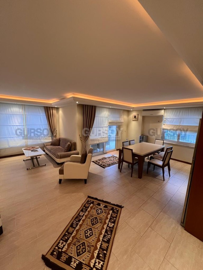 Площадь квартиры - 125 м2. Она расположена на 4-м этаже 11-этажного жилого комплекса 2009 года постройки. Планировка 2+1 в данном варианте подразумевает наличие гостиной, совмещённой с кухней, 2 спален, 2 ванных комнат и балкона. Квартира продаётся с мебелью, бытовой техникой, кондиционерами, точечным освещением и LED подсветкой. Ванные комнаты оборудованы сантехникой и душевыми кабинами, есть бойлер.
