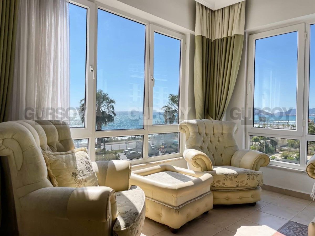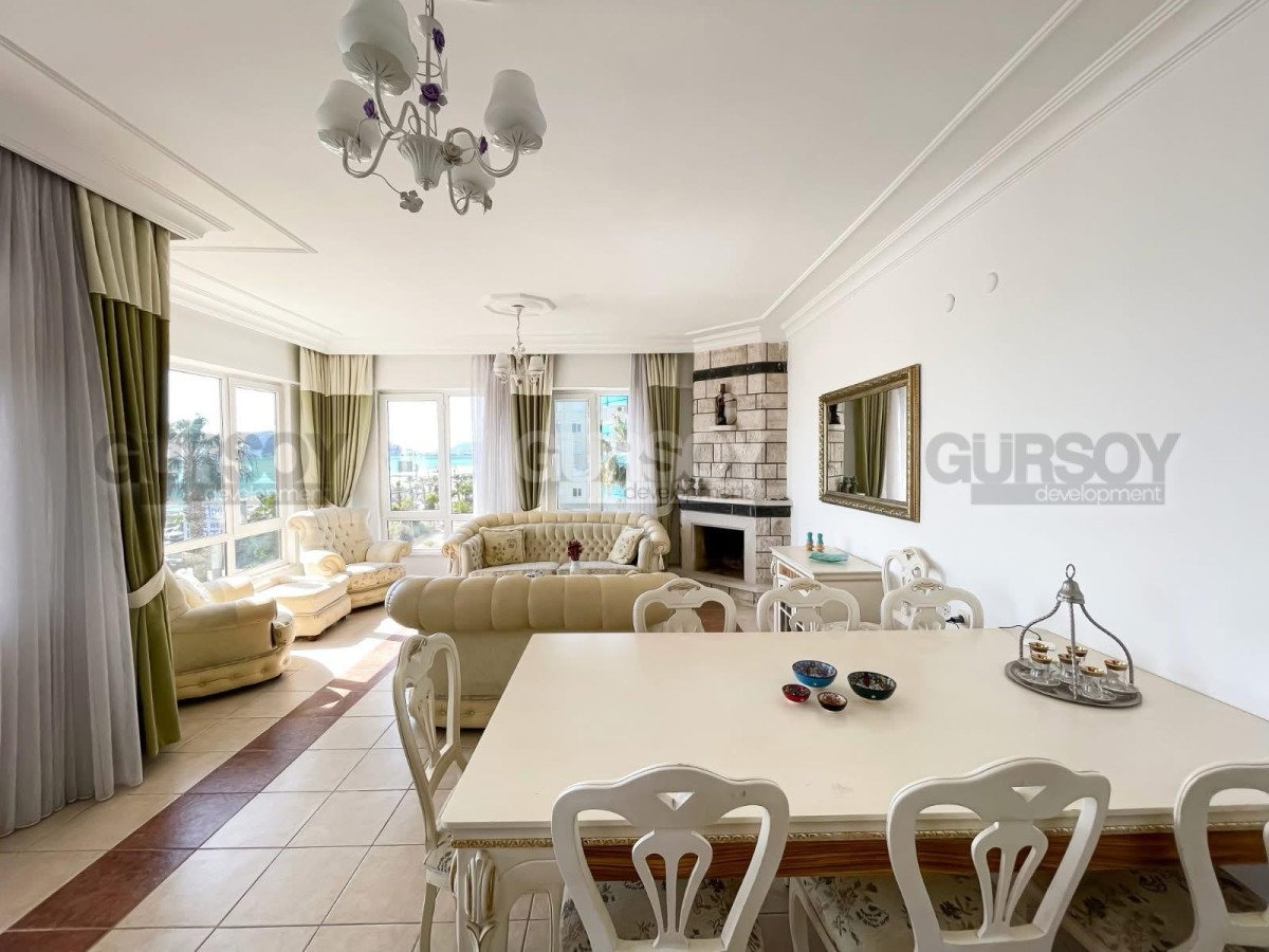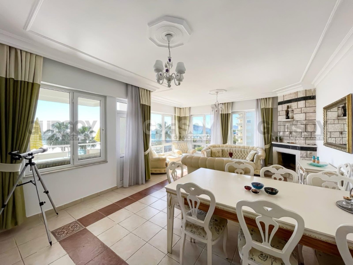 Общая площадь квартиры составляет 150 м². Апартаменты полностью меблированы и готовы к проживанию. Квартира находится на 4 этаже 5-этажного дома, отличается продуманной планировкой и южной ориентацией, благодаря чему помещения наполнены естественным светом. Из окон открывается великолепный панорамный вид на Средиземное море и историческую крепость Кале.