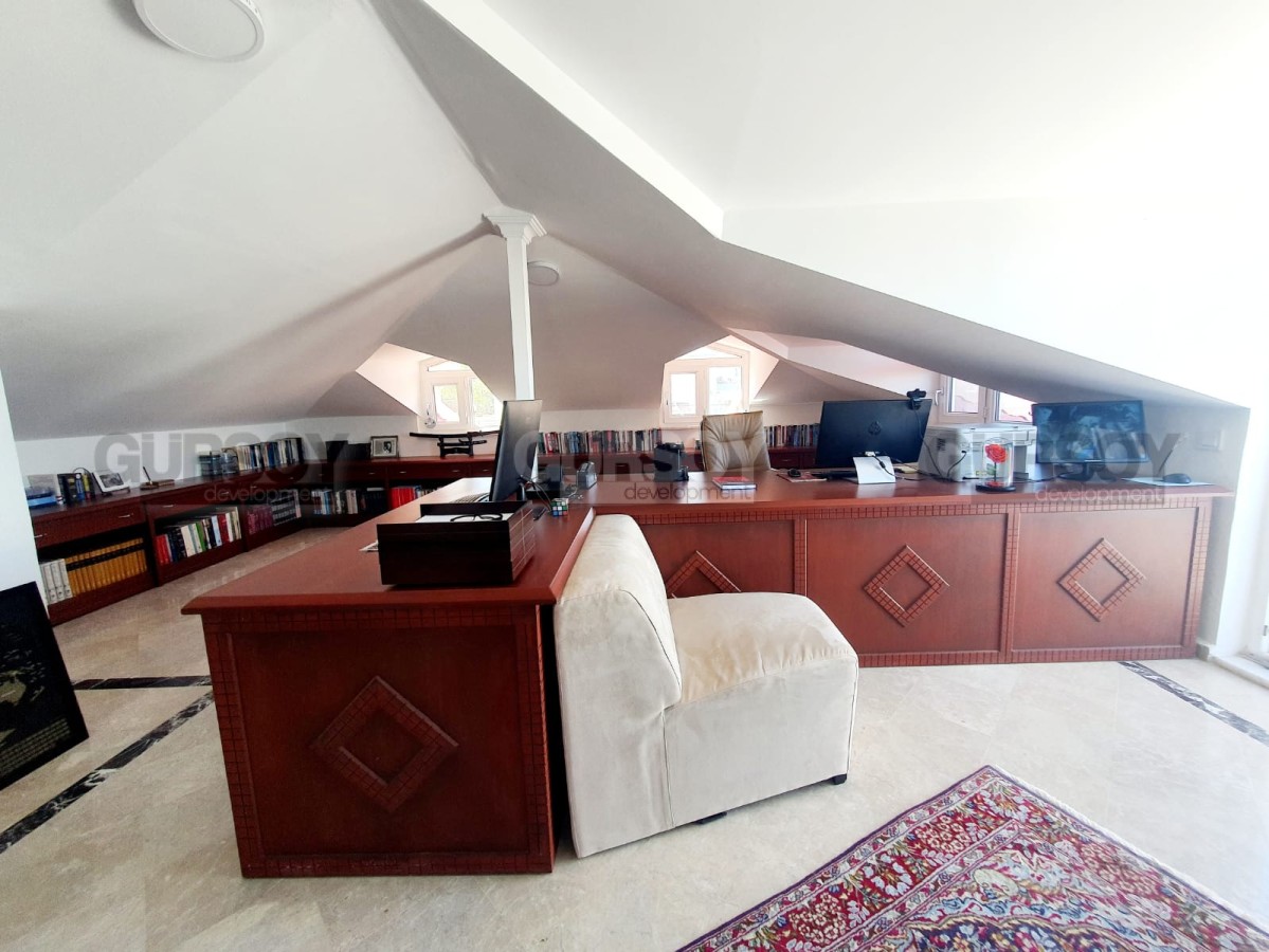 Вилла была построена в 2013 году и состоит из 4х этажей: 2ве гостиные, кухня выведена в отдельную зону, несколько спален, также кабинет, прачечная, 3и гардеробных, 4ре ванных комнат и столько же балконов, откуда открываются прекрасные виды на город и море. В вилле предусмотрено подвальное помещение.