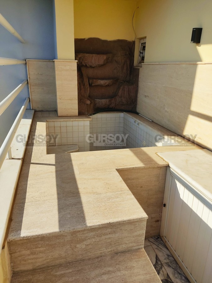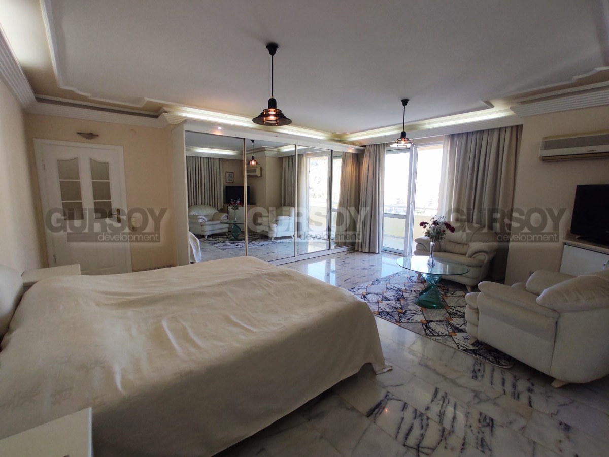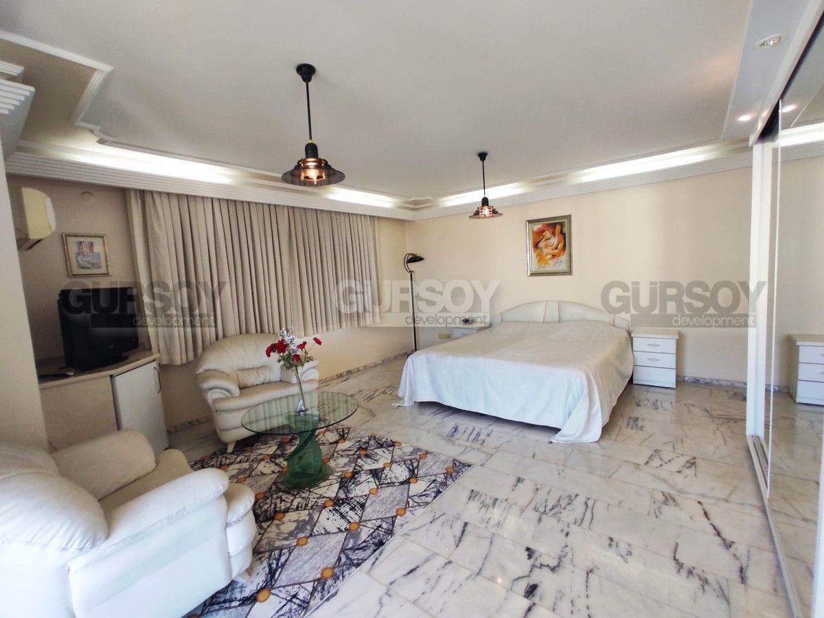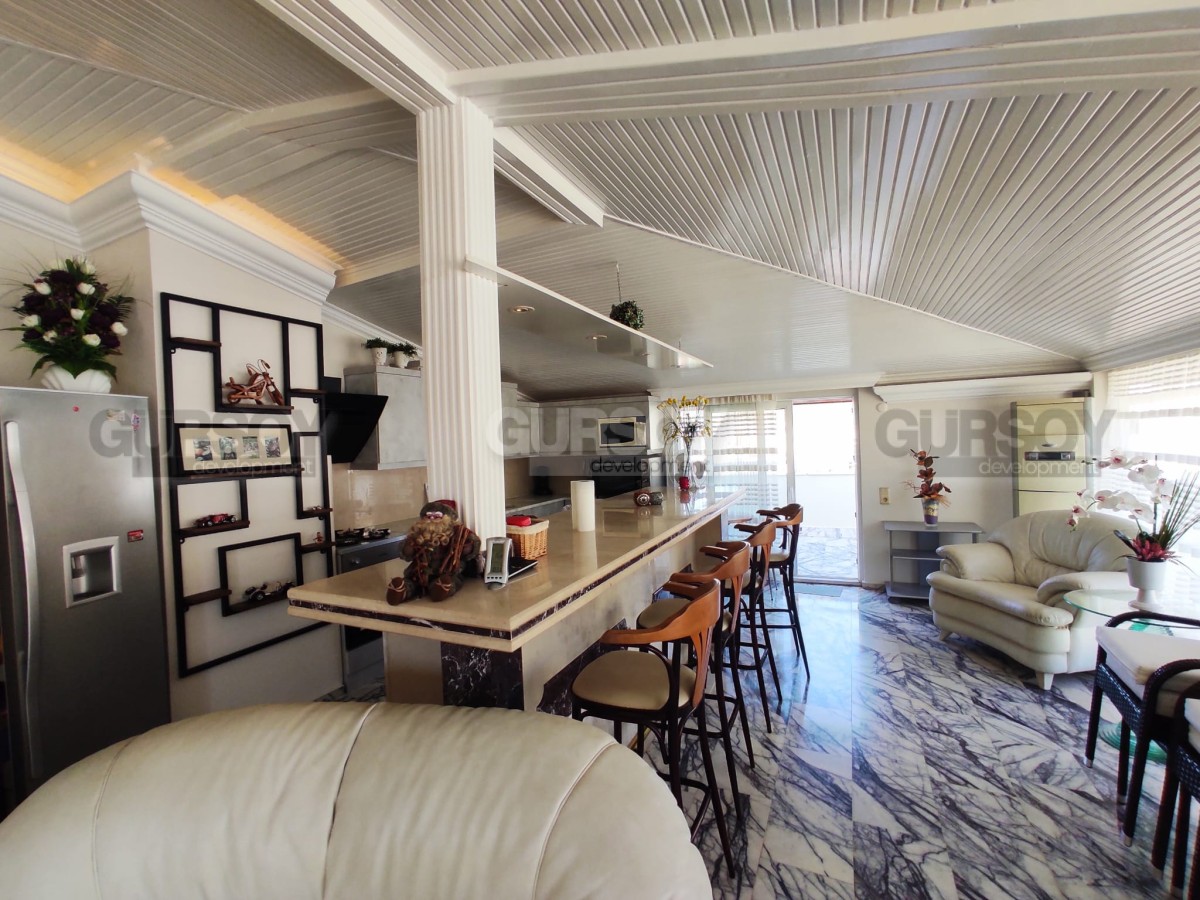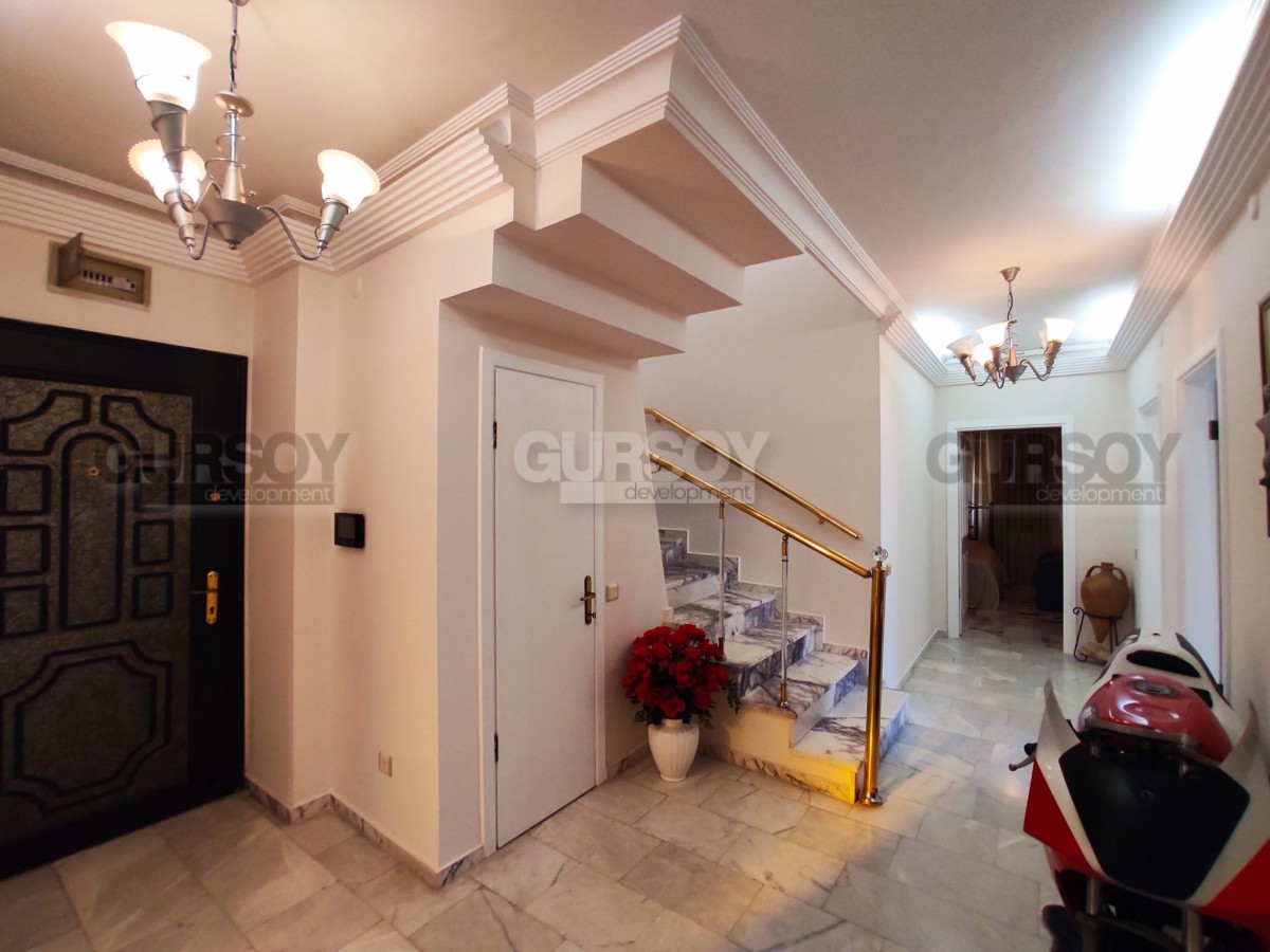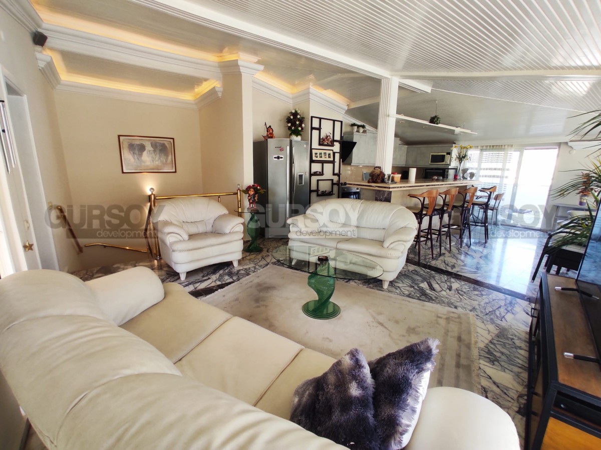 На продажу представлена просторная двухуровневая квартира в центральном районе Алании – Сарай. Планировка 4+1 с общей площадью 256 кв.м., квартира располагается на восьмом этаже жилого комплекса. Она полностью меблирована, с окнами из ПВХ и стальными входными дверями.
