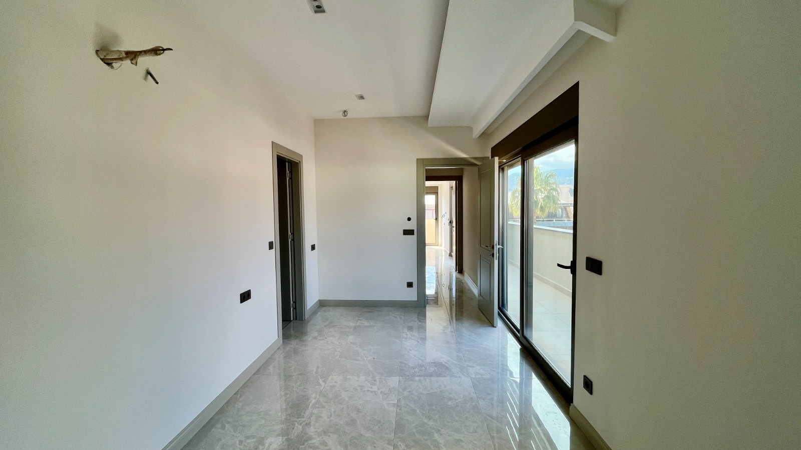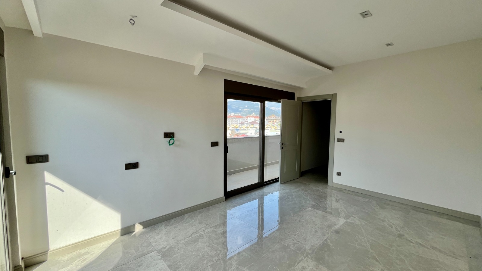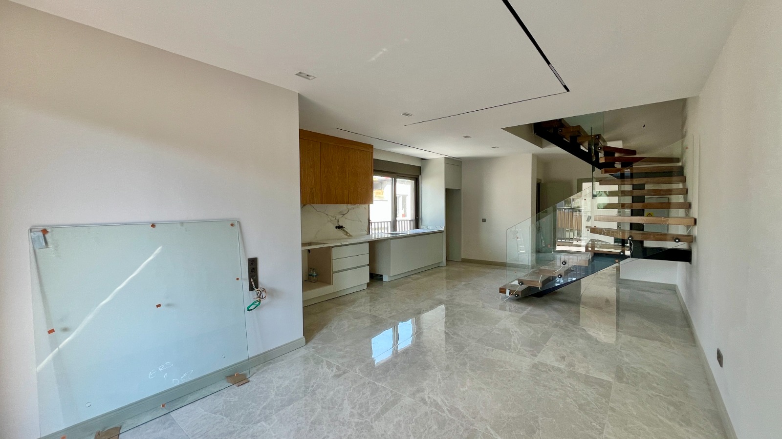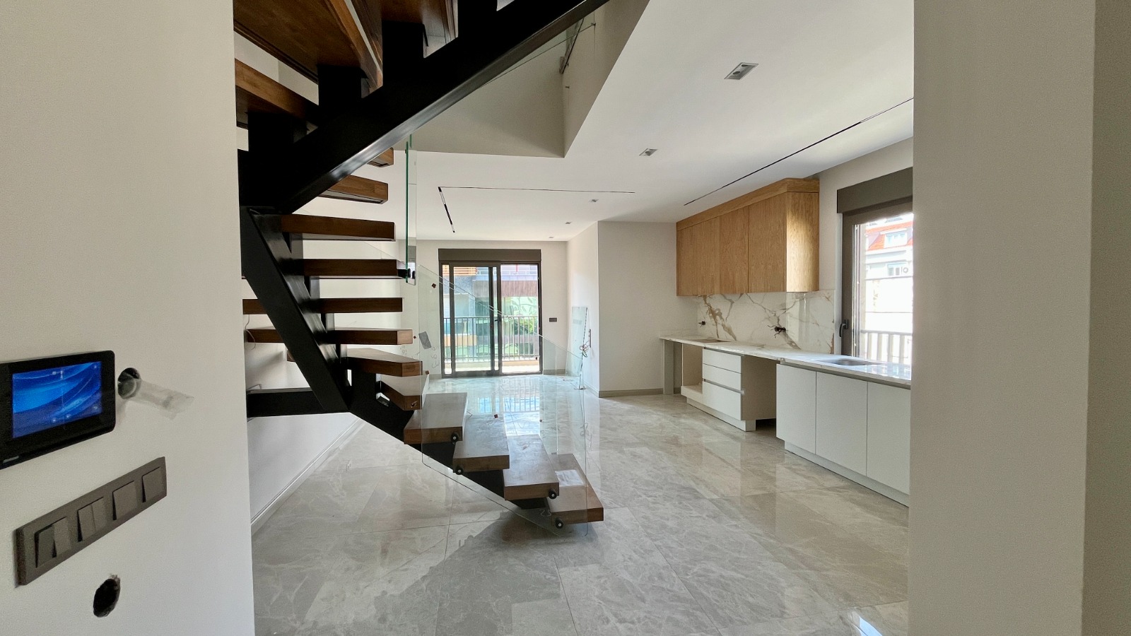Предлагается к продаже двухуровневая квартира 3+1 общей площадью 135 м², расположенная на 4–5 этажах в районе Обагёль. Дом 2025 года постройки, современный пятиэтажный жилой комплекс. Квартира без мебели, имеет два балкона, планировка включает гостиную с кухней, отдельные спальни и два санузла.