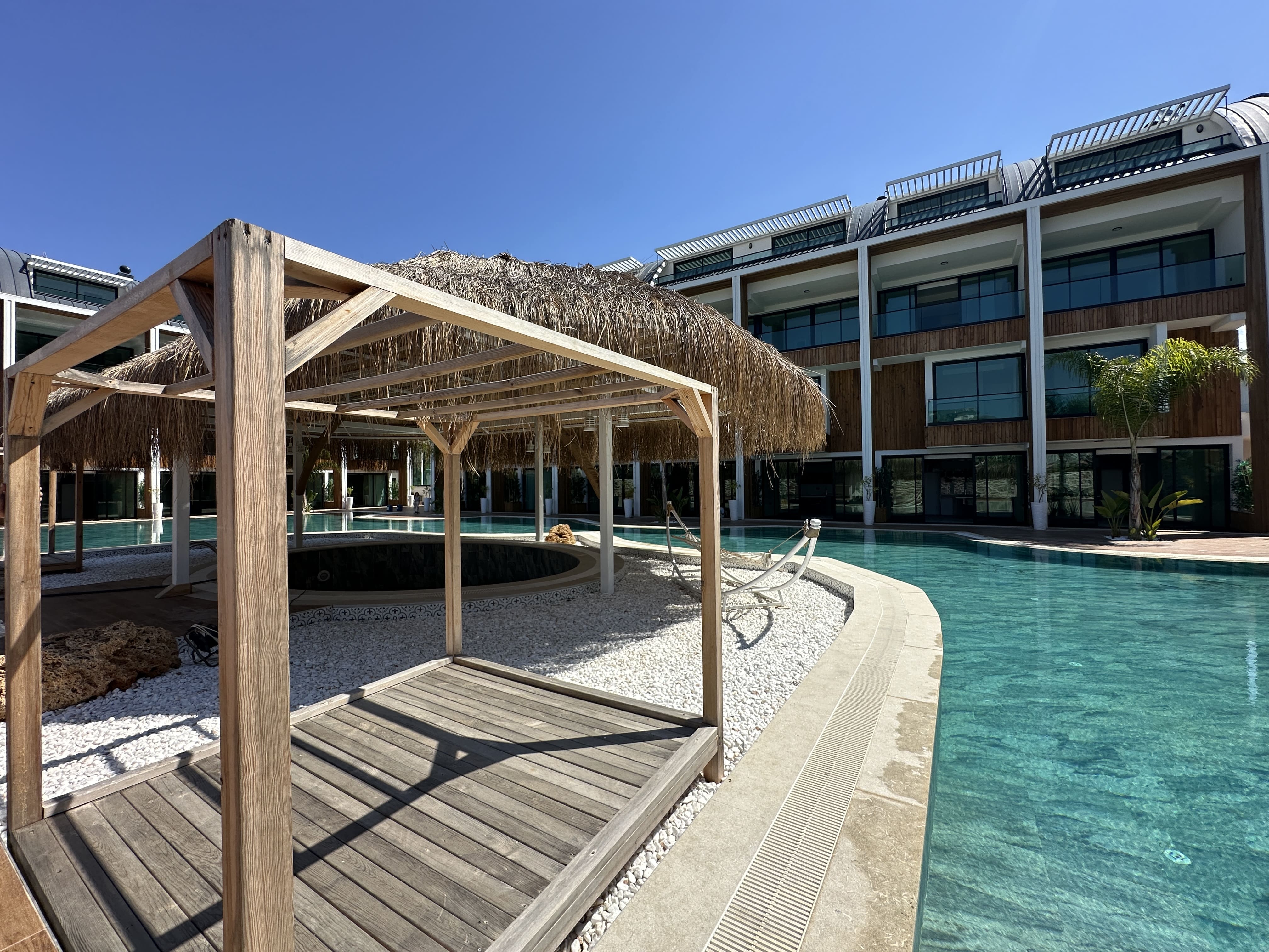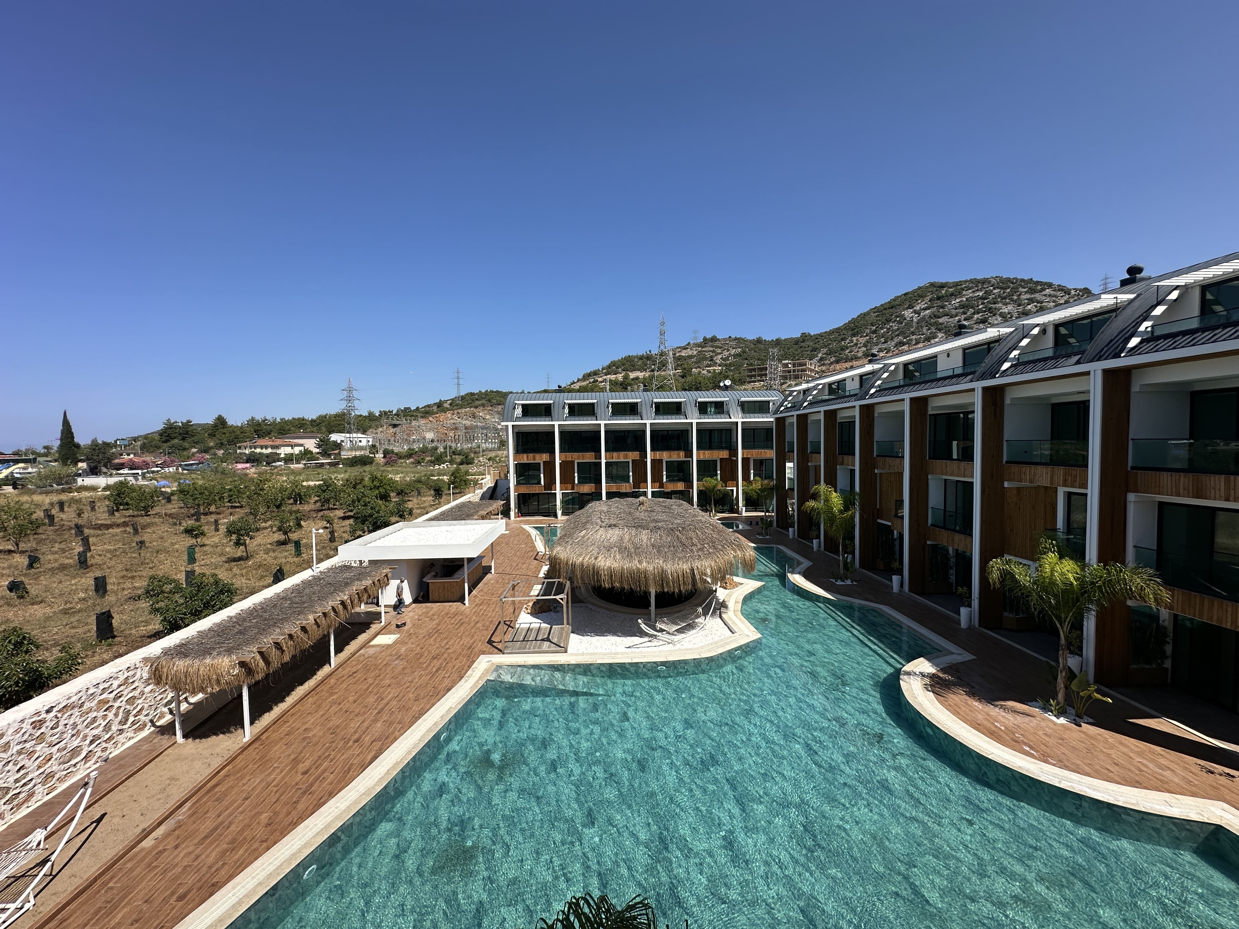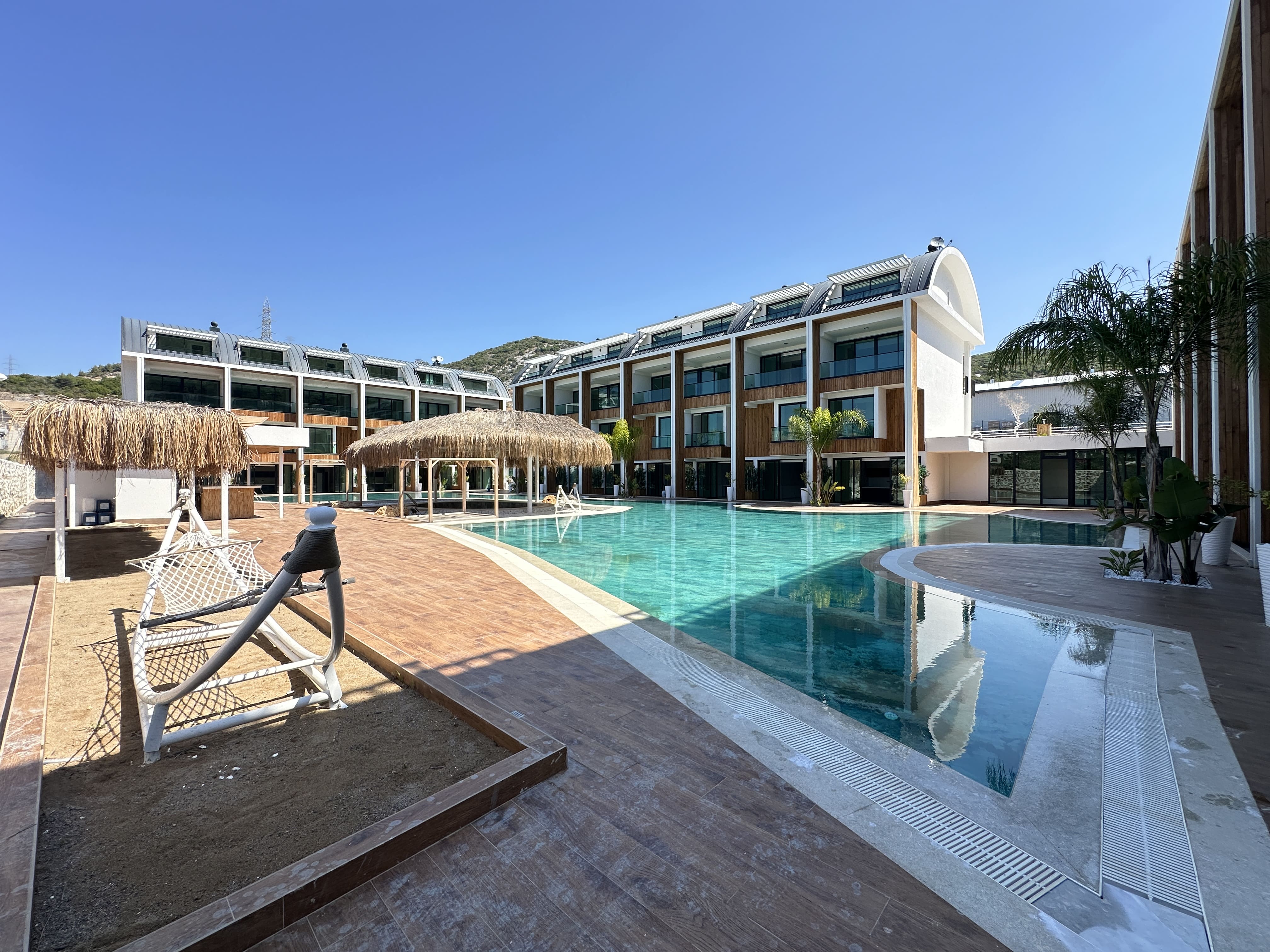 Комплекс был построен в 2024 году и включает в себя множество удобств для комфортного проживания. В нем есть как открытый, так и полу-открытый подогреваемый бассейн, а также большой олимпийский бассейн для жителей. В комплексе предусмотрены сауна, фитнес-центр, джакузи и спа-процедуры. Для детей есть отдельная игровая зона, а для отдыхающих – барбекю зона и комфортабельные зоны для отдыха. Круглосуточная охрана и системы видеонаблюдения обеспечивают безопасность жителей, а подземная парковка предоставляет удобство для владельцев автомобилей.