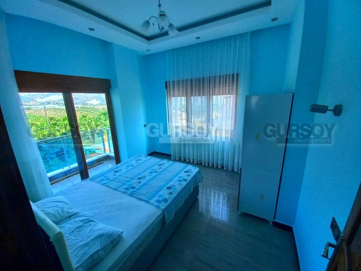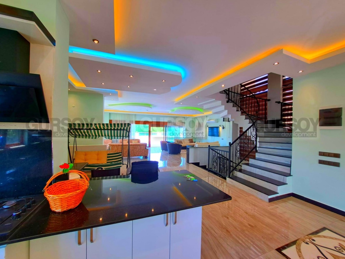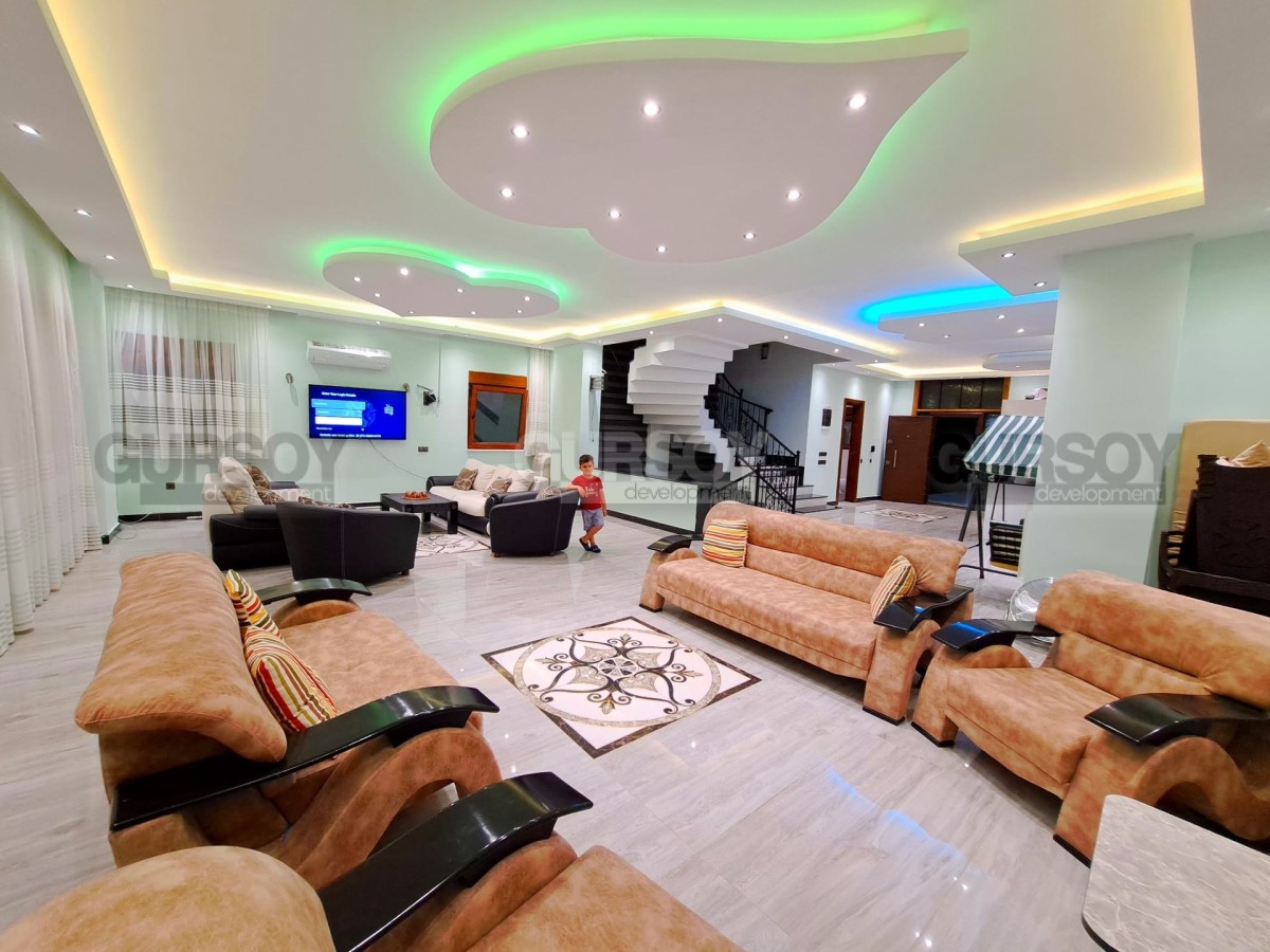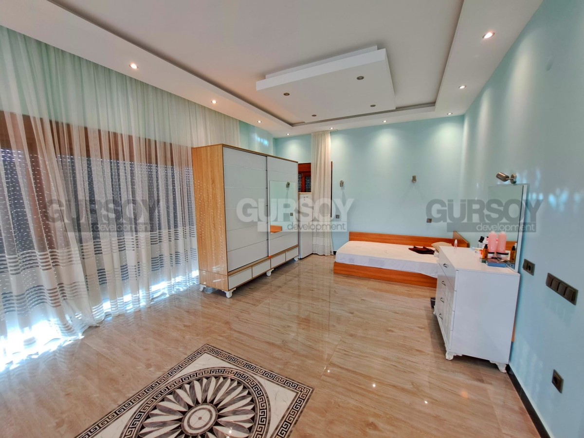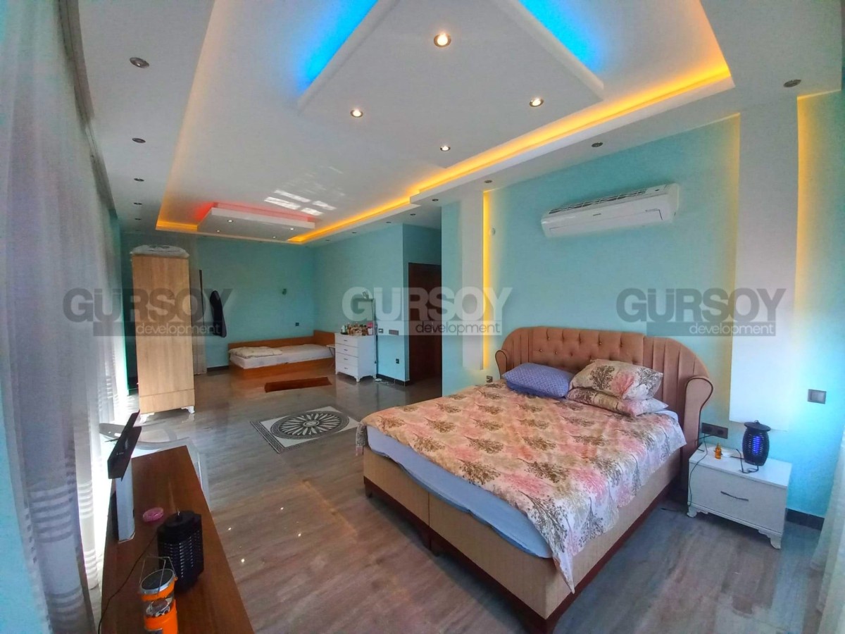 Площадь виллы - 450 м2, а планировка - 11+1. На первом этаже виллы находится гостиная, совмещённая с кухней, на втором 4 спальни, на третьем этаже - кухня и терраса. Также вилла имеет 6 квартир 1+1 с собственным входом. Итого, вилла имеет 8 кухонь и 12 ванных комнат. Вилла полностью готова к проживанию: здесь уже установлена вся необходимая бытовая техника, кондиционеры во всех комнатах. Вилла меблирована в приятных спокойных оттенках, которые добавляют уют и в то же время роскошь. Ванные комнаты оборудованы сантехникой и душевыми кабинами, есть джакузи.