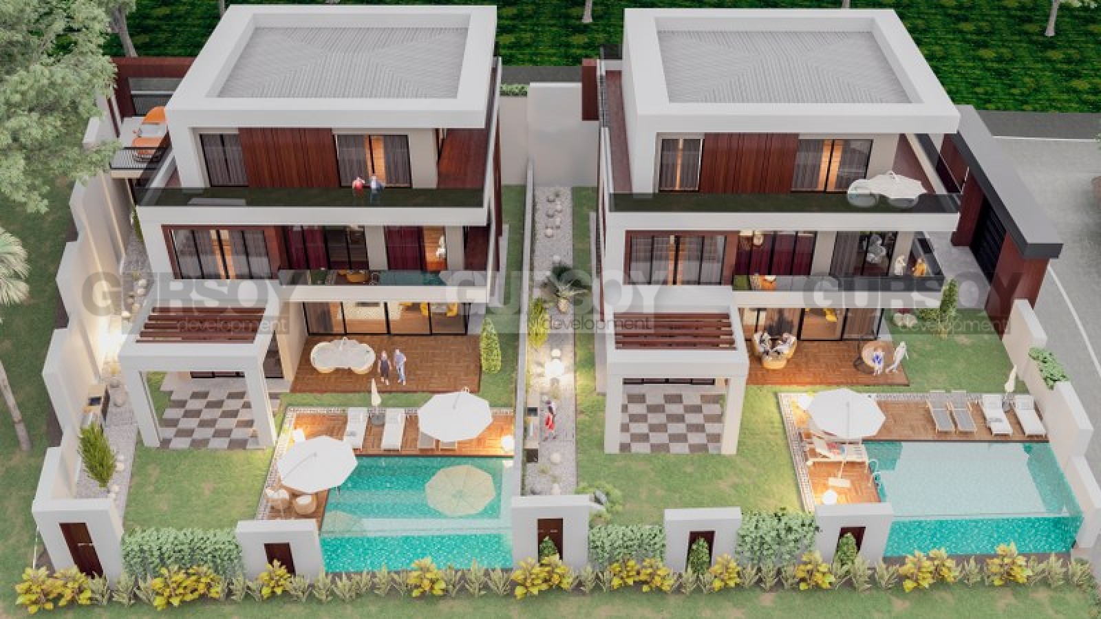 На территории каждой виллы будет оборудован бассейн, с рекреационными зонами и зелеными лужайками вокруг.
