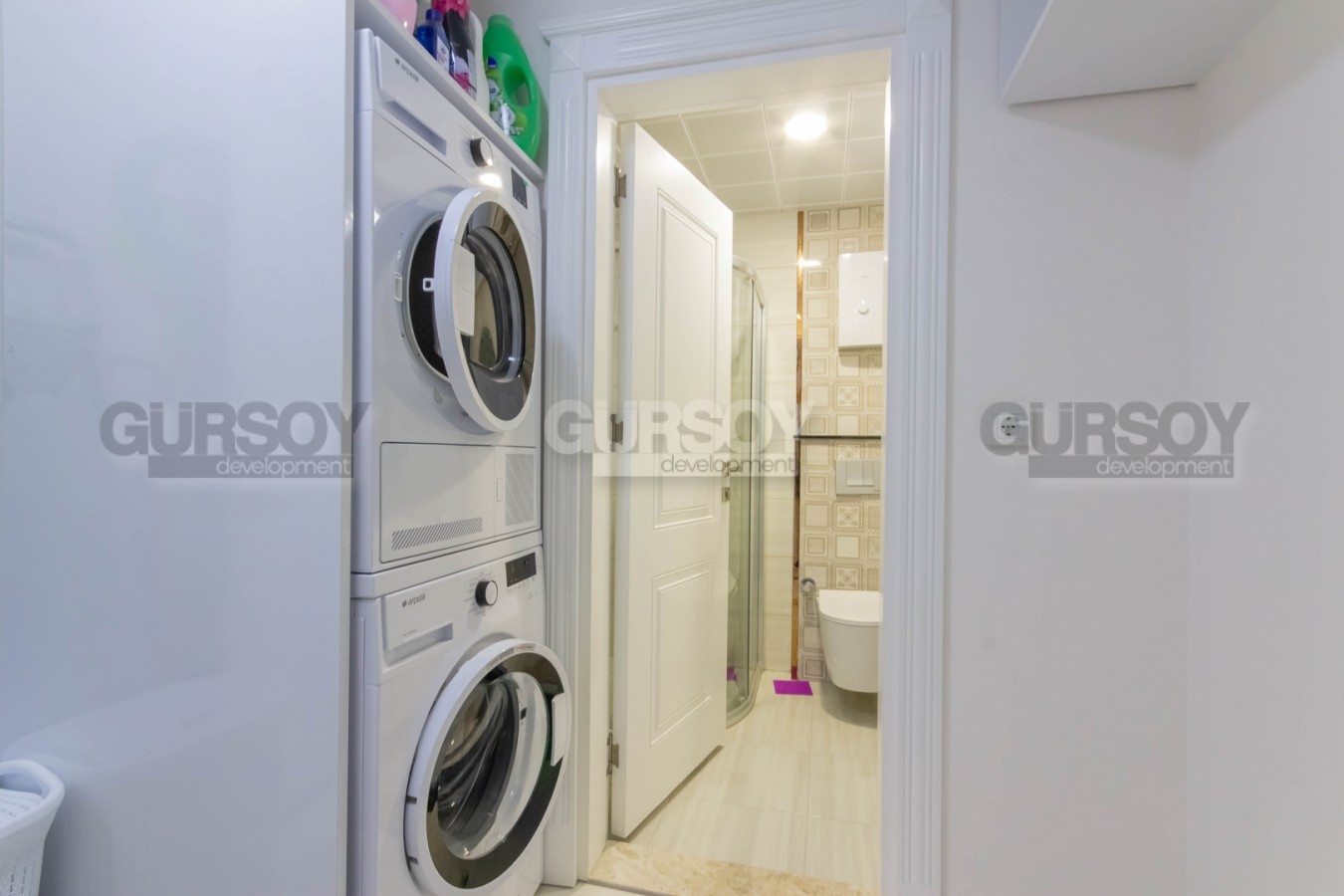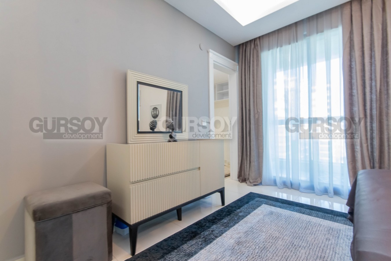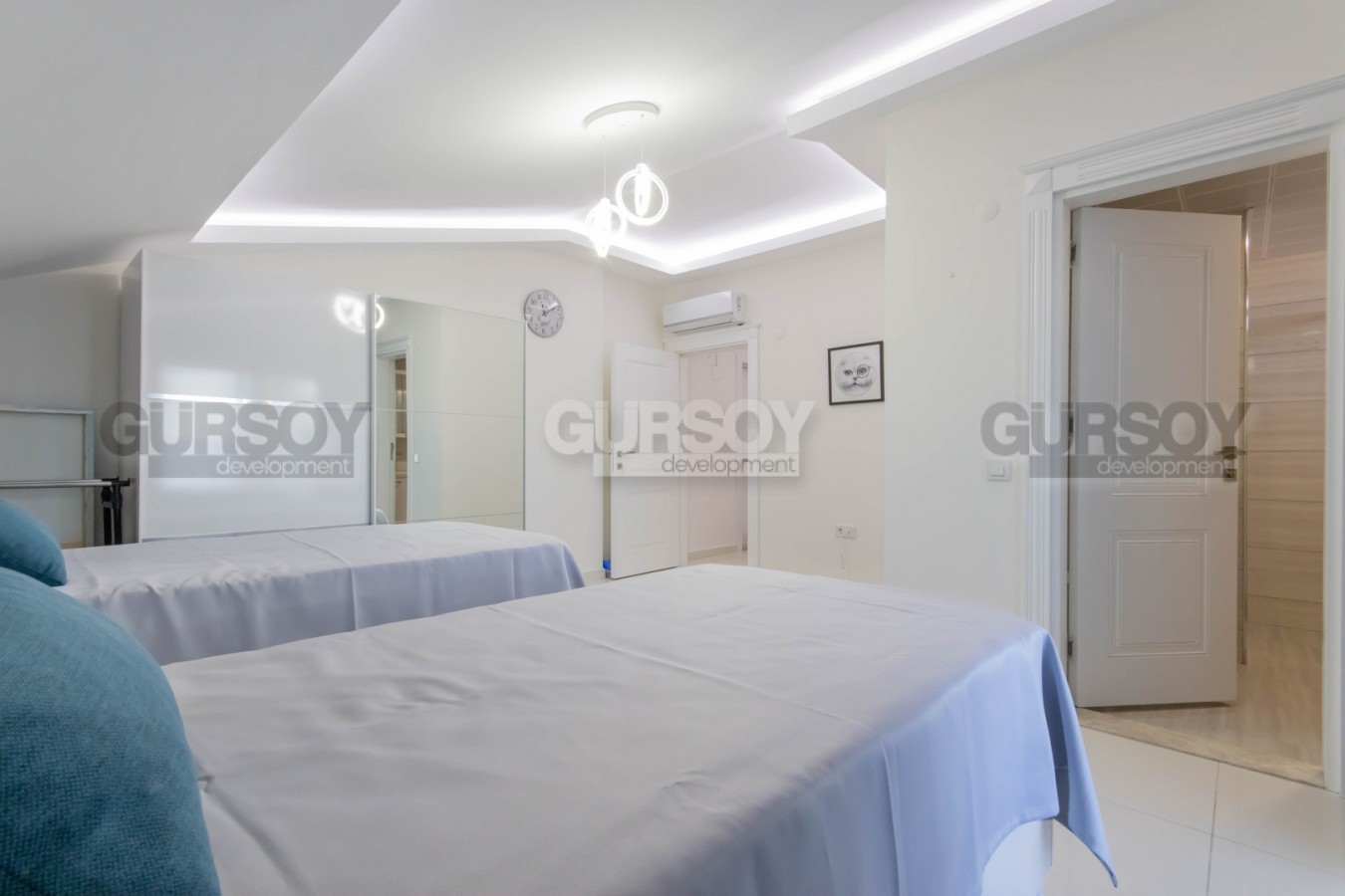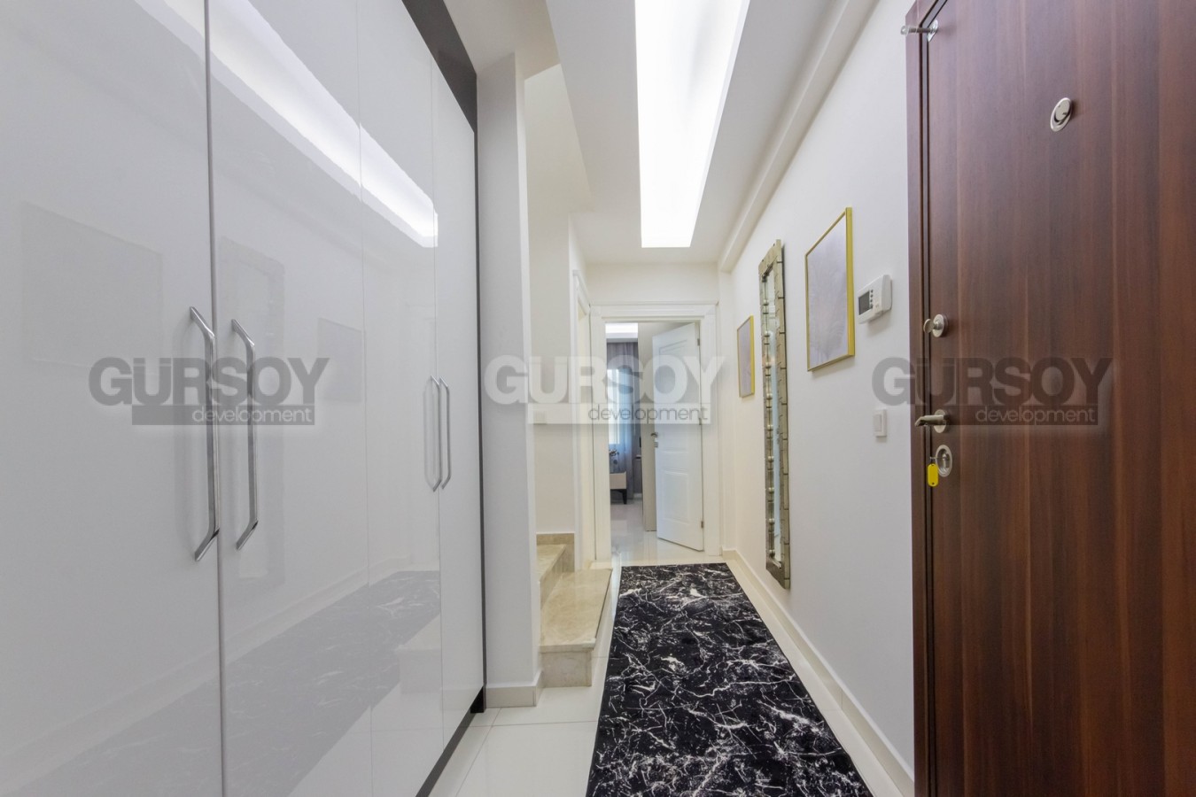 Площадь двухуровневой квартиры - 220 м2. Она расположена на 5-м и 6-м этажах 6-этажного жилого комплекса 2019 года постройки. Планировка 3+1 подразумевает наличие гостиной, совмещённой с кухней, 3 спален, 4 ванных комнат, 2 балконов и террасы. Квартира продаётся с полным комплектом стильной мебели, установленной бытовой техникой, кондиционерами и LED подсветкой. Ванные комнаты оборудованы сантехникой и душевыми кабинами.