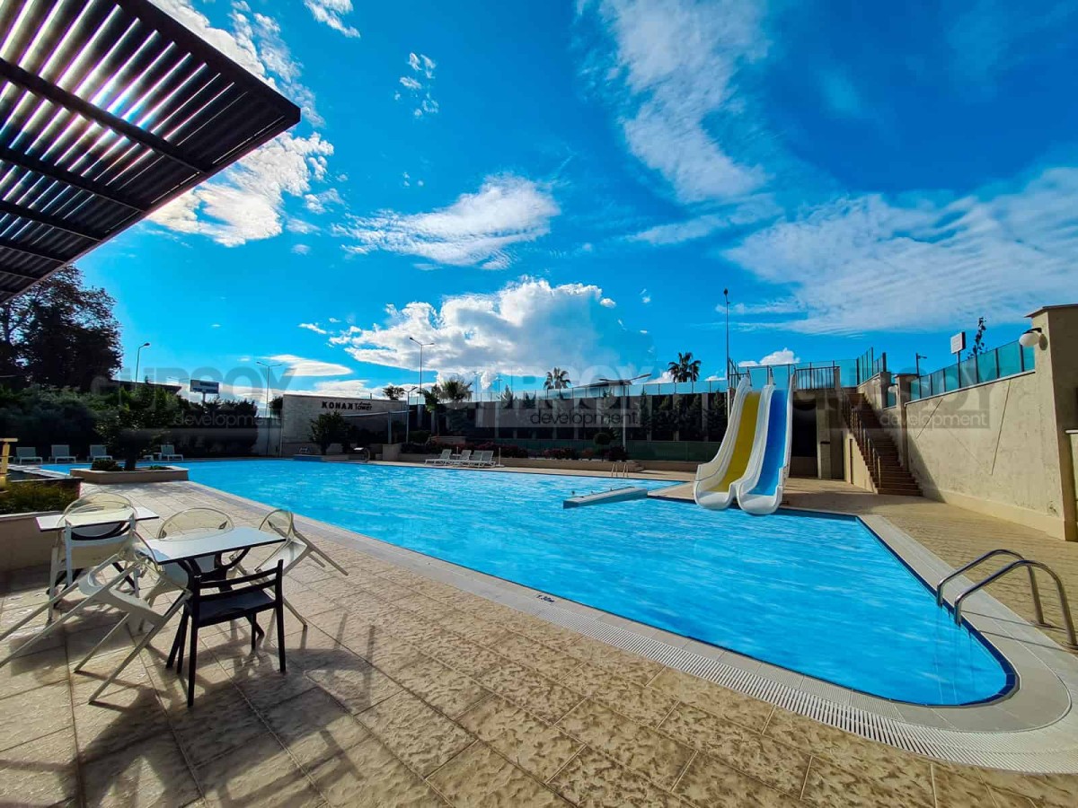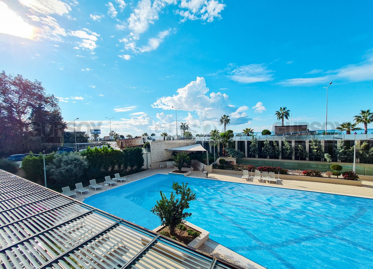 Площадь квартиры - 65 м2. Квартира расположена на 1-м этаже 12-этажного жилого комплекса. Планировка 1+1 подразумевает наличие гостиной, спальни, ванной комнаты и балкона. Квартира продаётся c полным комплектом мебели, бытовой техникой и кондиционерами. Ванная комната оборудована современной сантехникой и душевой кабиной. Квартира выходит на южную сторону. С балкона открывается частичный вид на море, вид на бассейн и пёстрые пальмы.