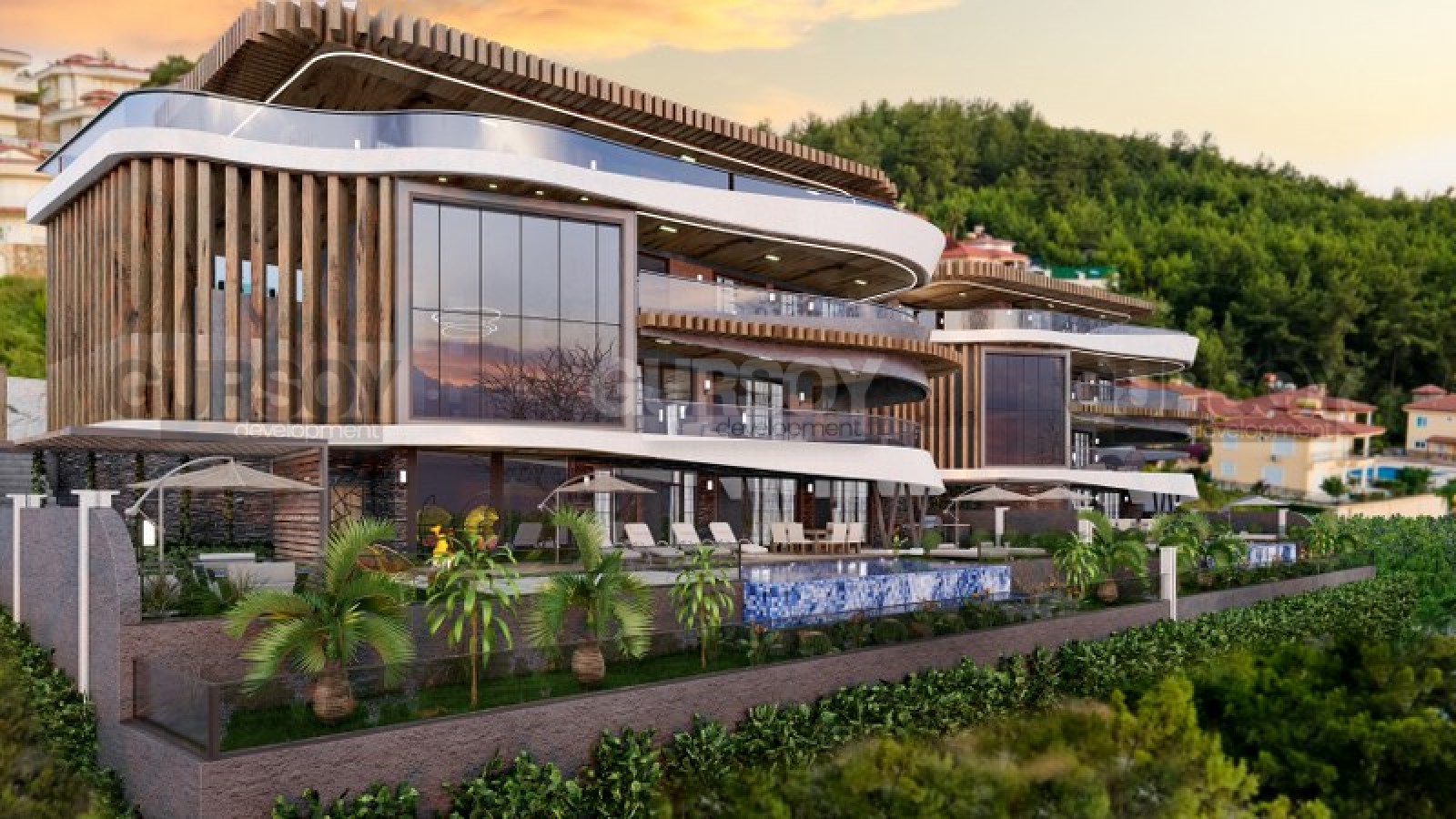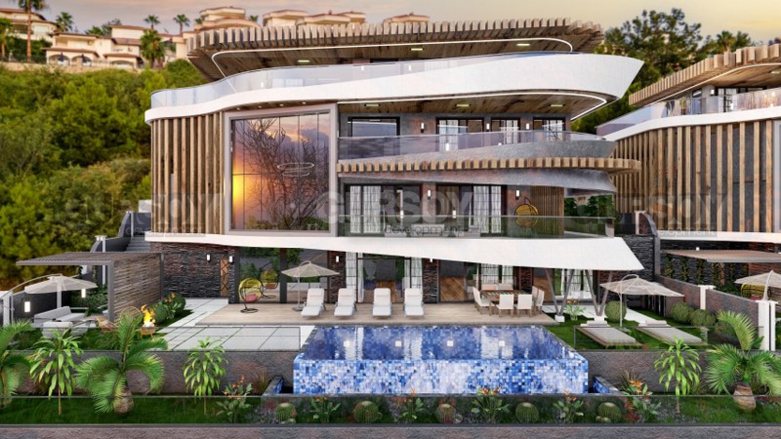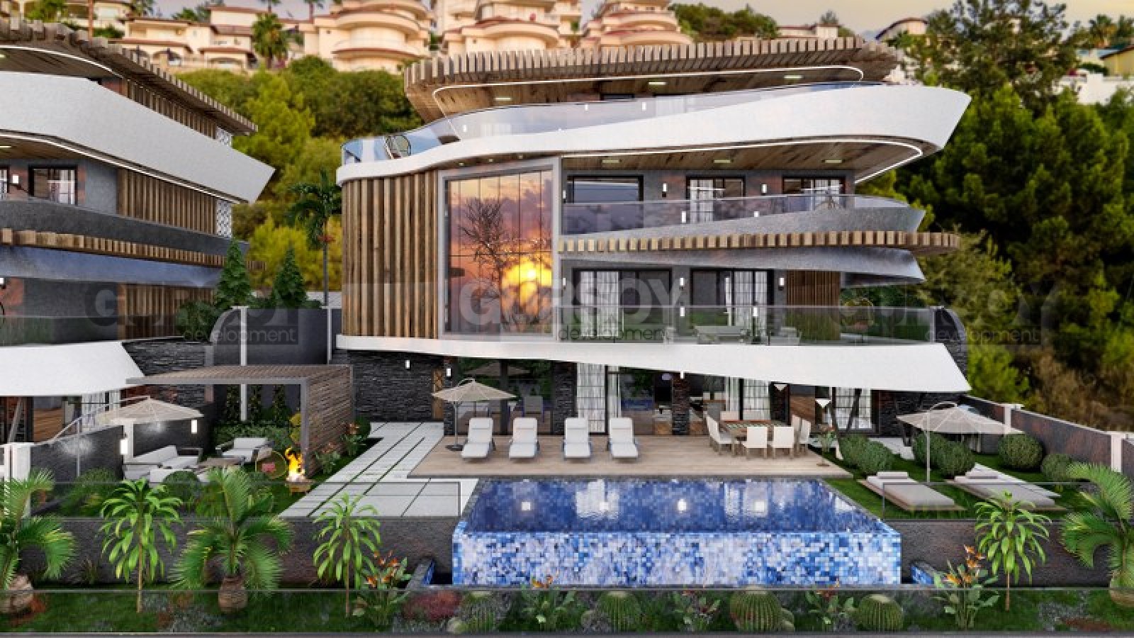 Виллы состоят из 4х этажей имеют планировку 5+1 от 900м2 и включают 5ть спальных комнат, гостиную с кухней, также предусмотрены ванные комнаты, прачечные и гардеробные, также включена внутренняя инфраструктура: сауна, фитнес, кинотеатр и тд