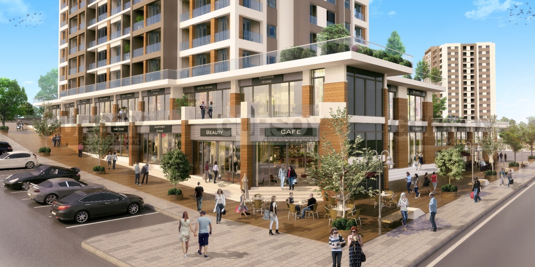 Социальные услуги включают в себя бассейны, дорожки для прогулок и пробежек, кафе, магазины, фитнес-центр и SPA с турецкой баней и сауной. Кроме того, предусмотрена частная парковка и круглосуточная охрана для комфорта и безопасности жителей.