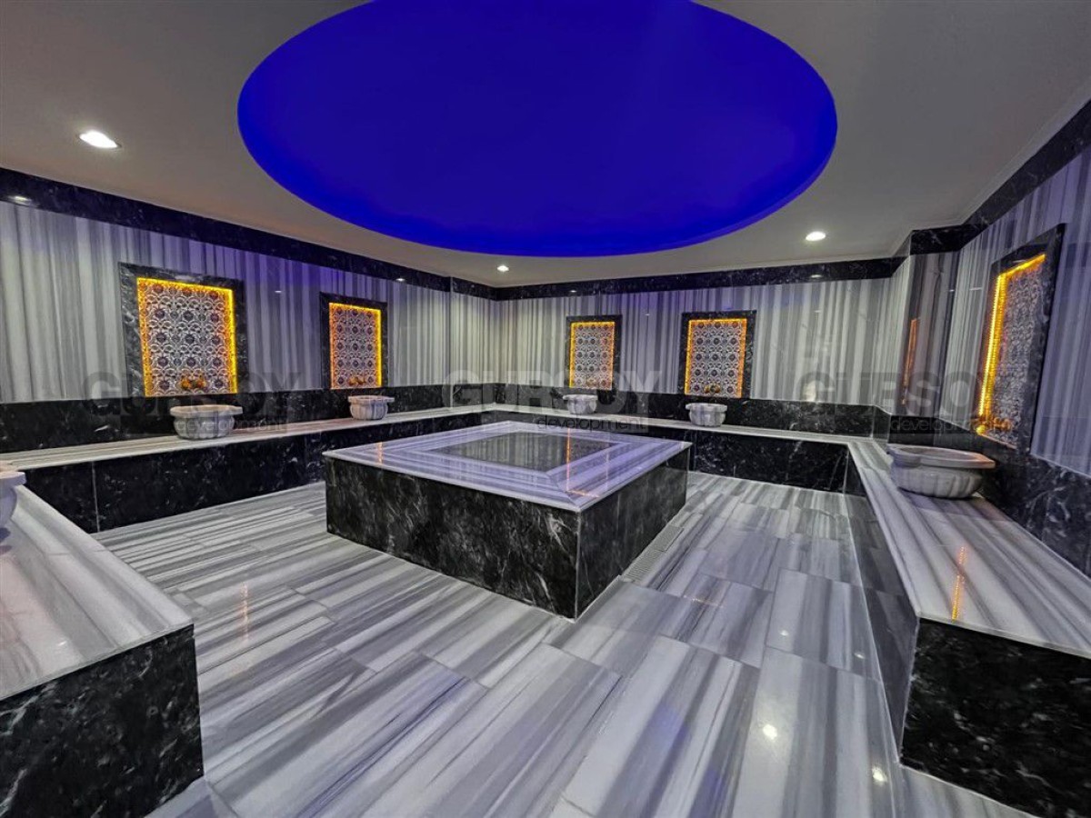 открытый и крытый бассейны, фитнес‑зал, турецкая баня (хамам), сауна, паровая комната, детская игровая площадка, снэк-бар, лобби, ресепшн, бар, мини-баскетбольная площадка, настольный теннис, зона барбекю, открытая парковка и круглосуточная охрана. Собственный сад квартиры будет находиться под видеонаблюдением, что гарантирует дополнительную безопасность.