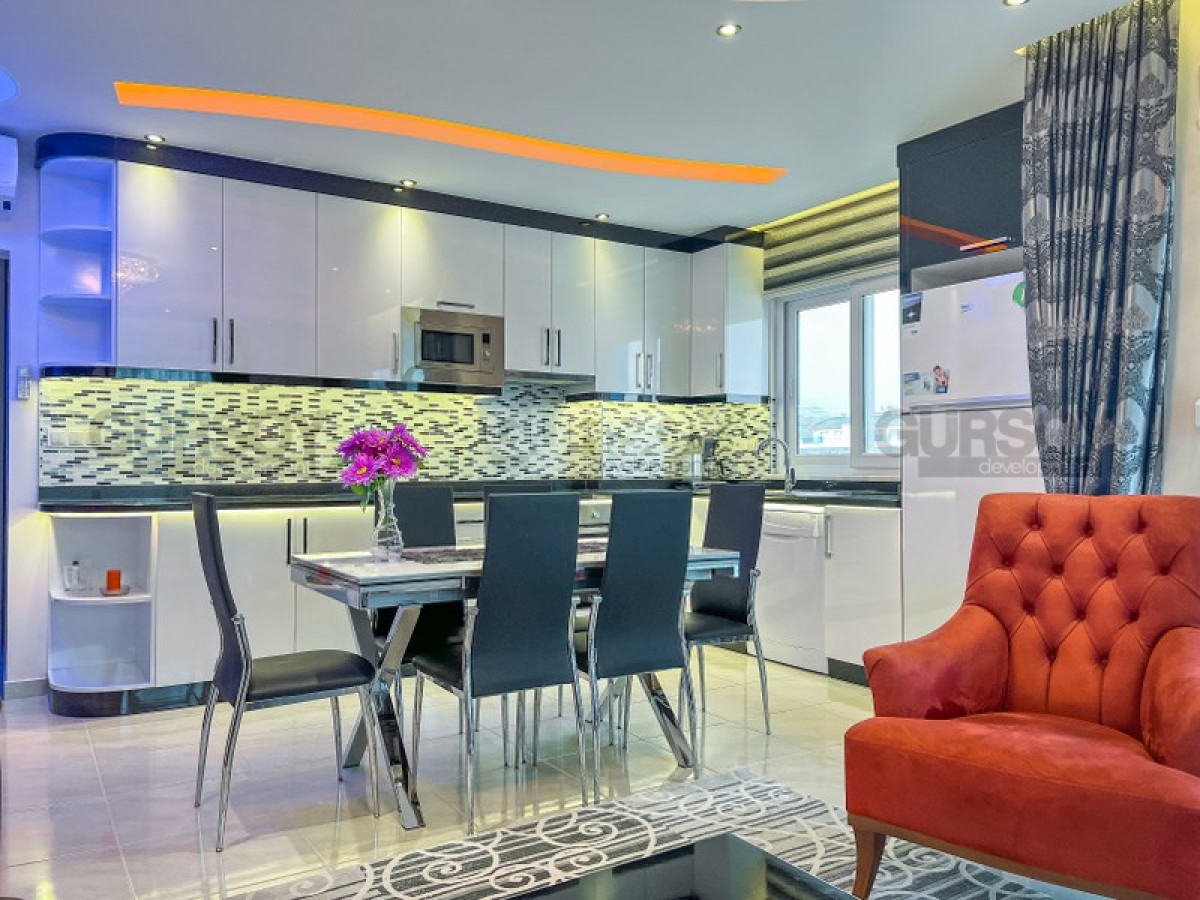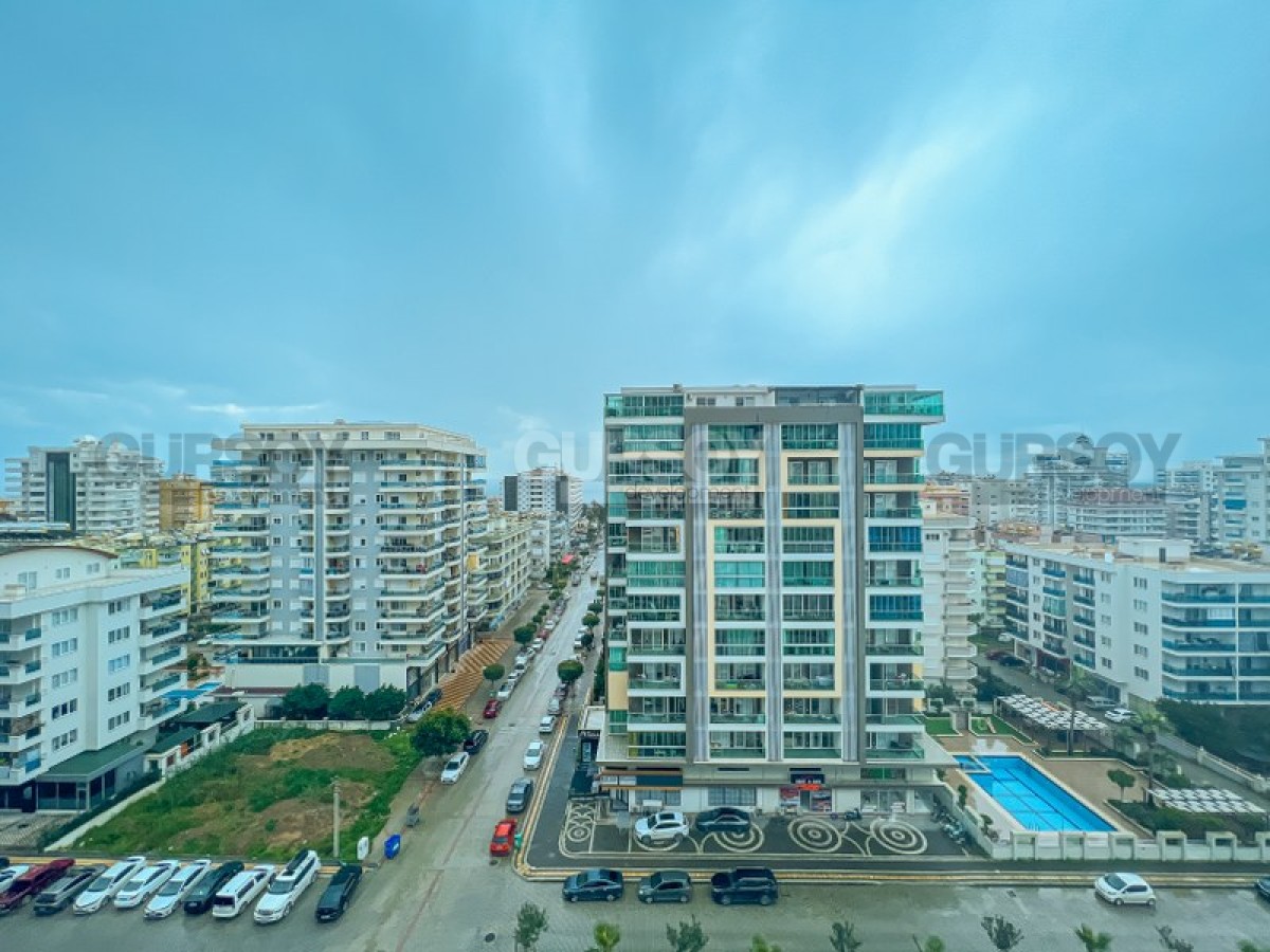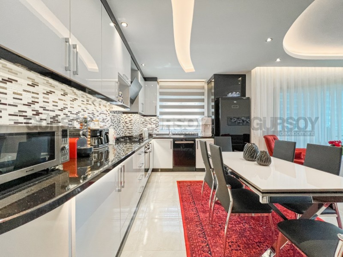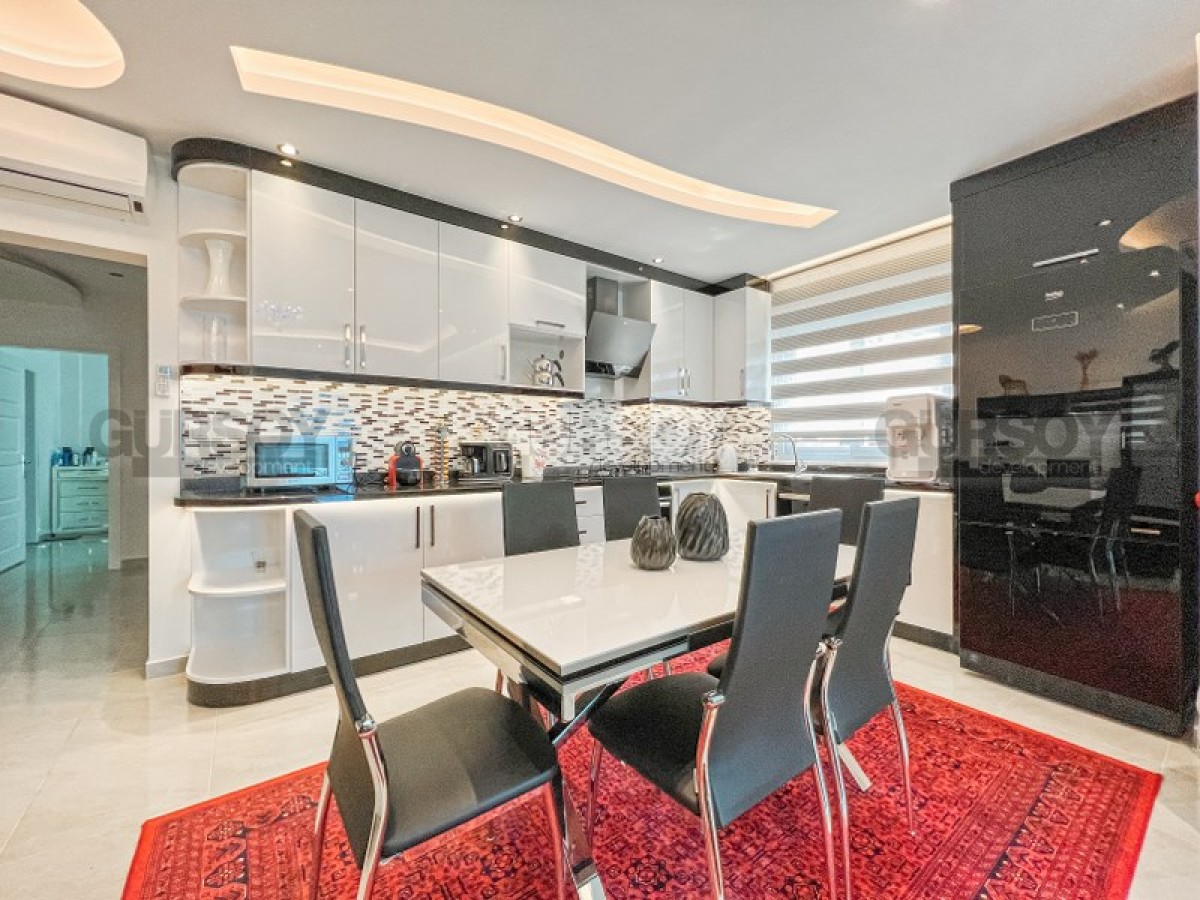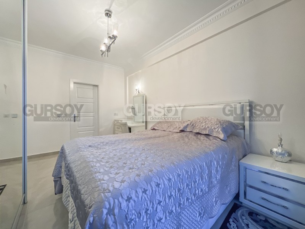 Махмутлар - современный район Аланьи, который отлично подходит как для проведения летних отпусков, так и для проживания круглый год. Тут хорошо развита инфраструктура, есть крупные торговые комплексы, кафе, рестораны, школы, детские сады, поликлиники, салоны красоты, отделения банков и связи. В нескольких минутах ходьбы от центра этого района выставлена на продажу просторная квартира 2+1, площадью 119 м2, с американской кухней, гостиной, двумя спальнями, двумя санузлами и большим застекленным балконом, с панорамным видом на город. Квартира - комфортабельная и современная, укомплектованная стильной мебелью и новейшей бытовой техникой. В центре гостиной организована зона отдыха, с большим угловым диваном, оригинальным журнальным столиком и тумбой. Кухня, с обеденным столом, оснащена холодильником, посудомоечной машиной и духовым шкафом. В уютных спальнях установлены мягкие кровати, тумбы, туалетный столик и гардеробные шкафы, а на балконе имеется практичная садовая мебель.