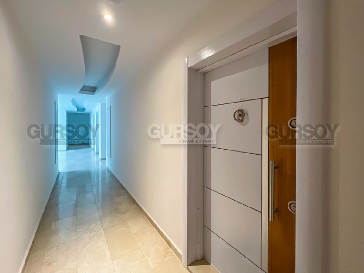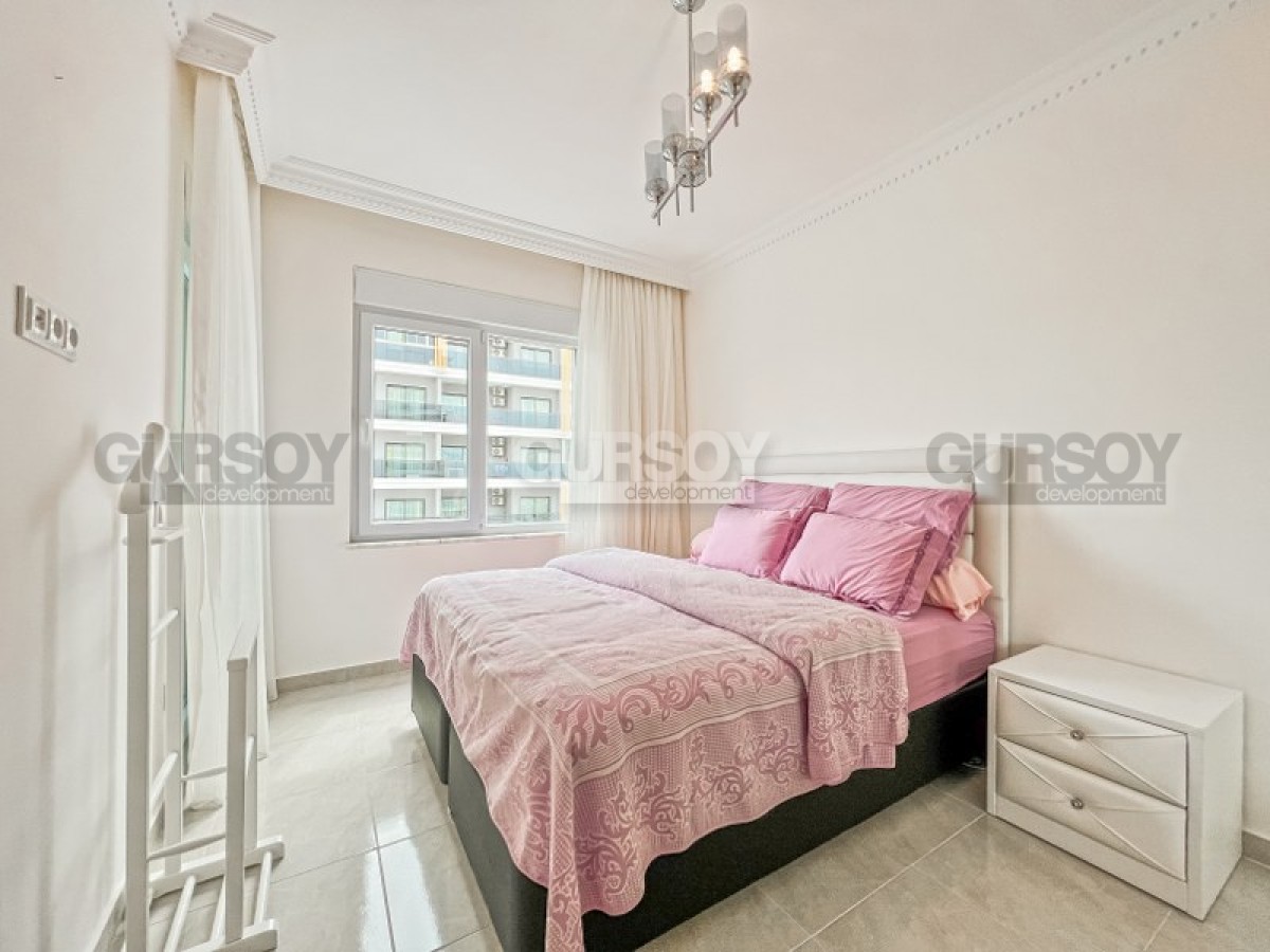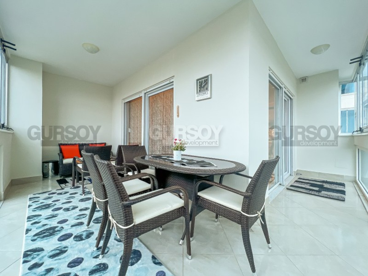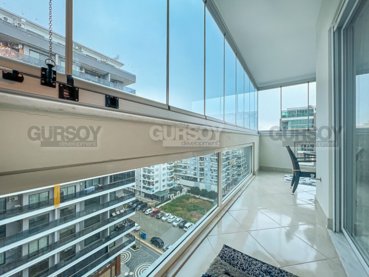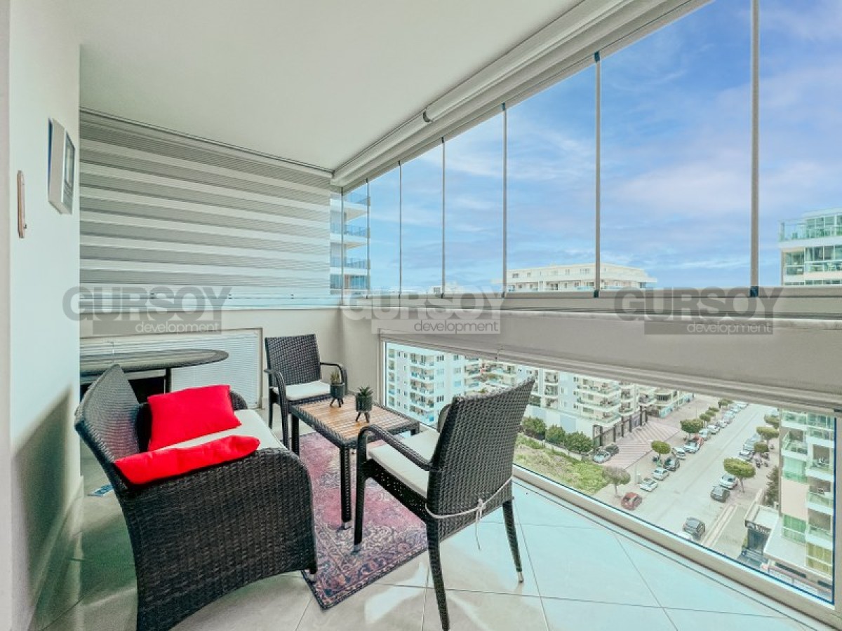 Махмутлар - современный район Аланьи, который отлично подходит как для проведения летних отпусков, так и для проживания круглый год. Тут хорошо развита инфраструктура, есть крупные торговые комплексы, кафе, рестораны, школы, детские сады, поликлиники, салоны красоты, отделения банков и связи. В нескольких минутах ходьбы от центра этого района выставлена на продажу просторная квартира 2+1, площадью 119 м2, с американской кухней, гостиной, двумя спальнями, двумя санузлами и большим застекленным балконом, с панорамным видом на город. Квартира - комфортабельная и современная, укомплектованная стильной мебелью и новейшей бытовой техникой. В центре гостиной организована зона отдыха, с большим угловым диваном, оригинальным журнальным столиком и тумбой. Кухня, с обеденным столом, оснащена холодильником, посудомоечной машиной и духовым шкафом. В уютных спальнях установлены мягкие кровати, тумбы, туалетный столик и гардеробные шкафы, а на балконе имеется практичная садовая мебель.