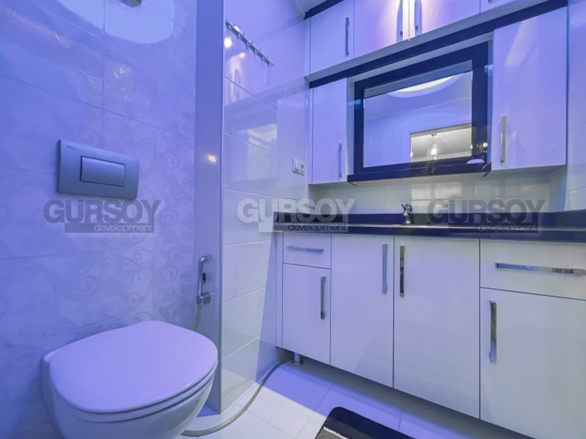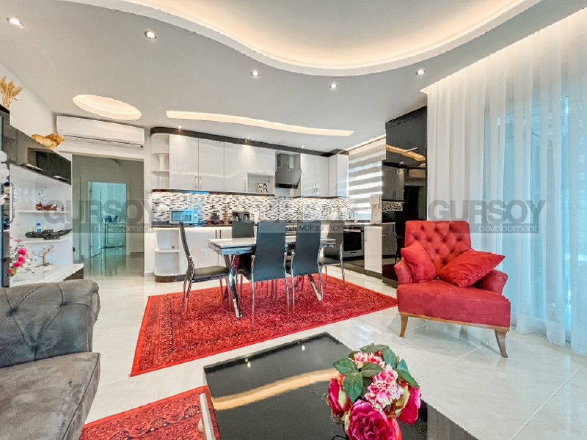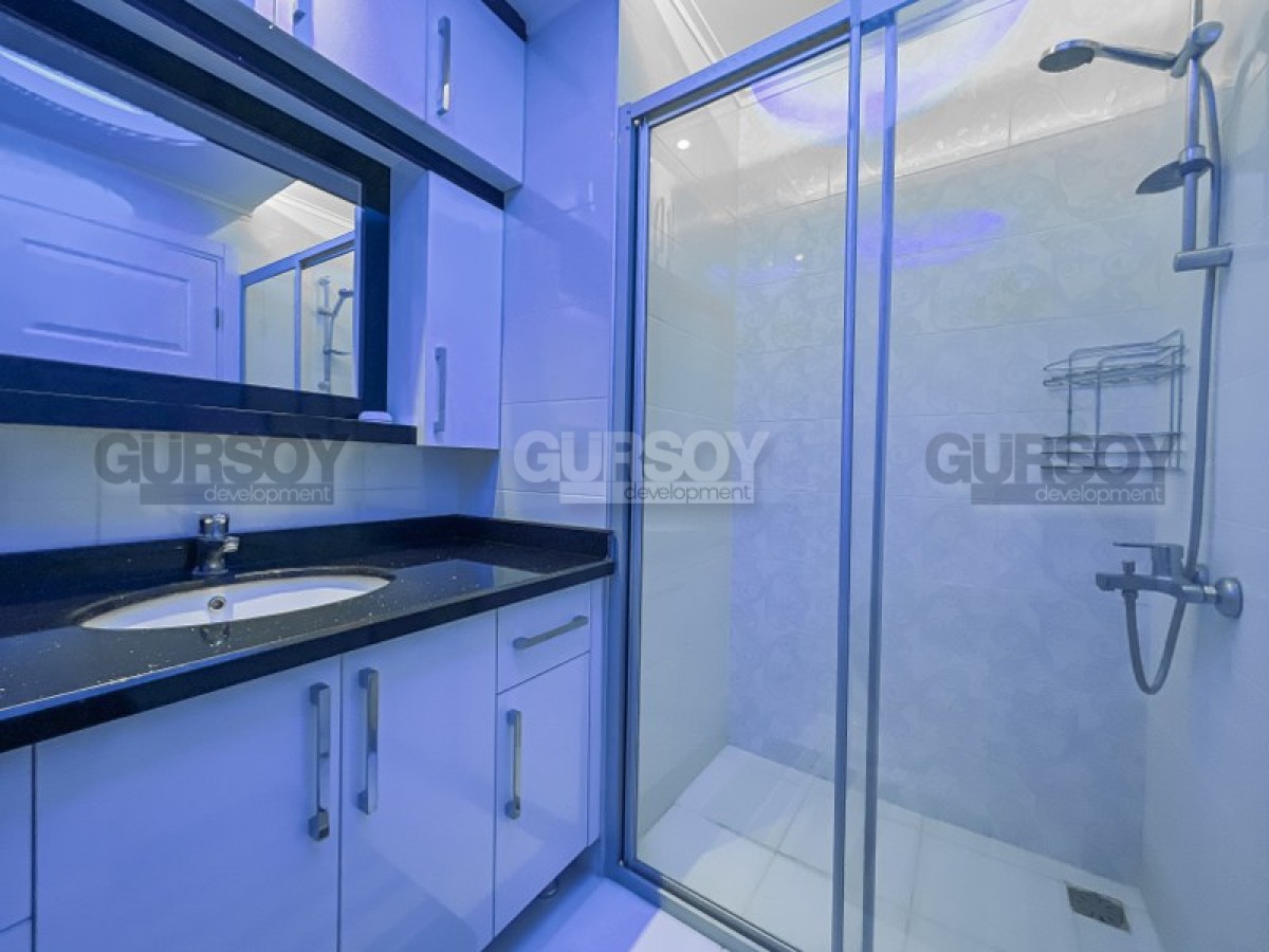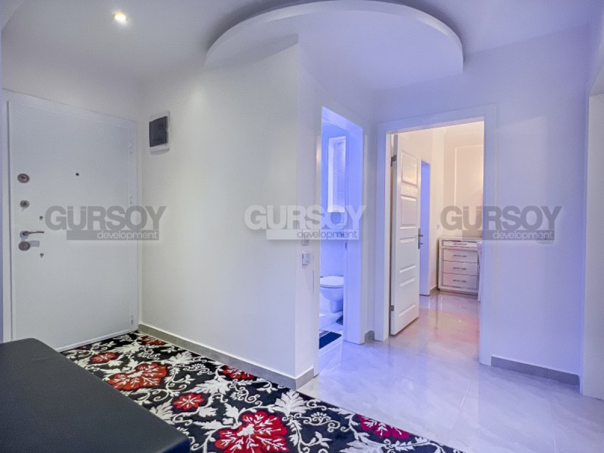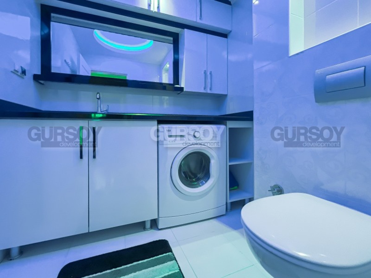 Махмутлар - современный район Аланьи, который отлично подходит как для проведения летних отпусков, так и для проживания круглый год. Тут хорошо развита инфраструктура, есть крупные торговые комплексы, кафе, рестораны, школы, детские сады, поликлиники, салоны красоты, отделения банков и связи. В нескольких минутах ходьбы от центра этого района выставлена на продажу просторная квартира 2+1, площадью 119 м2, с американской кухней, гостиной, двумя спальнями, двумя санузлами и большим застекленным балконом, с панорамным видом на город. Квартира - комфортабельная и современная, укомплектованная стильной мебелью и новейшей бытовой техникой. В центре гостиной организована зона отдыха, с большим угловым диваном, оригинальным журнальным столиком и тумбой. Кухня, с обеденным столом, оснащена холодильником, посудомоечной машиной и духовым шкафом. В уютных спальнях установлены мягкие кровати, тумбы, туалетный столик и гардеробные шкафы, а на балконе имеется практичная садовая мебель.
