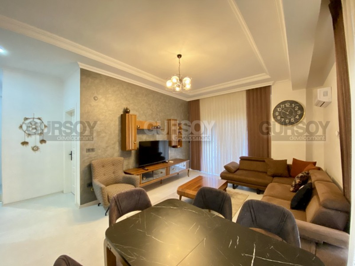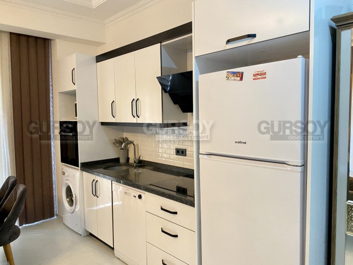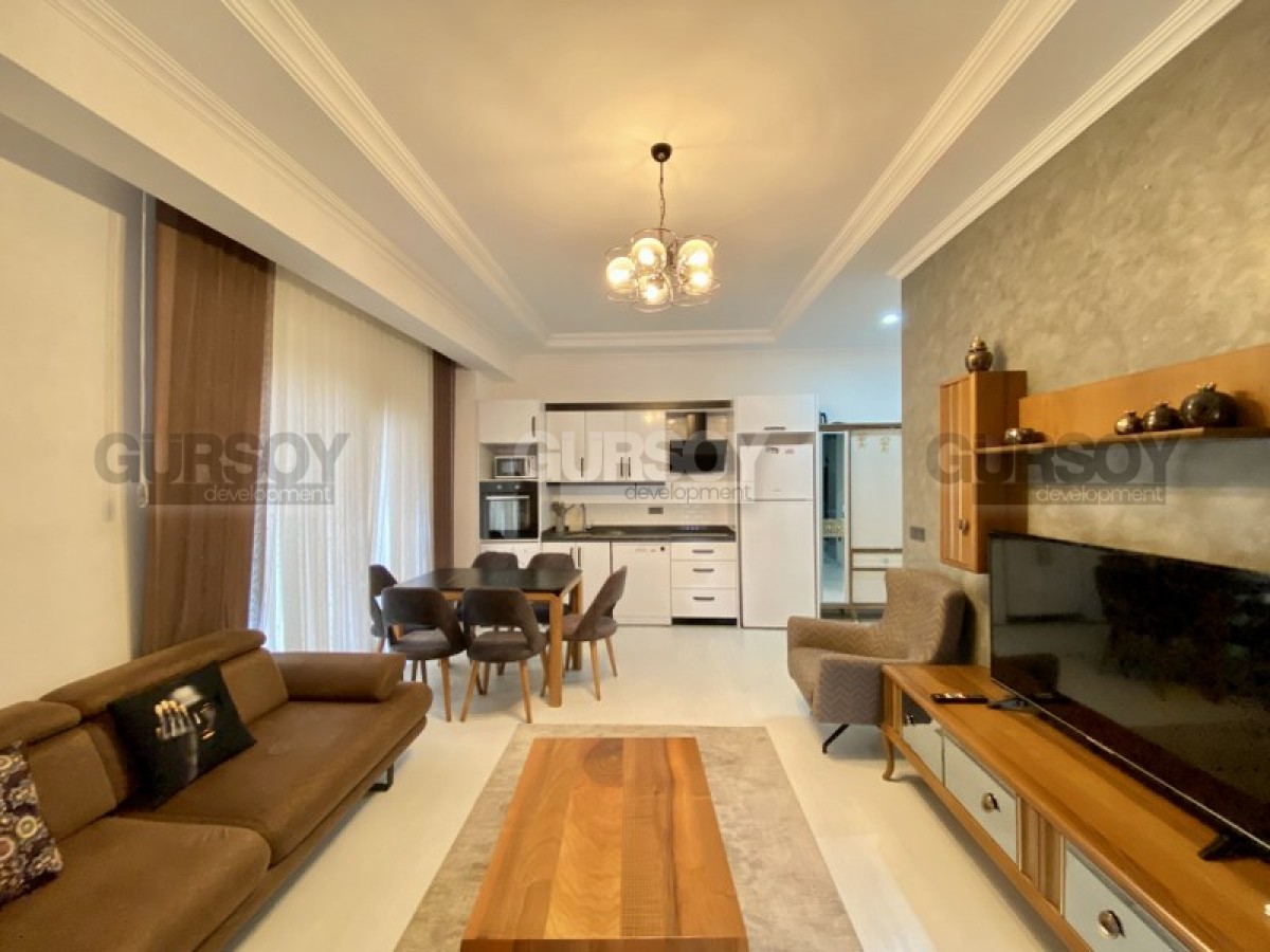 Портфолио нашей компании пополнила недорогая новая квартира, с полным набором мебели и бытовой техники, расположенная на 1-м этаже в жилом комплексе, построенном в 2022 году, в центре популярного района Аланьи - Махмутлар. Небольшая, площадью 50 м2, она имеет в планировке совмещенную с кухней гостиную, спальню, санузел и застекленный балкон, с видом на город. Квартира - светлая и современная, с теплыми оттенками и деревом в интерьере. В гостиной установлены: большой угловой диван, кресло, журнальный столик и гарнитур; в спальне - мягкая кровать, тумбы и гардеробный шкаф. Кухня оснащена холодильником, стиральной и посудомоечной машинами, сенсорной варочной поверхностью и духовым шкафом, в санузле установлена современная душевая кабина, а на балконе - удобная садовая мебель.