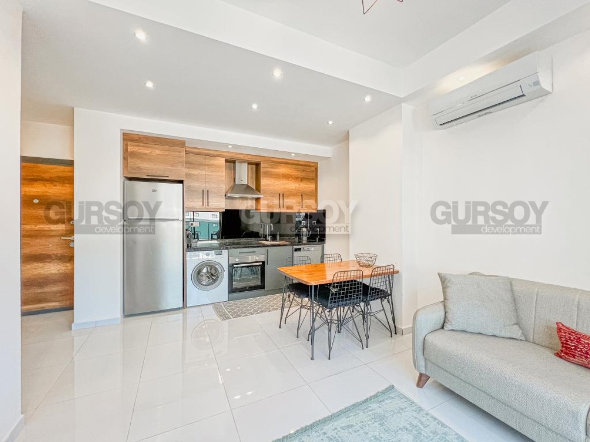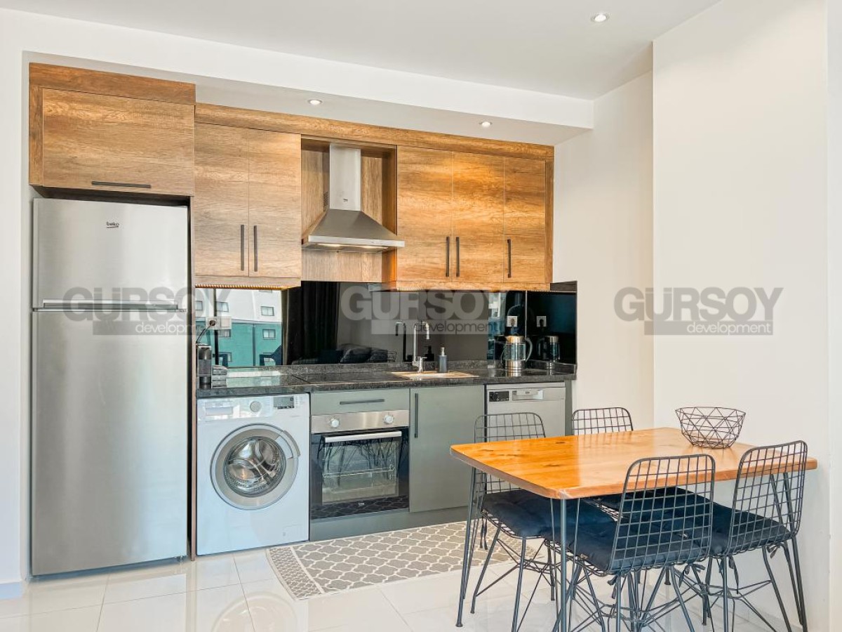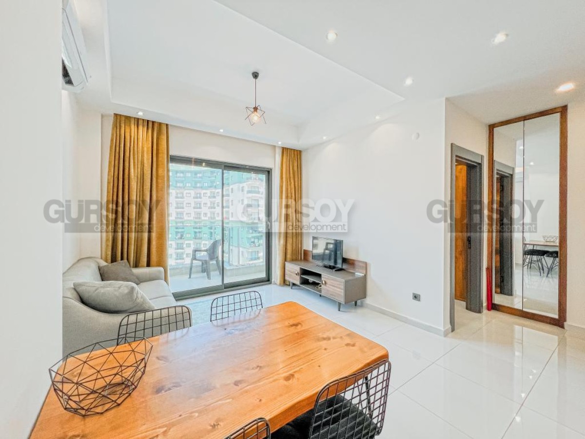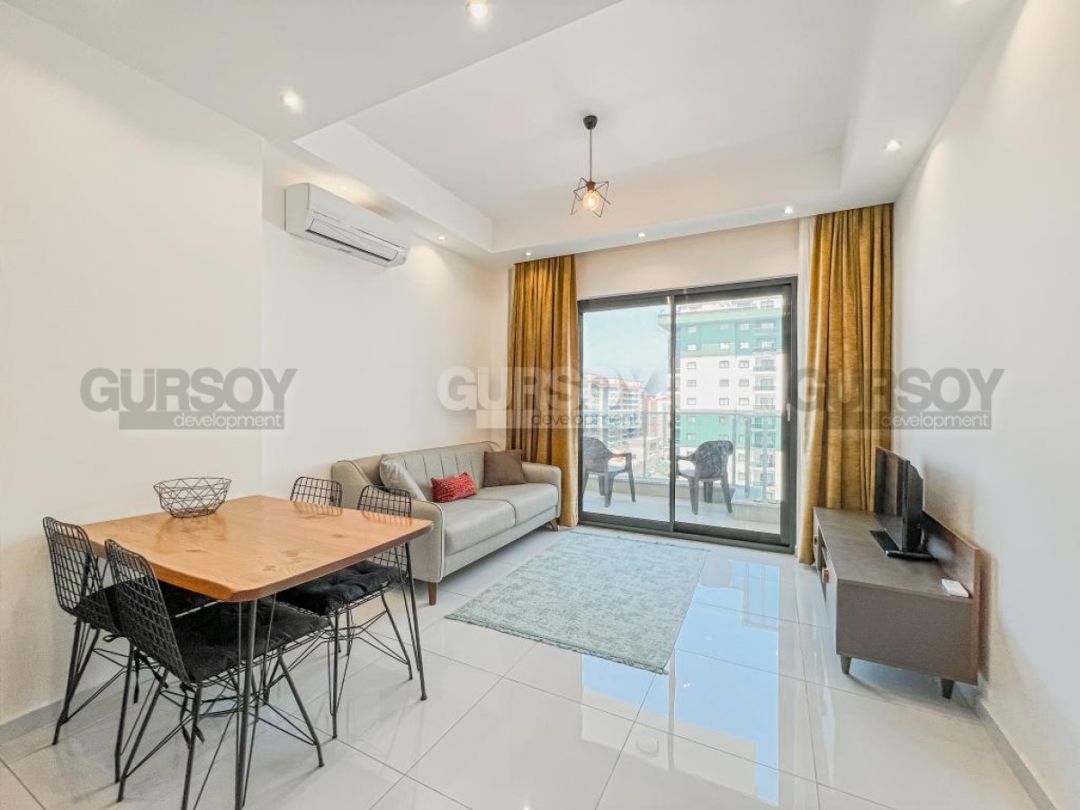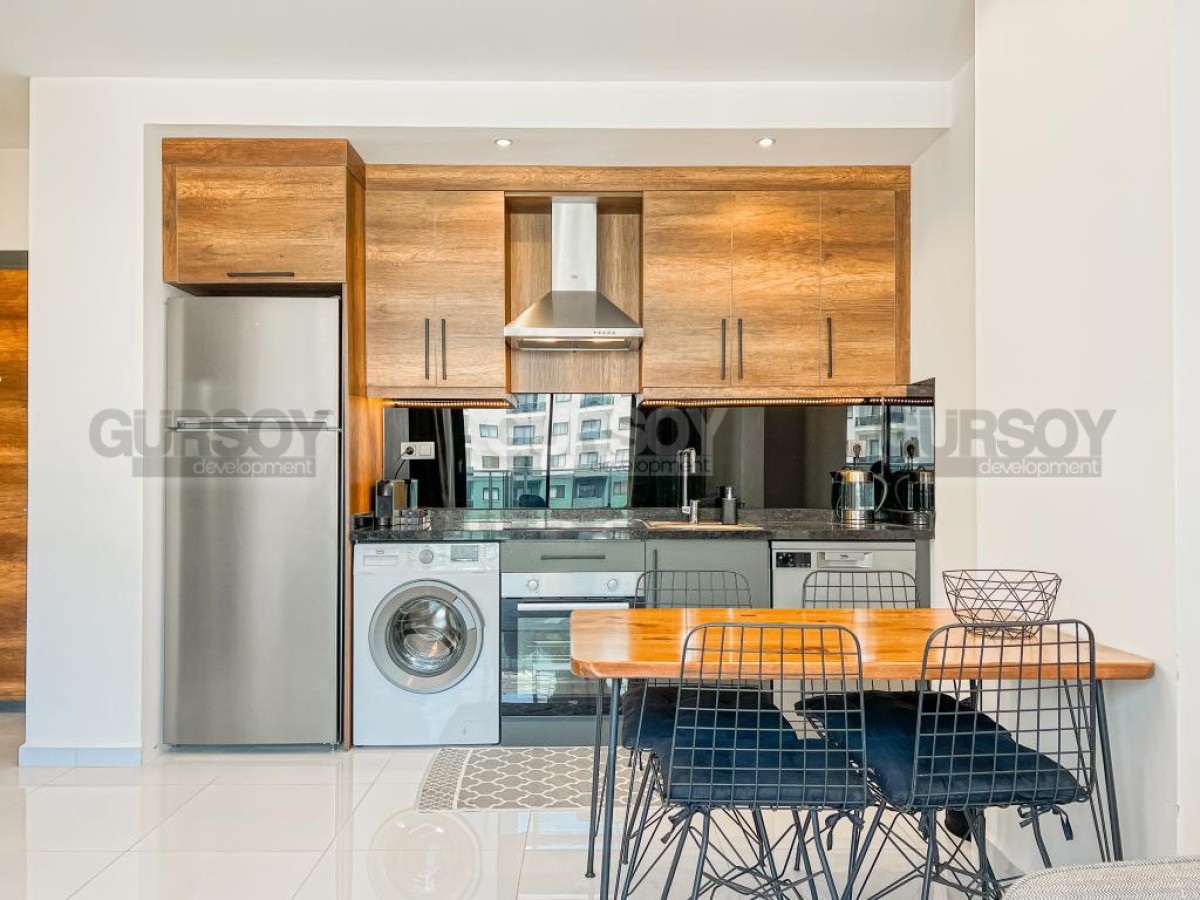 Мечтаете о комфортабельной квартире на берегу Средиземного моря? В нашем портфолио как раз появился отличный вариант - новые апартаменты с мебелью и бытовой техникой в нескольких минутах ходьбы от пляжа и центра современного района Аланьи - Махмутлар. Небольшая квартира, на площади 55 м2, состоит из кухни открытого типа, совмещенной с салоном, спальни, оснащенного душевой кабиной санузла и открытого балкона, с видом на внутренний двор комплекса и бассейн. Квартира - светлая и уютная, в интерьере гармонично сочетаются теплые оттенки и дерево. Гостиная укомплектована мягким диваном, тумбой и обеденным столом, спальня - большой кроватью и гардеробным шкафом. Практичная стильная кухня оснащена холодильником, стиральной и посудомоечной машинами, сенсорной варочной поверхностью и духовым шкафом, а на балконе установлена компактная садовая мебель.
