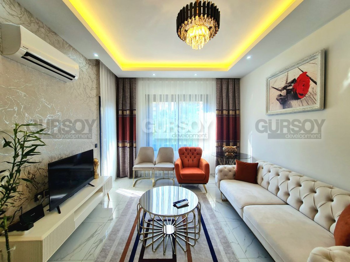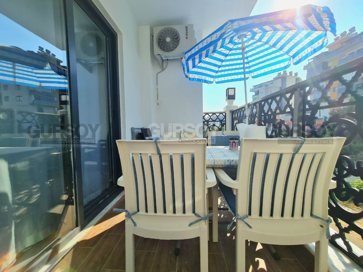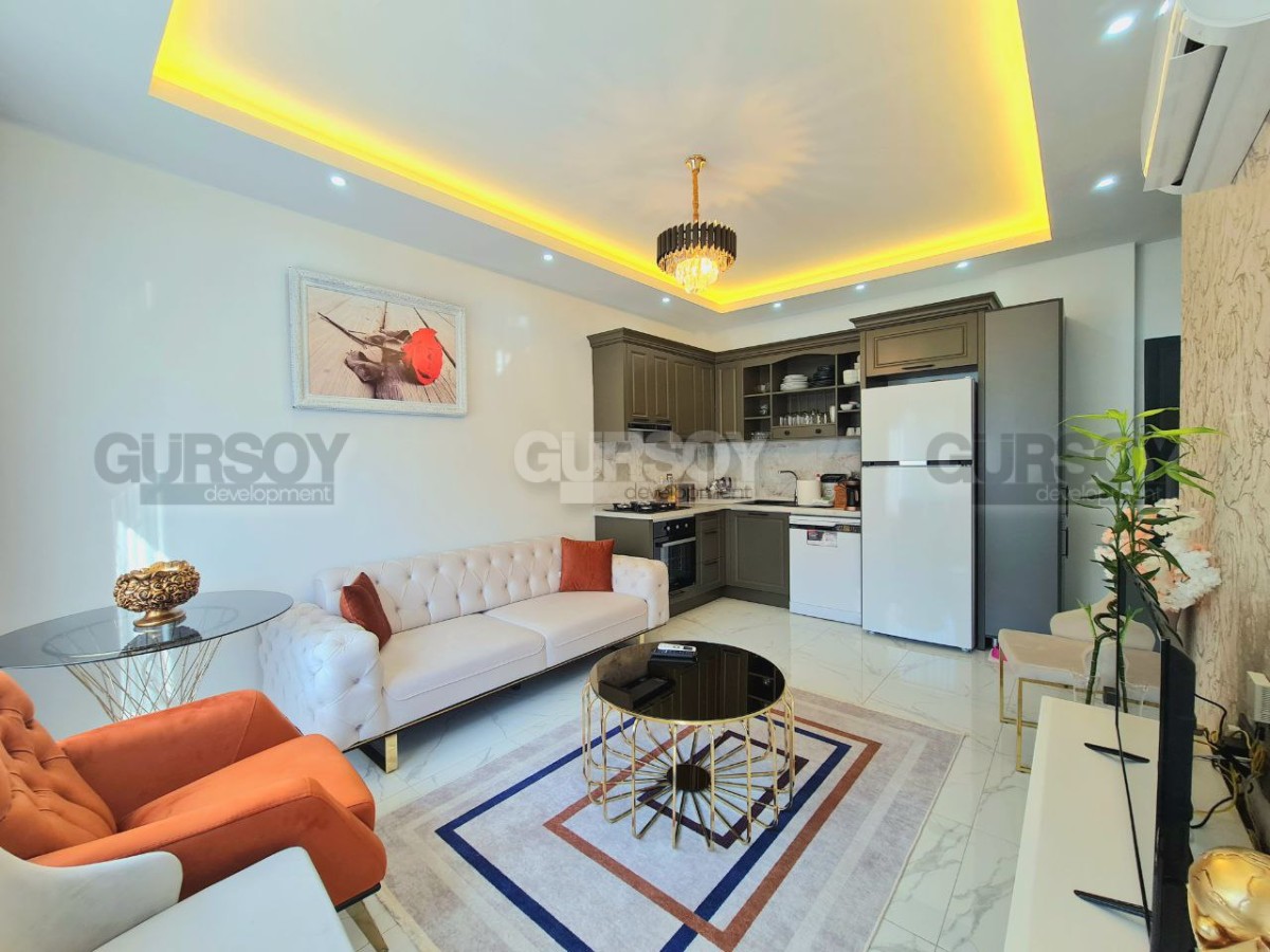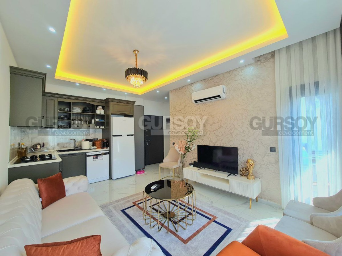 В новом районе Аланьи - Чиплаклы в 2023 году завершилось строительство симпатичной 6-этажной резиденции, с ухоженной территорией, бассейном и садом. На 2-м ее этаже в настоящее время выставлена на продажу 1+1, общей площадью 50 м2, с совмещенной с кухней гостиной, спальней, санузлом и открытым балконом. В квартире сделан хороший ремонт, установлена современная мебель и качественная бытовая техника. Светлая гостиная укомплектована комфортабельным диваном, креслом, оригинальным журнальным столиком, тумбой и компактным столом, с мягкими стульями. Стильный кухонный уголок оснащен холодильником, посудомоечной машиной и газовой плитой. В спальне имеются: большая кровать, тумбы и гардеробный шкаф, в санузле установлены душевая кабина и стиральная машина, а на балконе - удобная садовая мебель.