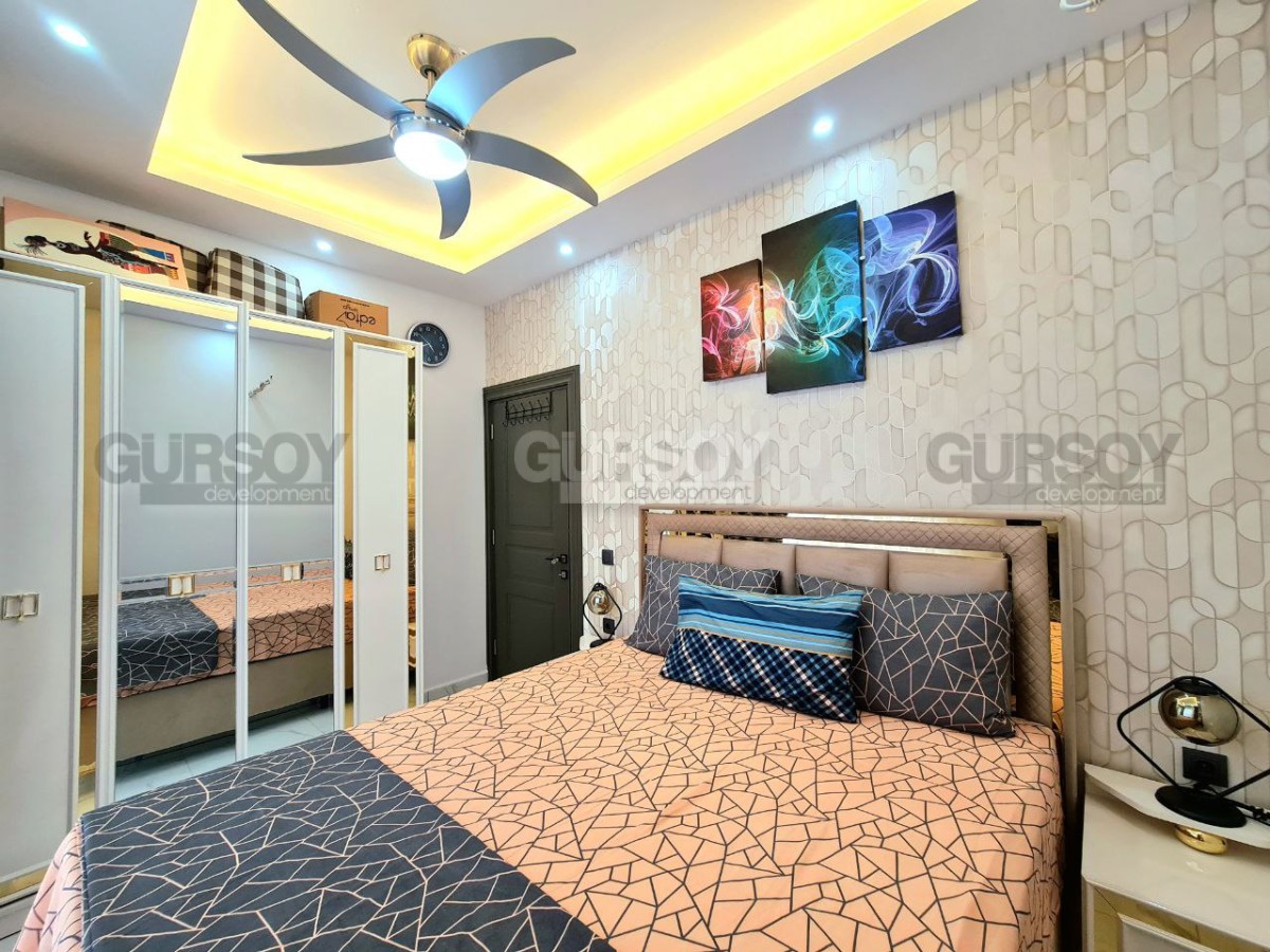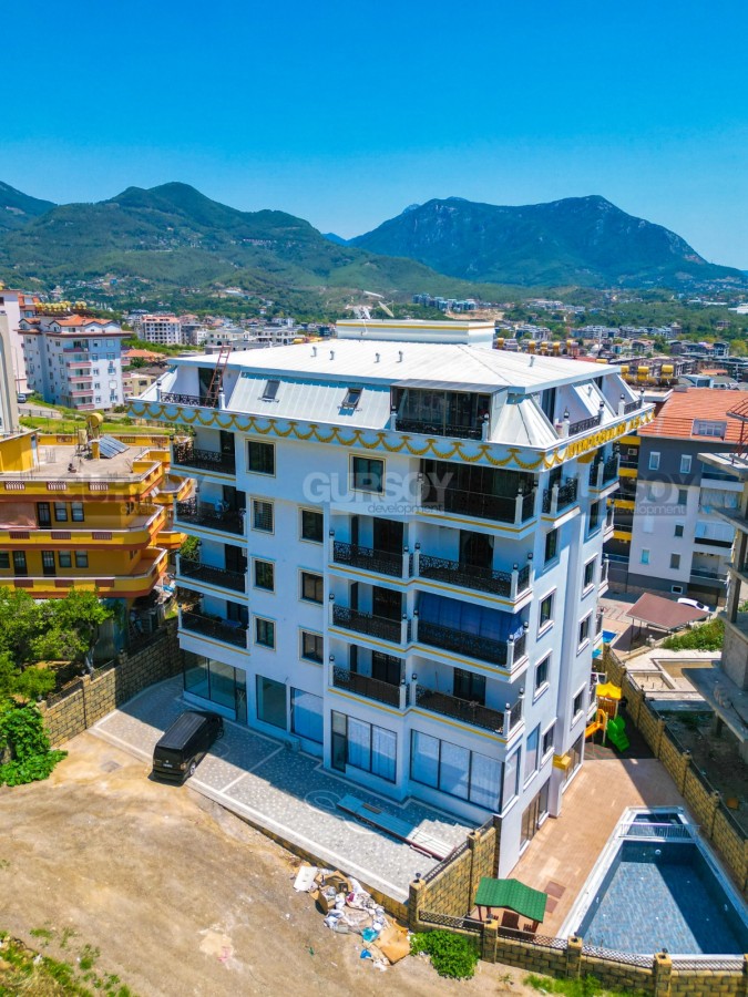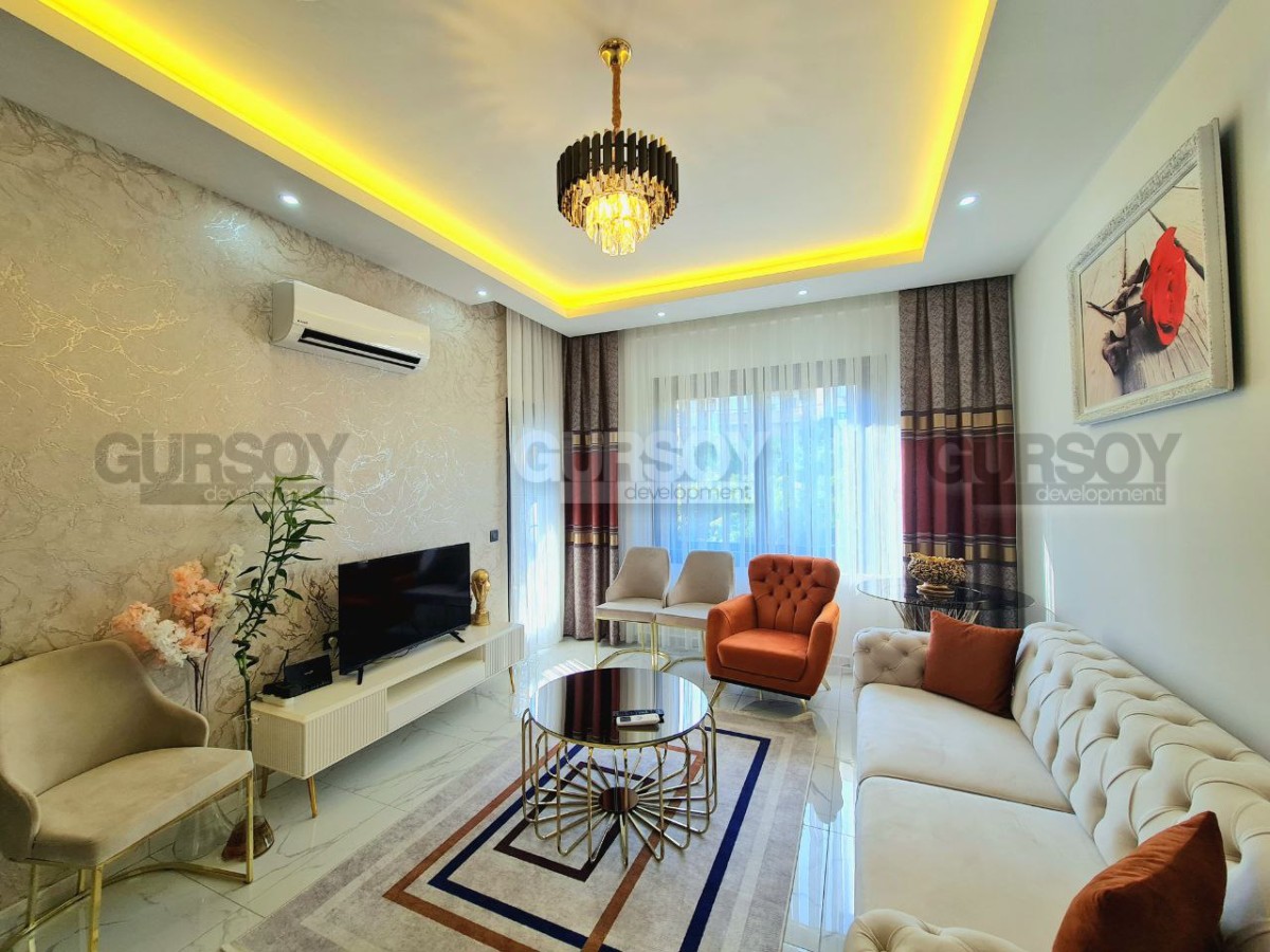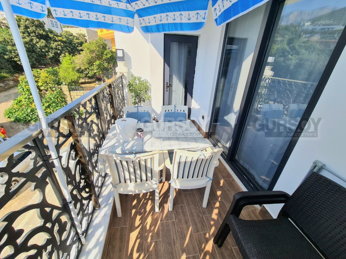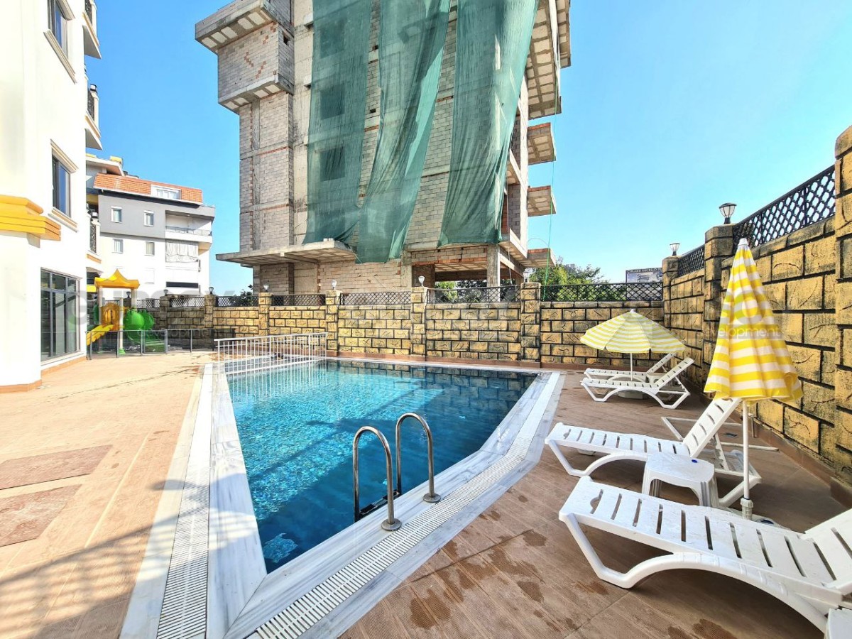 В новом районе Аланьи - Чиплаклы в 2023 году завершилось строительство симпатичной 6-этажной резиденции, с ухоженной территорией, бассейном и садом. На 2-м ее этаже в настоящее время выставлена на продажу 1+1, общей площадью 50 м2, с совмещенной с кухней гостиной, спальней, санузлом и открытым балконом. В квартире сделан хороший ремонт, установлена современная мебель и качественная бытовая техника. Светлая гостиная укомплектована комфортабельным диваном, креслом, оригинальным журнальным столиком, тумбой и компактным столом, с мягкими стульями. Стильный кухонный уголок оснащен холодильником, посудомоечной машиной и газовой плитой. В спальне имеются: большая кровать, тумбы и гардеробный шкаф, в санузле установлены душевая кабина и стиральная машина, а на балконе - удобная садовая мебель.