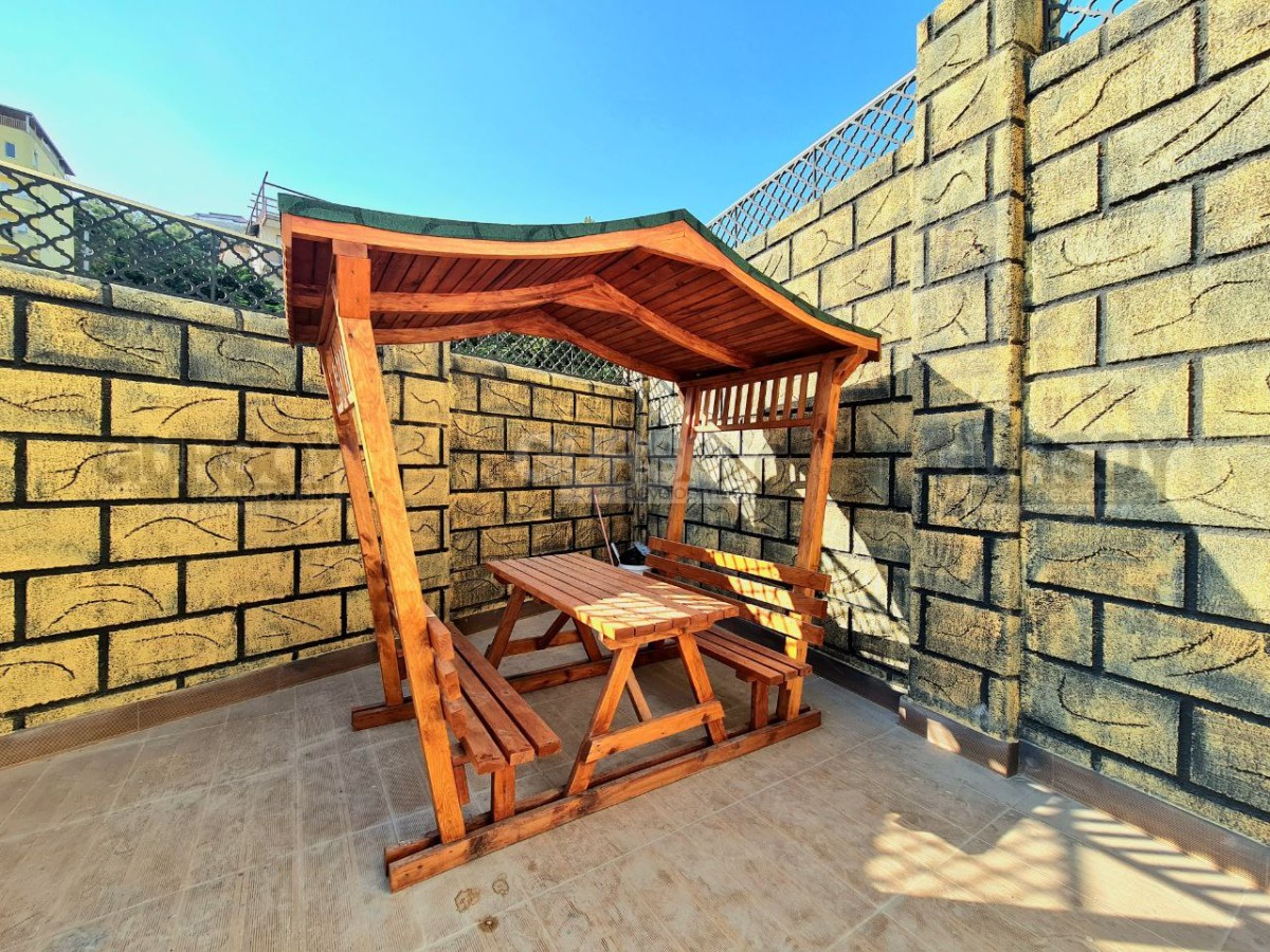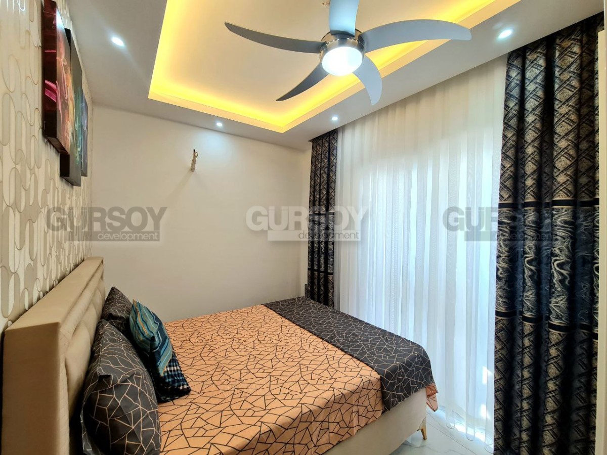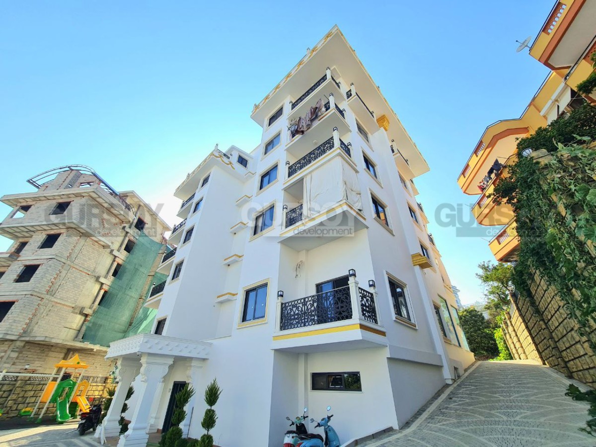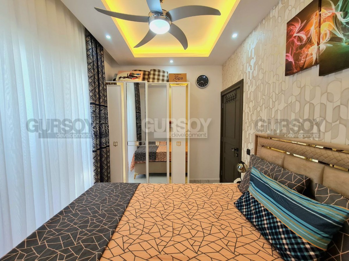В новом районе Аланьи - Чиплаклы в 2023 году завершилось строительство симпатичной 6-этажной резиденции, с ухоженной территорией, бассейном и садом. На 2-м ее этаже в настоящее время выставлена на продажу 1+1, общей площадью 50 м2, с совмещенной с кухней гостиной, спальней, санузлом и открытым балконом. В квартире сделан хороший ремонт, установлена современная мебель и качественная бытовая техника. Светлая гостиная укомплектована комфортабельным диваном, креслом, оригинальным журнальным столиком, тумбой и компактным столом, с мягкими стульями. Стильный кухонный уголок оснащен холодильником, посудомоечной машиной и газовой плитой. В спальне имеются: большая кровать, тумбы и гардеробный шкаф, в санузле установлены душевая кабина и стиральная машина, а на балконе - удобная садовая мебель.