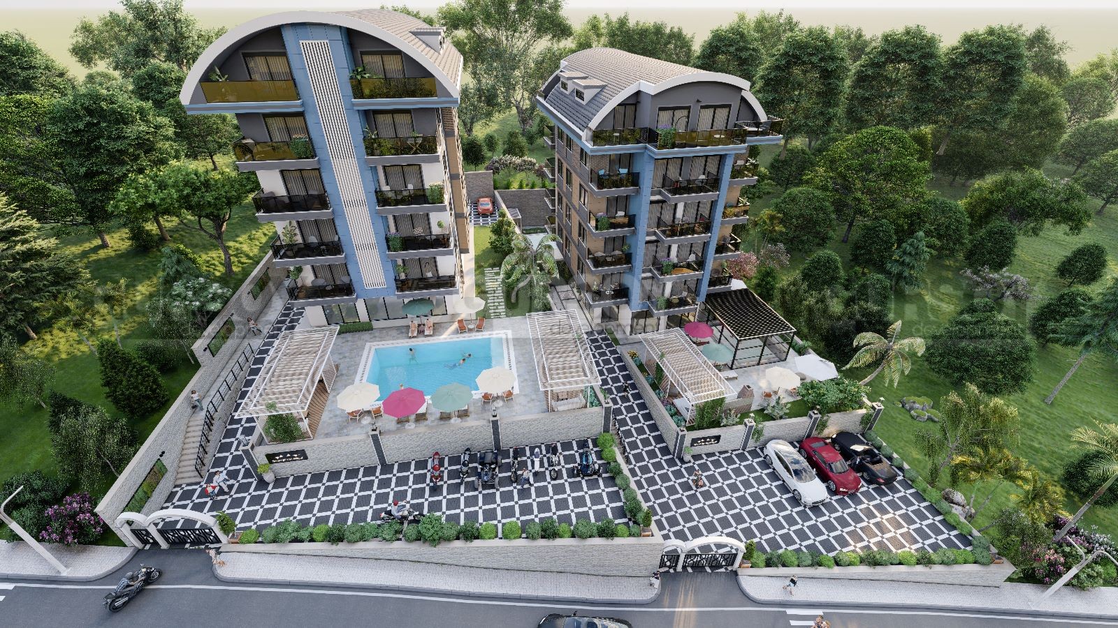 В комплексе имеются общие социальные зоны, предназначенные для удовлетворения различных потребностей и обеспечения комфорта жильцов. Здесь вы найдете открытый и крытый бассейны, хамам, сауну, фитнес-зал, игровые комнаты, площадку для барбекю, детскую игровую площадку, беседку, открытую парковку, лобби и круглосуточную охрану.