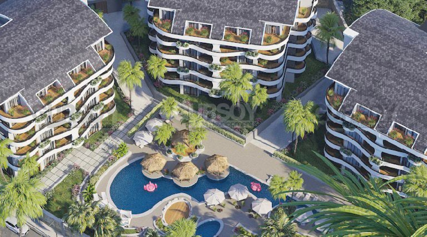 Комплекс также предлагает широкий спектр удобств, включая открытый и крытый бассейны, зоны для барбекю, беседки, лаундж-зоны, фитнес-зал, сауну, парную, душевые, джакузи, детскую комнату и крытый паркинг с оборудованными местами для электронной зарядки электрокаров.