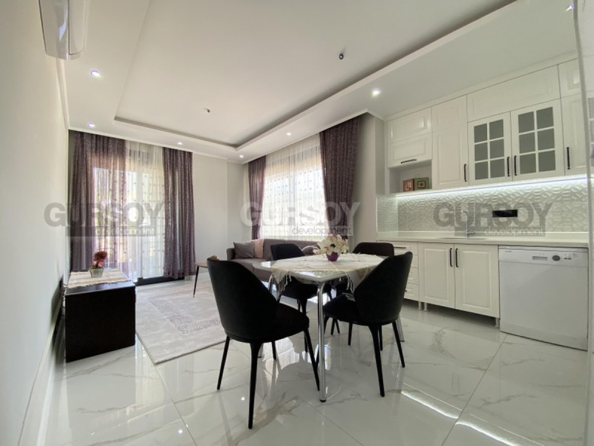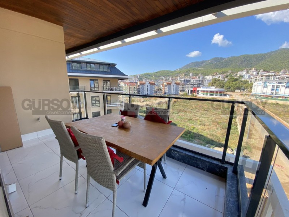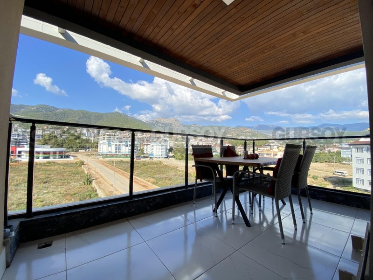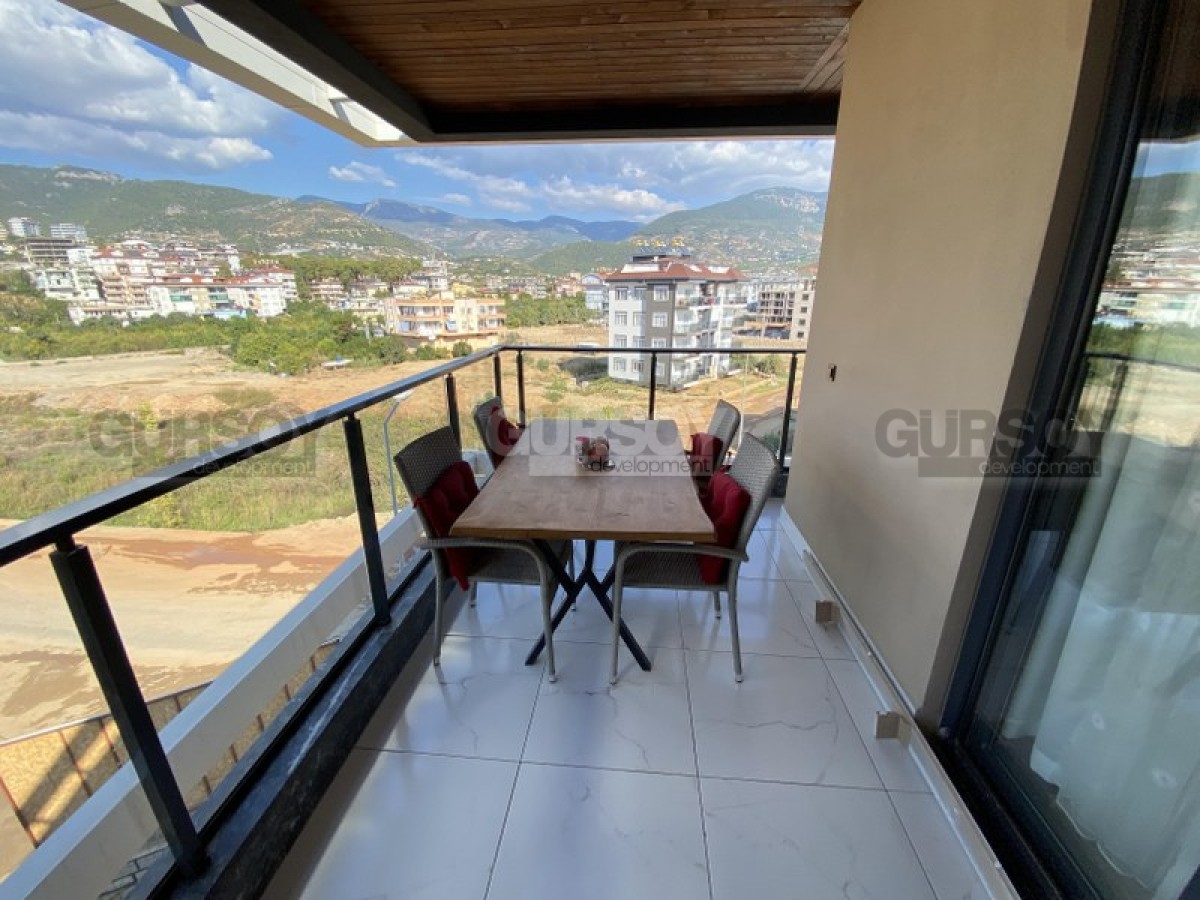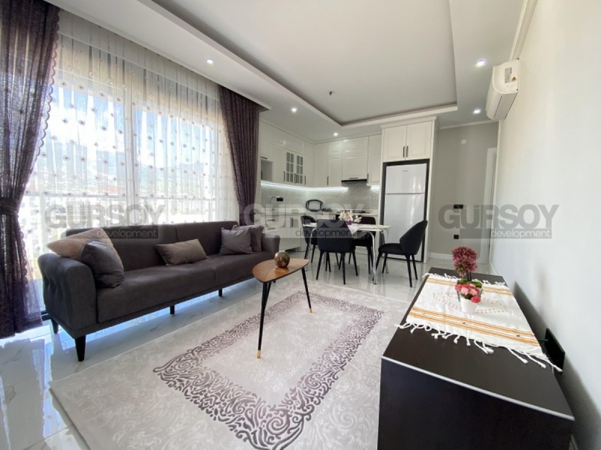 На продажу выставлена стильная квартира 1+1 в современном жилом комплексе в районе Оба. Площадь квартиры 60 м2, а планировка 1+1 подразумевает наличие гостиной, совмещённой с кухней, спальни, ванной комнаты и балкона. Квартира продаётся в полной меблировке, с установленной бытовой техникой, кондиционерами и точечным освещением. Ванная комната оборудована душевой кабиной и сантехникой, есть стиральная машина. Квартира расположена на 4-м этаже 5-этажного жилого комплекса 2022 года постройки. С балкона открывается восхитительный вид на Таврские горы.