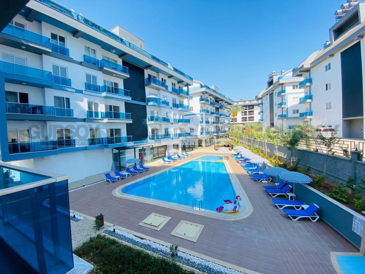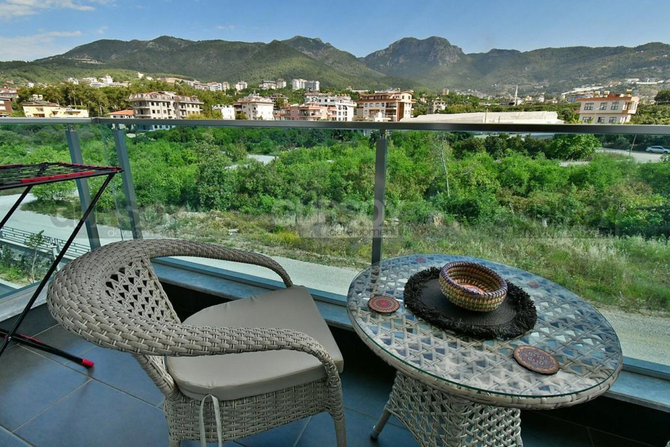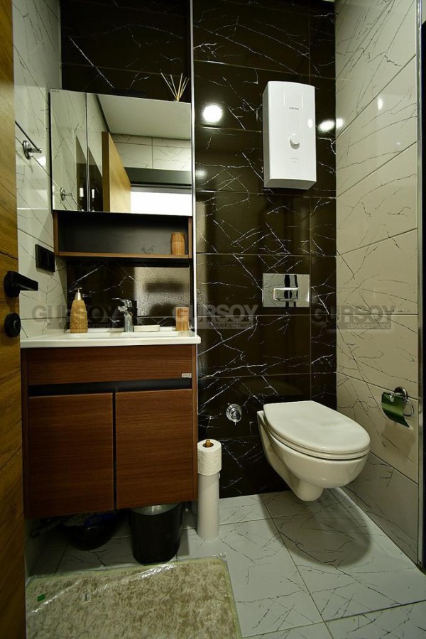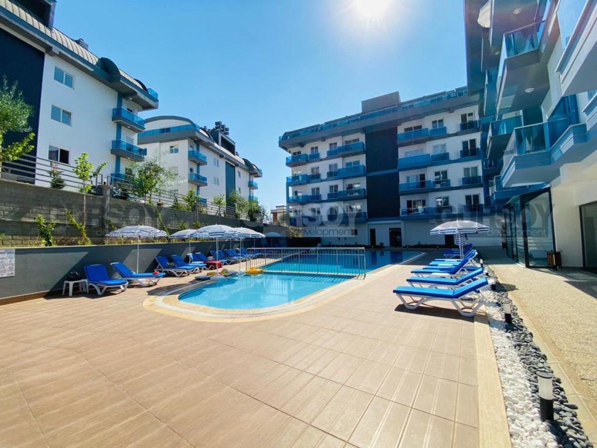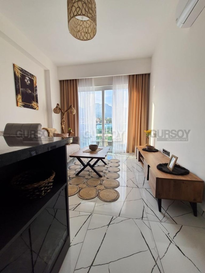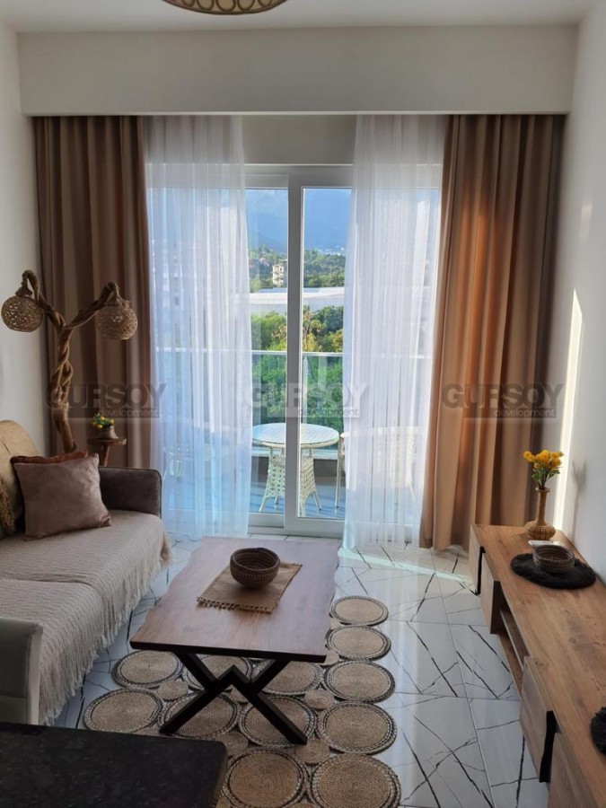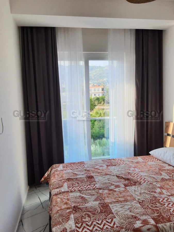 В 2023 году в живописной местности, в новом квартале района Оба завершилось строительство современного жилого комплекса, с просторной ухоженной территорией и развитой внутренней инфраструктурой. На 3-м этаже в одном из его блоков выставлена на продажу небольшая квартира 1+1, общей площадью 50 м2, с совмещенной с кухней гостиной, спальней, оснащенным душевой кабиной санузлом и балконом. Квартира - стильная и современная, с оригинальными предметами мебели и декора в стиле эко. Гостиная укомплектована мягким диваном, журнальным столиком, деревянной тумбой и обеденным столом; спальня - большой кроватью и гардеробным шкафом. Кухня оснащена холодильником, стиральной машиной и духовым шкафом, а на открытом балконе, с видом на горы, организована комфортабельная зона отдыха, с плетеной садовой мебелью.