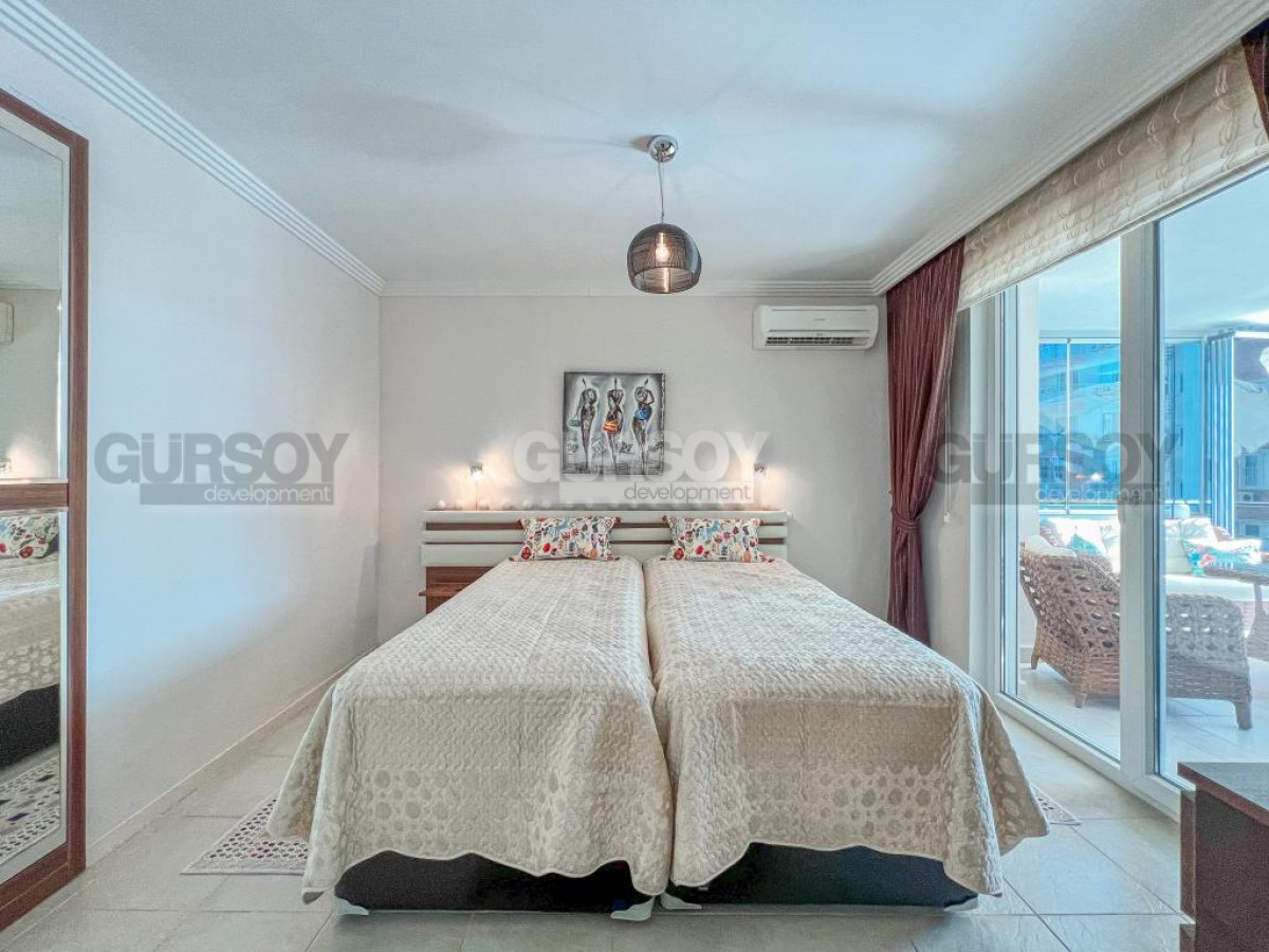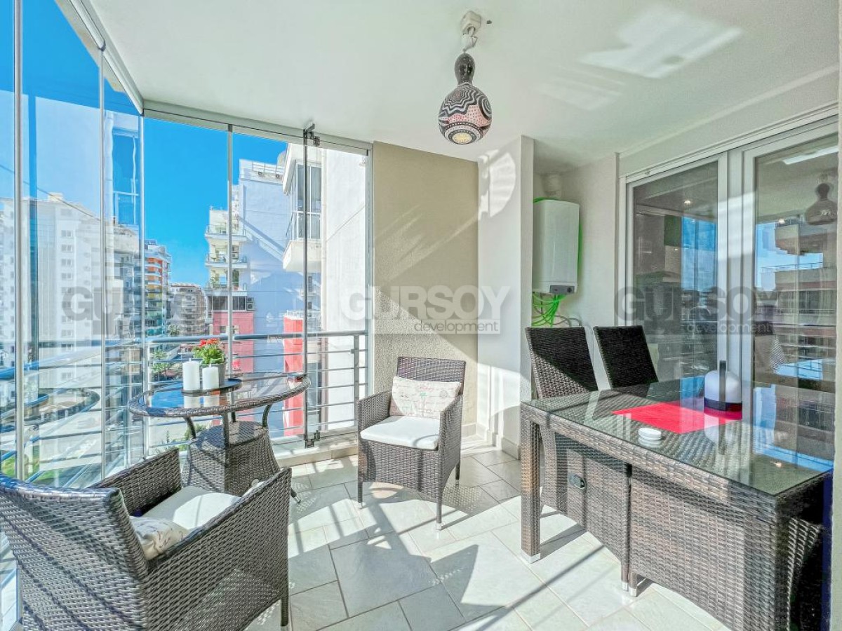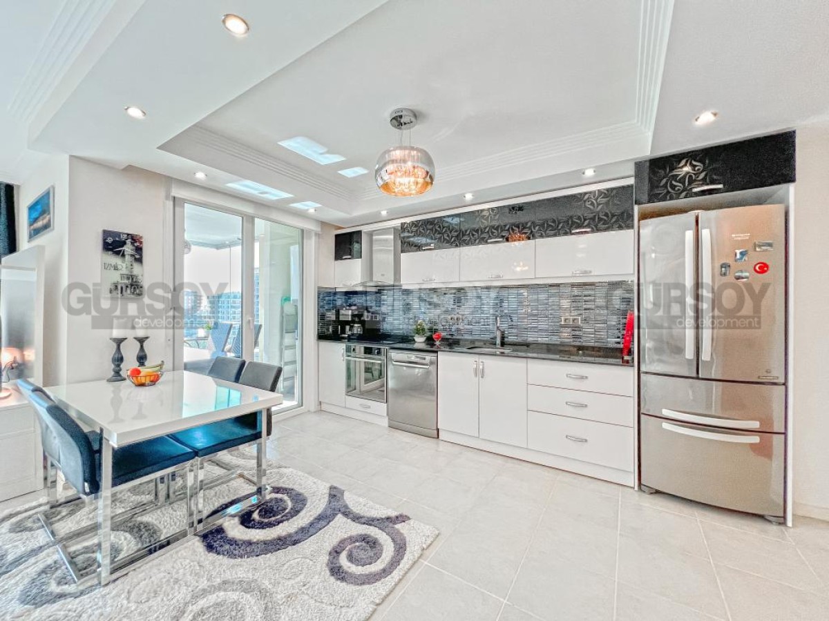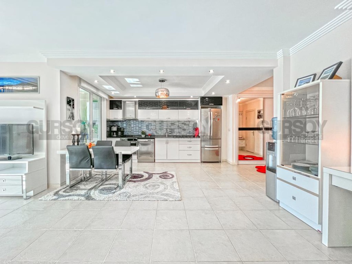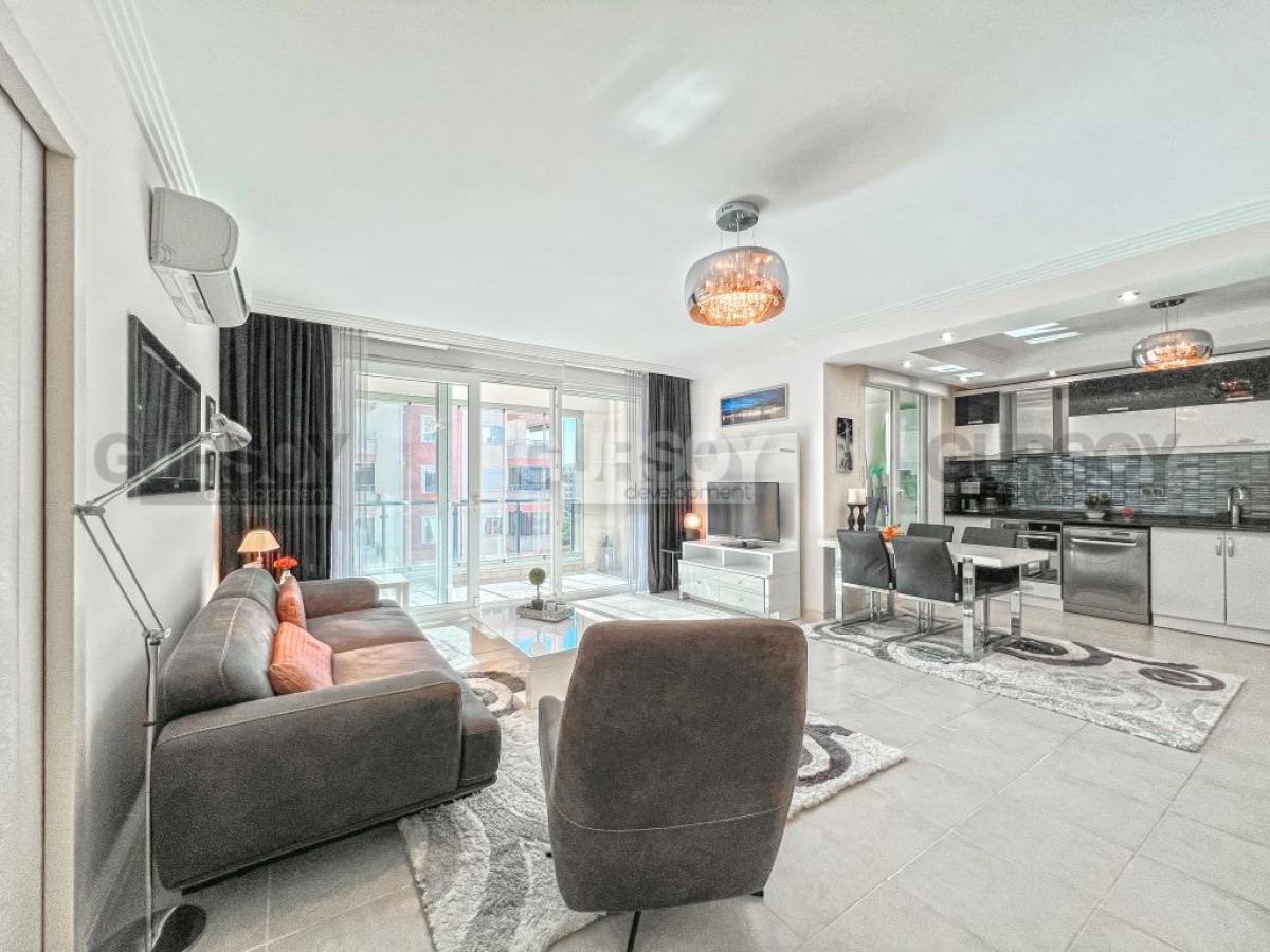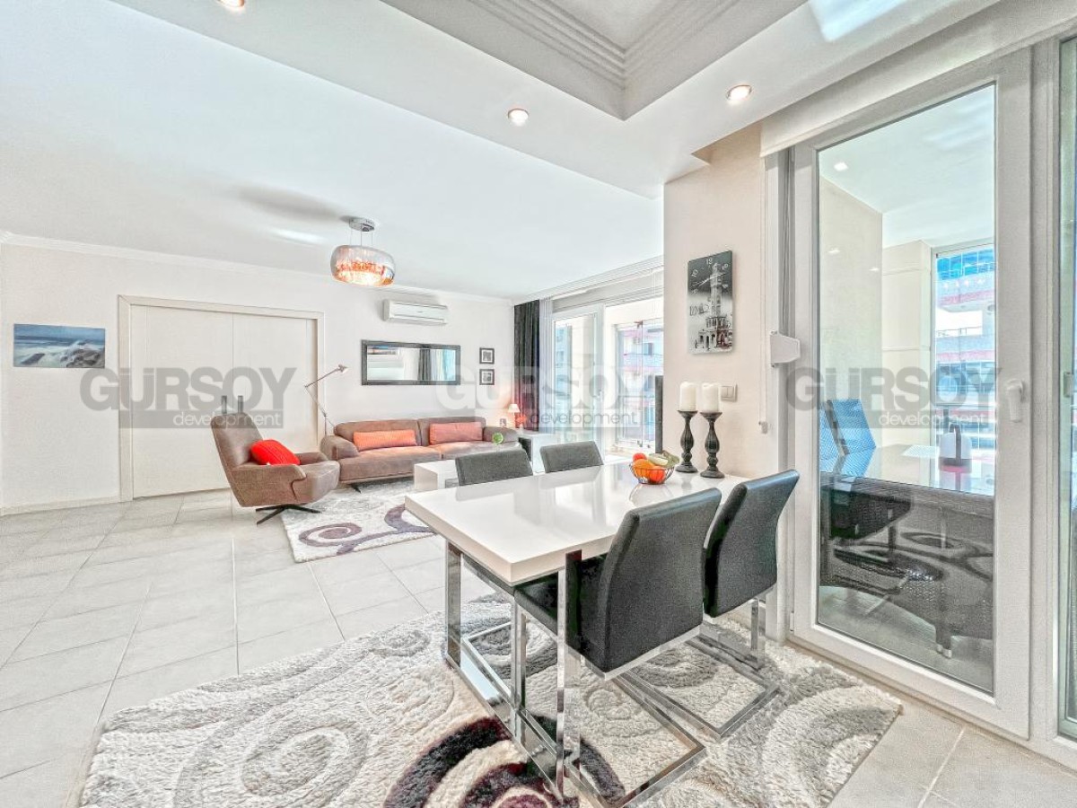 В данном разделе представлена квартира, к многочисленным достоинствам которой относятся: современный дизайн, укомплектованность комфортабельной мебелью и всей необходимой бытовой техникой, удачная локация в нескольких минутах ходьбы от моря и центра популярного района Аланьи Махмутлар, и очень привлекательная цена. Общая площадь квартиры - 130 м2, планировка 2+1 представлена кухней открытого типа, совмещенной с гостиной, двумя спальнями, двум оснащенными душевыми кабинами санузлами и большим застекленным балконом с видом на город. В основе интерьере апартаментов - белый цвет, гармонично дополненный яркими картинами, плотными шторами, люстрами и предметами декора. Просторная гостиная условно разделена на салон, с мягким диваном, креслом, тумбой, сервантами и низким столиком; и кухню, с обеденным столом и оснащенным по последнему слову техники гарнитуром. Спальни укомплектованы удобными кроватями, тумбами и гардеробными шкафами, а на балконе организована полноценная рекреационная территория, с несколькими зонами отдыха.