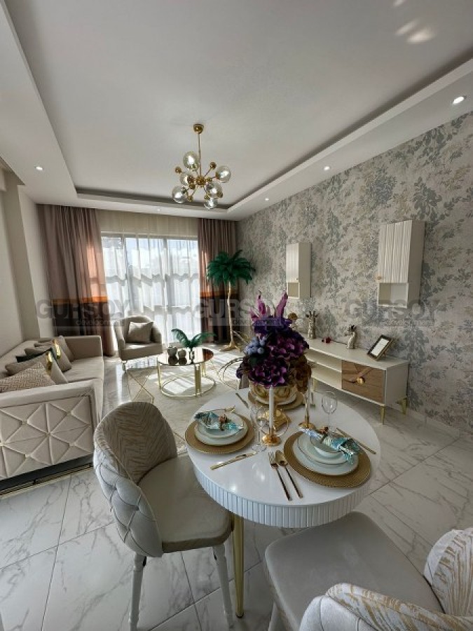 Вашему вниманию представлена новая, готовая к проживанию квартира, с современным дизайном, приятным светлым интерьером и высококлассной мебелью. Находится она на 1-м этаже в резиденции, введенной в эксплуатацию в 2023 году, и имеет общую площадь 58 м2, на которых расположились: совмещенная с кухней гостиная, спальня, оснащенный душевой кабиной санузел, и открытый балкон. Квартира - светлая и уютная, с мягким многоуровневым освещением, обоями спокойных оттенков на стенах, оригинальными люстрами и предметами декора. Гостиная укомплектована комфортабельным диваном, креслом, стильным гарнитуром, журнальным столиком и круглым обеденным столом, с мягкими стульями. В спальне установлены тумбы, большая кровать, гардеробный шкаф и комод, а при входе имеется оригинальный туалетный столик. Новым владельцам останется лишь выбрать бытовую технику для кухни, и наслаждаться комфортной атмосферой.