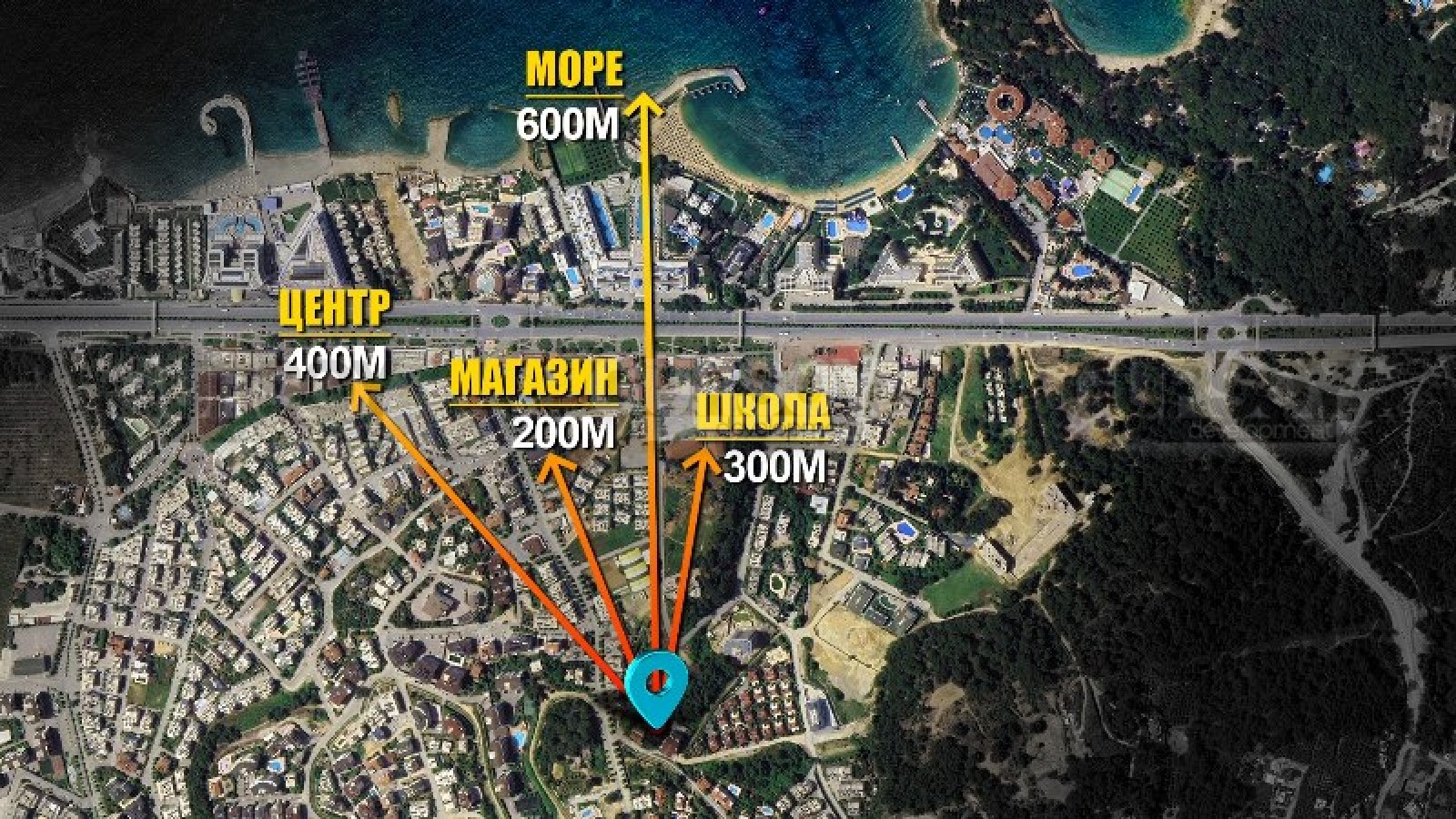 Расположенный всего в 650 метрах от моря комплекс идеально подходит для тех, кто мечтает жить вблизи от пляжа. Рядом с комплексом находятся многочисленные магазины, рестораны и кафе, что делает повседневную жизнь еще более удобной и приятной. Территория окружена хвойными деревьями, что создает особую атмосферу уюта и свежести.