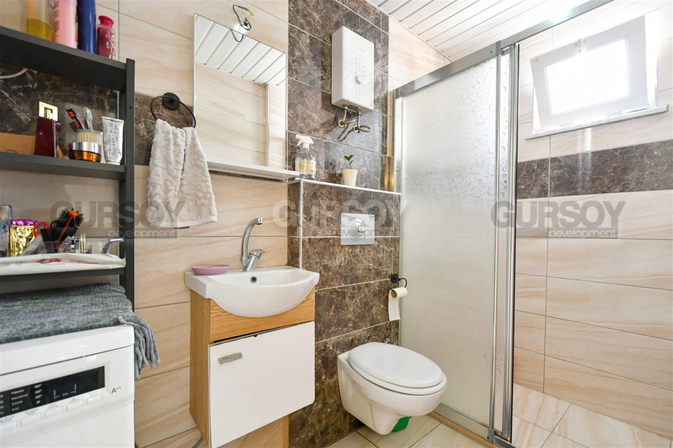 В доме есть лифт и общий бассейн. Айдат составляет всего 650 лир в месяц, что делает содержание квартиры максимально экономичным. Отличный вариант для тех, кто ищет жильё у моря с низкими постоянными расходами.
