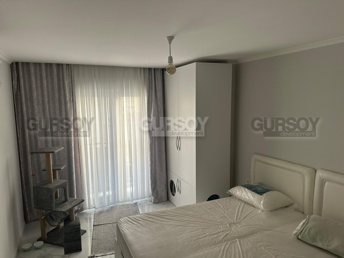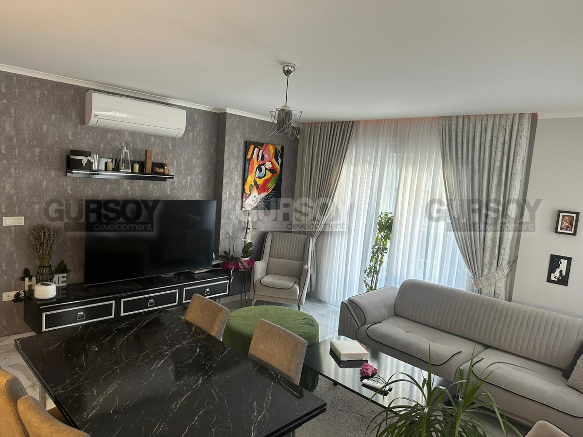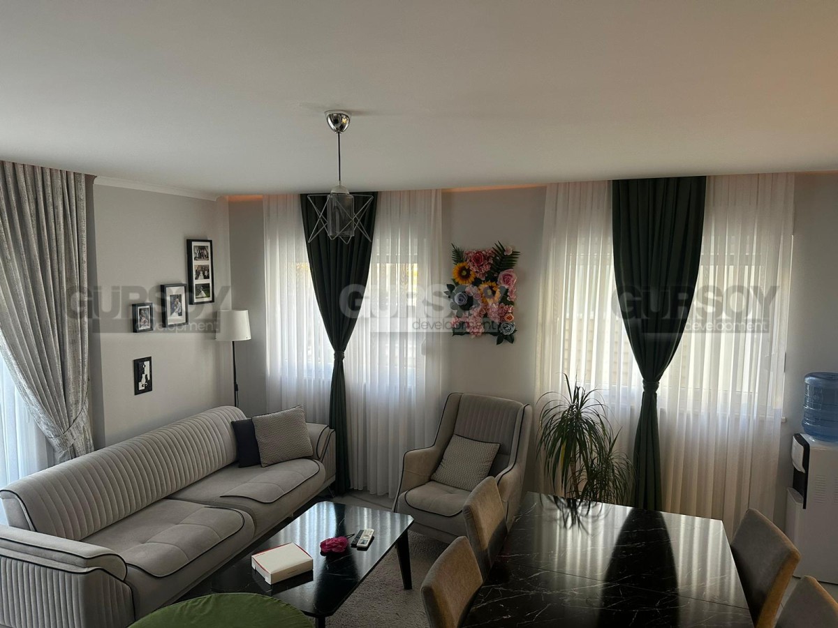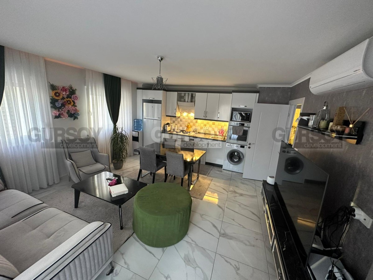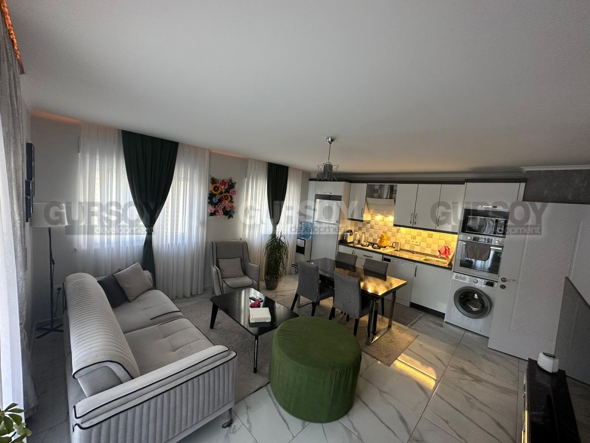 Если вы - активны и современны, и предпочитаете совмещать социальную жизнь с комфортным отдыхом у моря, предлагаем обратить внимание на апартаменты в центре популярного, развитого района Аланьи - Махмутлар. В 2022 году тут как раз завершилось строительство нового жилого комплекса, и на 4-м его этаже выставлена на продажу квартира 2+1, общей площадью 90 м2, с совмещенной с кухней гостиной, двумя спальнями, санузлом и открытым балконом, с видом на оживлённую улицу. Квартира полностью укомплектована мебелью и бытовой техникой, а стильный лаконичный дизайн, с модными серыми оттенками в интерьере, наверняка придётся по вкусу многим. В центре гостиной организована уютная зона отдыха, с диваном, креслами, журнальным столиком, тумбой и пуфом. Ближе к кухне, оснащённой холодильником, стиральной и посудомоечной машинами и духовым шкафом, расположен обеденный стол. В спальнях установлены удобные кровати, тумбы и гардеробные шкафы, а балкон представляет собой полноценную рекреационную территорию, с современным мягким уголком и комнатными растениями.