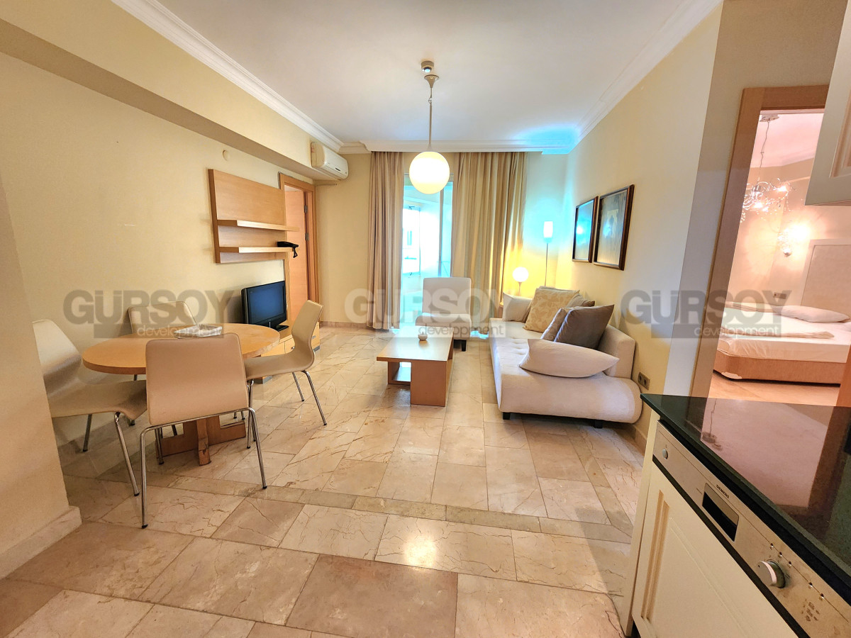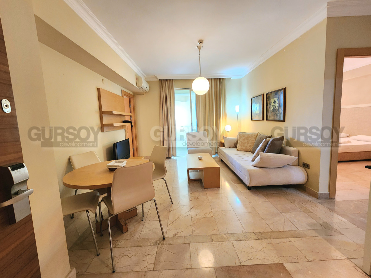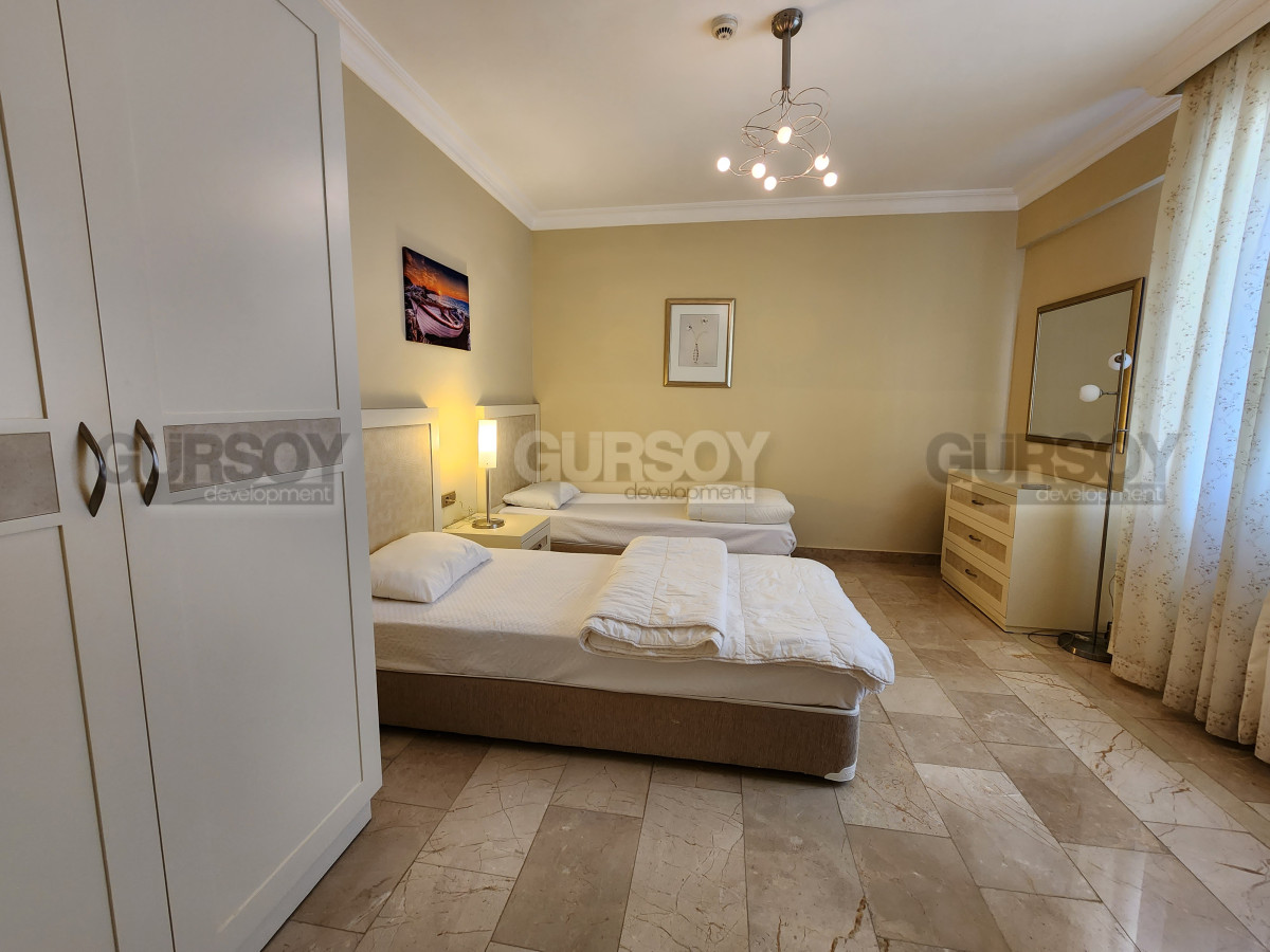 Планировка квартиры включает 2 спальные комнаты, гостиную с кухней открытого типа, ванную комнату с душевой кабиной и просторный балкон с видом на горы Торос. Мебель и бытовая техника уже входят в стоимость. Апартаменты подходят как для семейного отдыха, так и для сдачи в аренду.