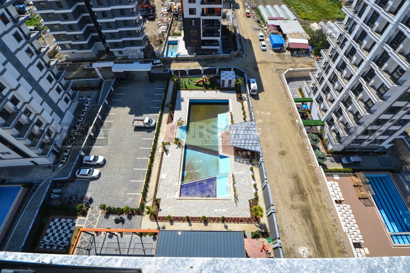 Махмутлар, где находится эта резиденция, – это чудесный район для жизни и отдыха. Этот живописный уголок покоряет своей красотой и теплой атмосферой. Здесь вы найдете все необходимое для комфортного и приятного времяпрепровождения: рестораны с изысканной кухней, магазины, парки и, конечно же, чистые пляжи Средиземного моря всего в 600 метрах от комплекса.