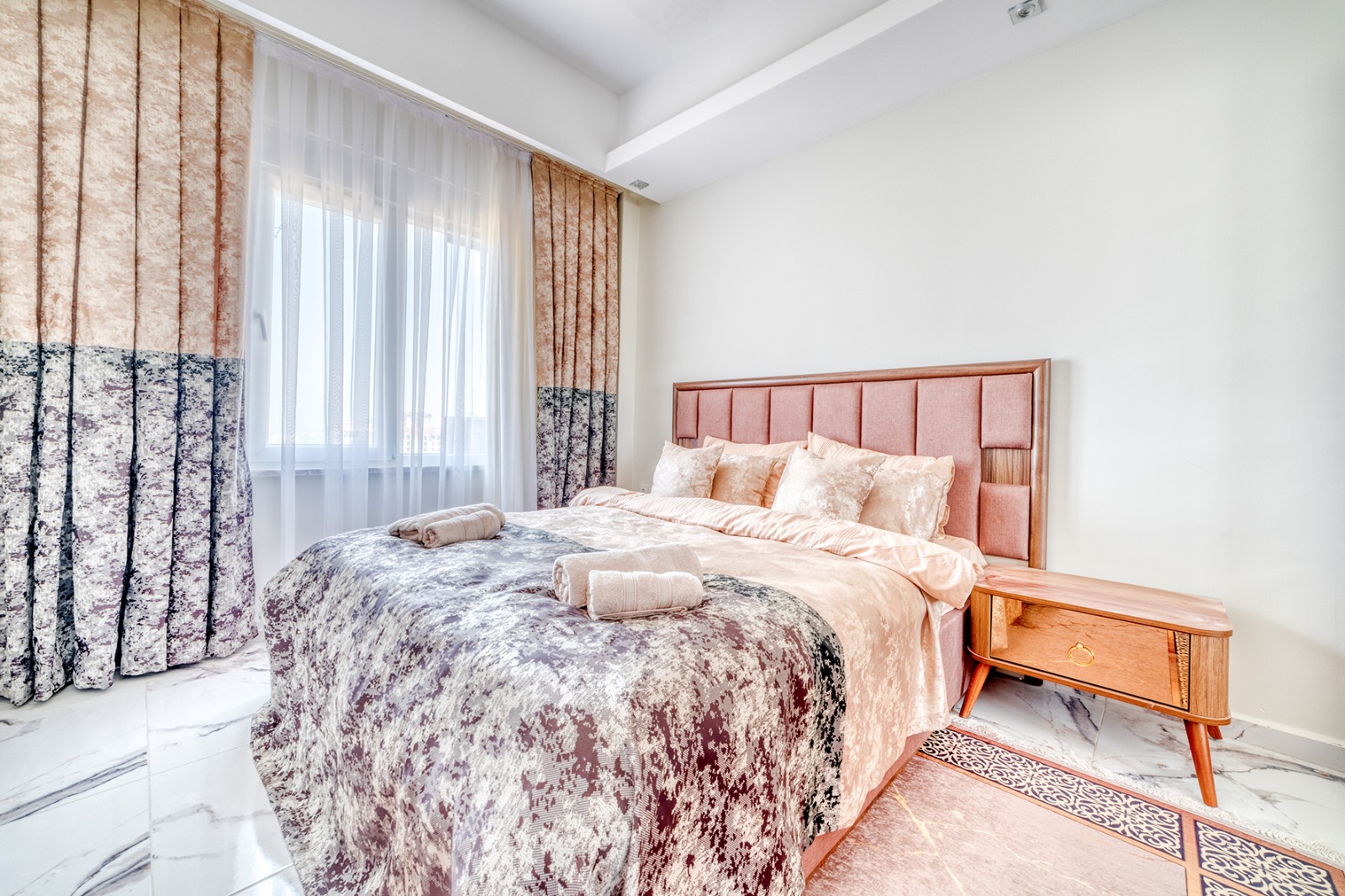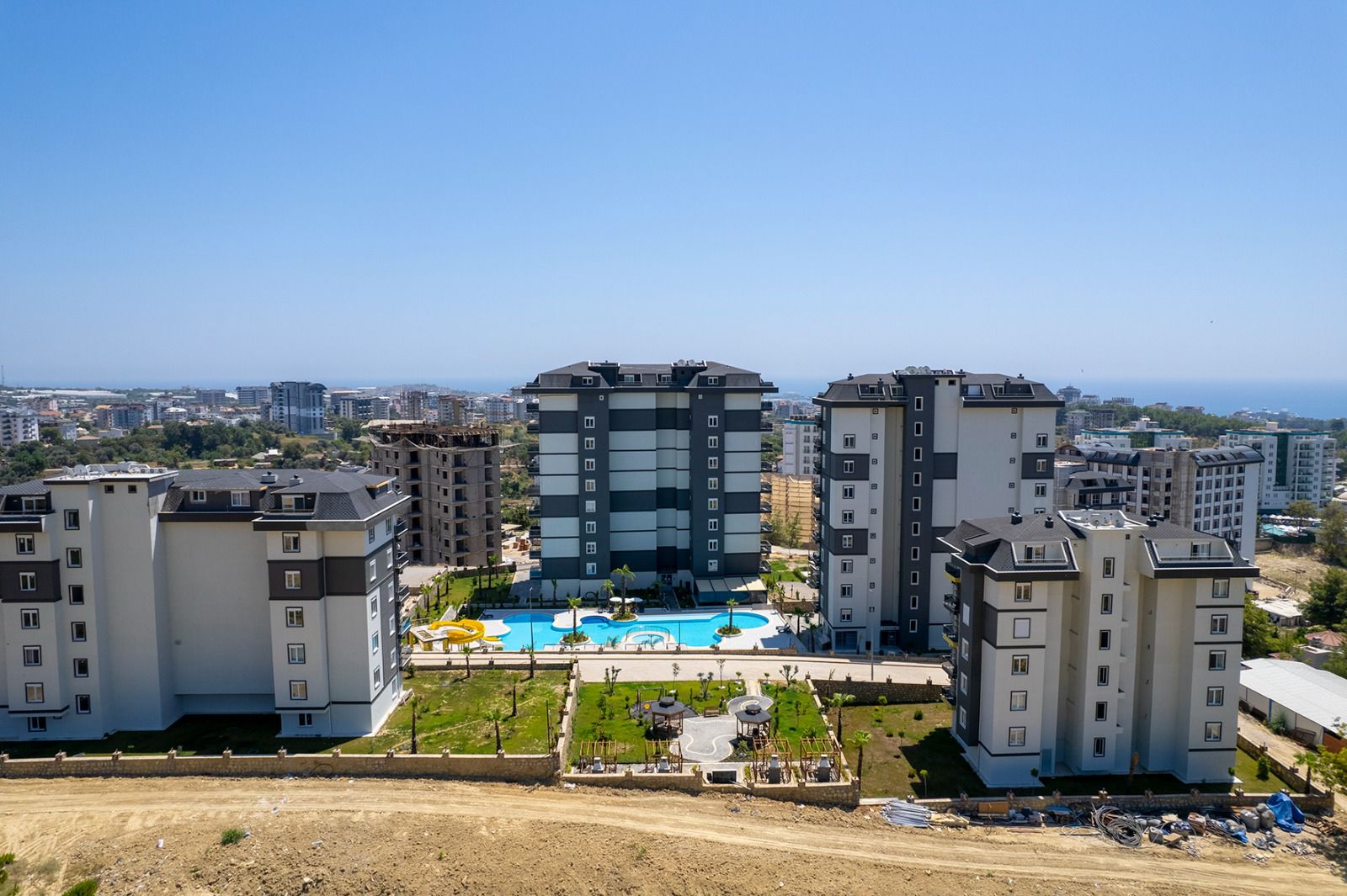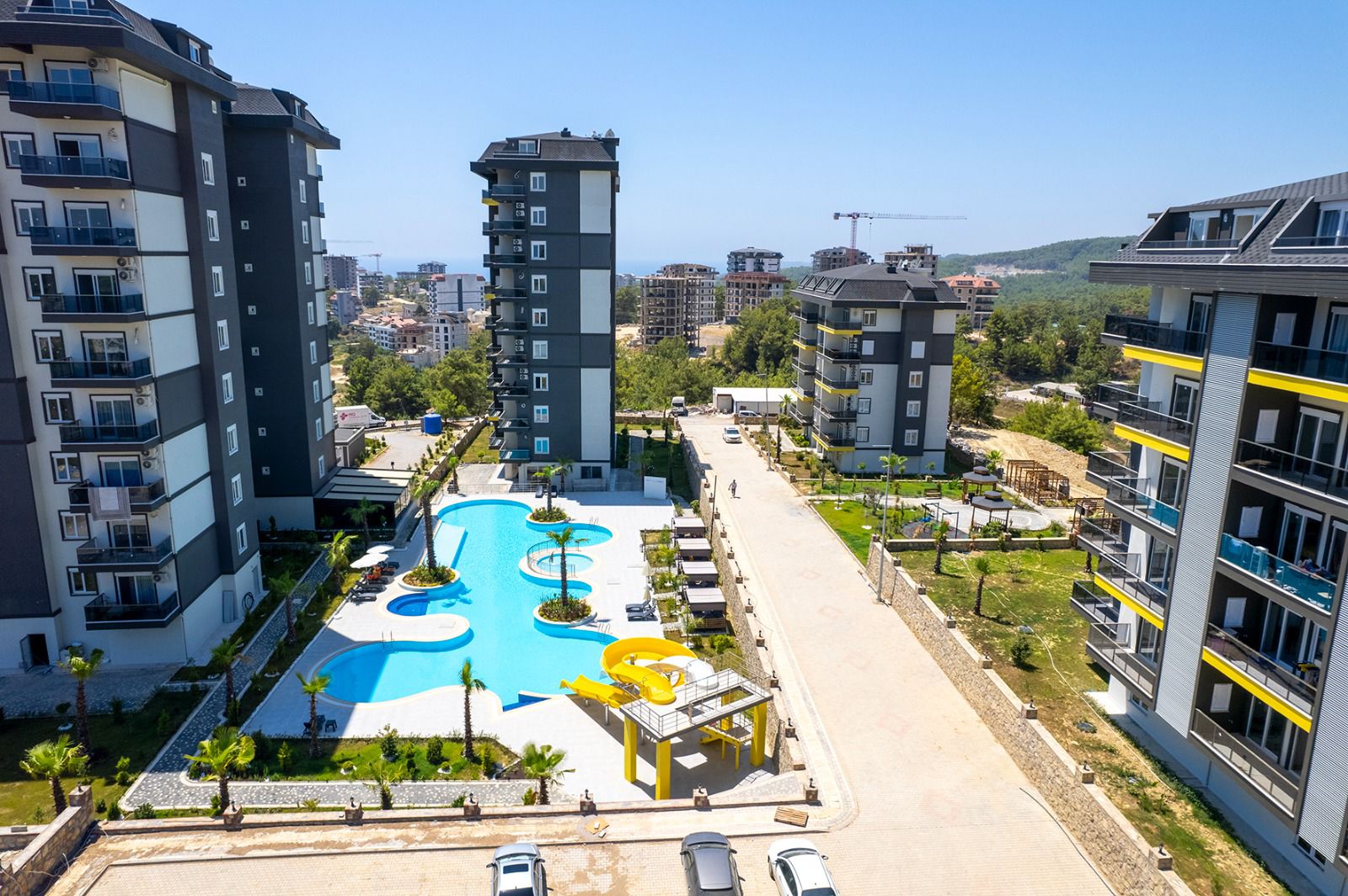 Комплекс состоит из 9 этажей, предлагая современные удобства и инфраструктуру для комфортной жизни. На территории комплекса есть открытый бассейн, аквапарк, сауна, хамам, фитнес-центр, а также детская игровая площадка и барбекю-зона для семейных встреч. Для вашего удобства также предусмотрены лифт, система видеонаблюдения 24/7 и генератор на случай перебоев с электричеством. Управляющая компания заботится о ежедневном обслуживании и безопасности комплекса.