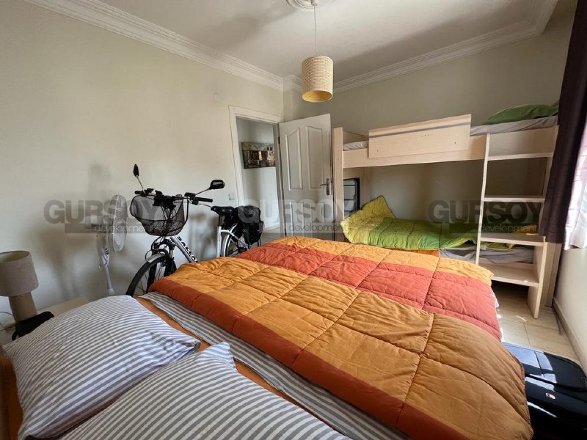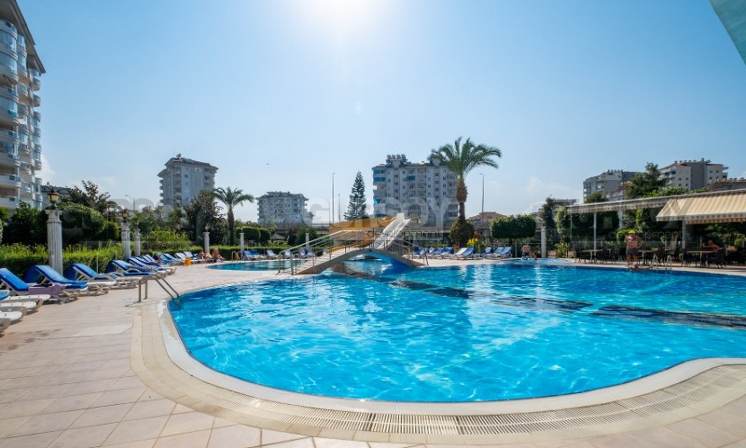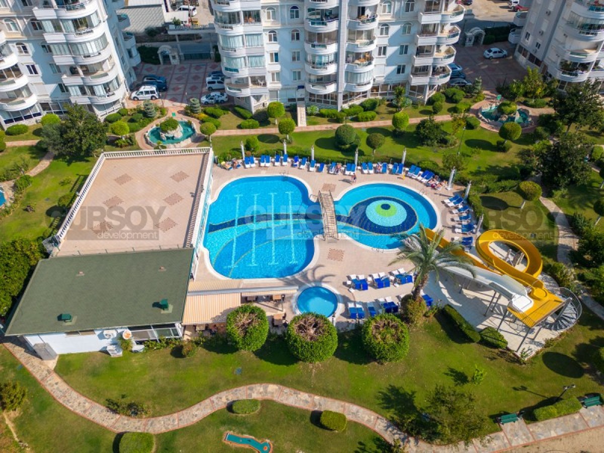 Квартира находится всего в 600 метрах от моря, что обеспечивает легкий доступ к пляжу и морским прогулкам. Комплекс, в котором она расположена, предлагает богатую инфраструктуру для комфортной жизни: открытый плавательный бассейн с водными горками, крытый бассейн для круглогодичного использования, фитнес-центр, теннисный и баскетбольный корты. Для удобства жителей имеются лифт, парковка и детская площадка.