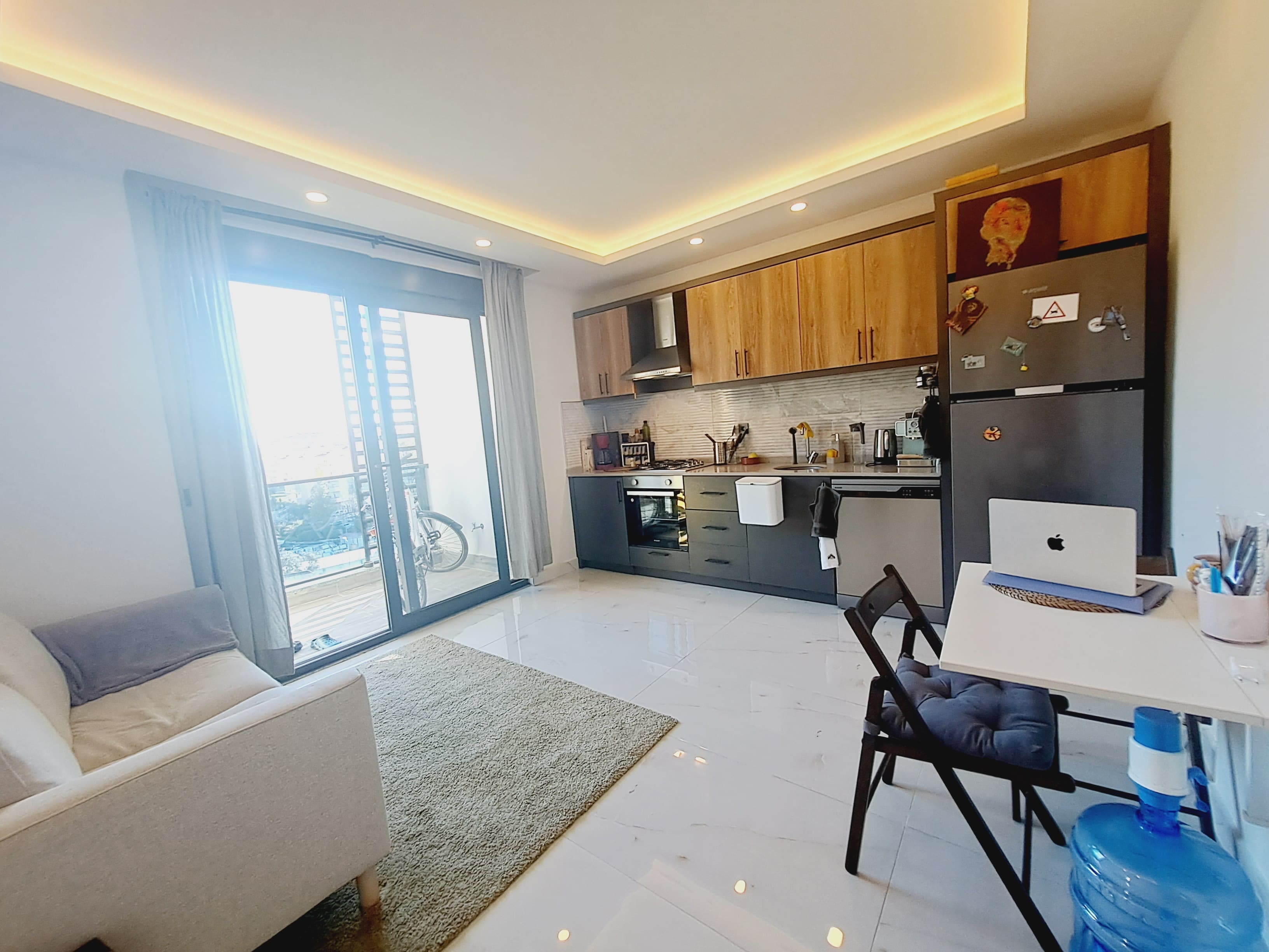 Квартира с удобной планировкой 1+1 общей площадью 50 м² расположена на 3 этаже современного жилого комплекса, построенного в 2021 году. Гостиная, совмещенная с кухней, уютная спальня, современная ванная комната и балкон с видом на город создают комфортное пространство для жизни. Ориентация на запад и юго-запад.