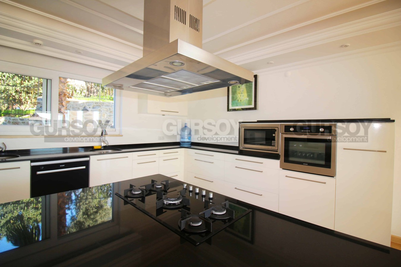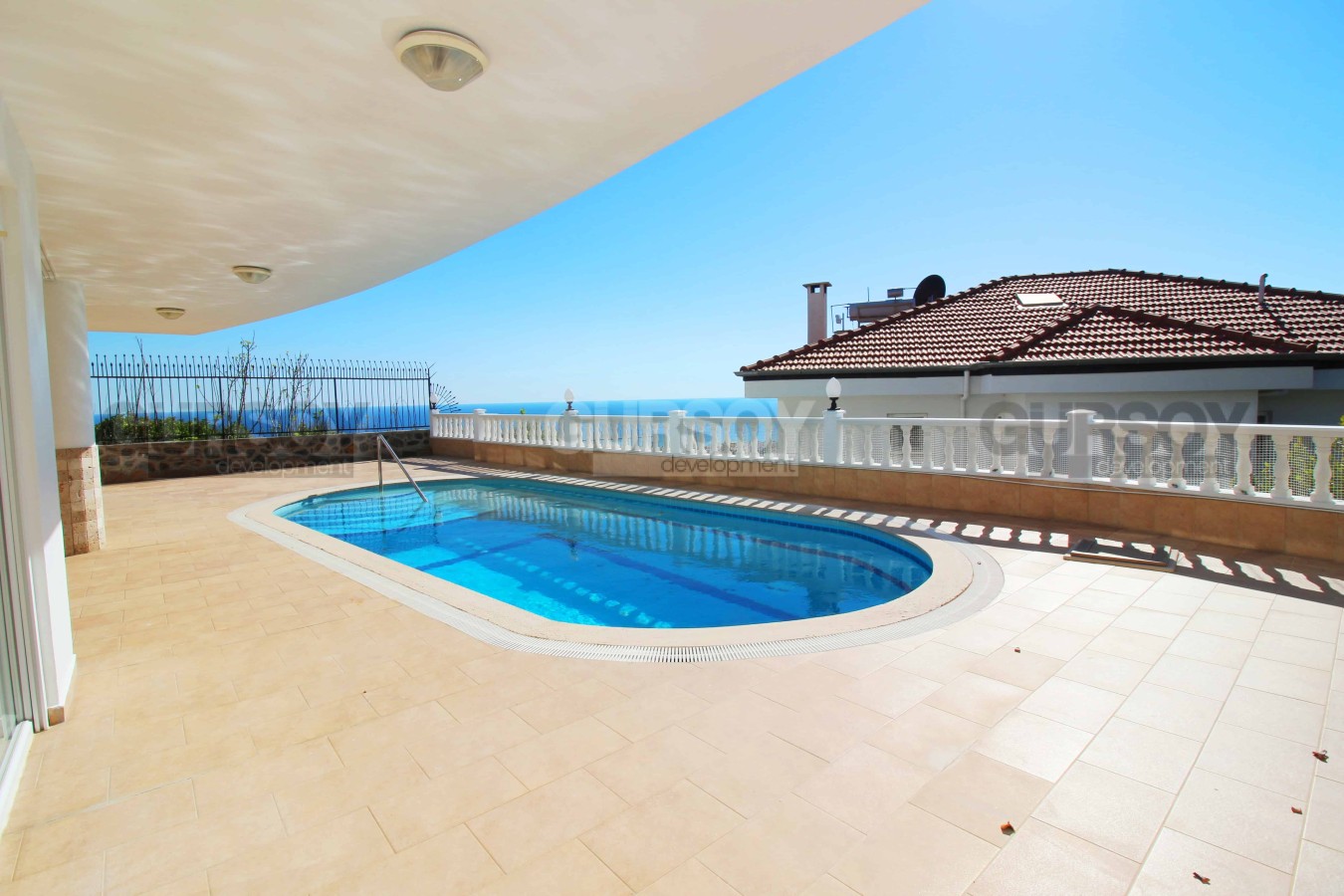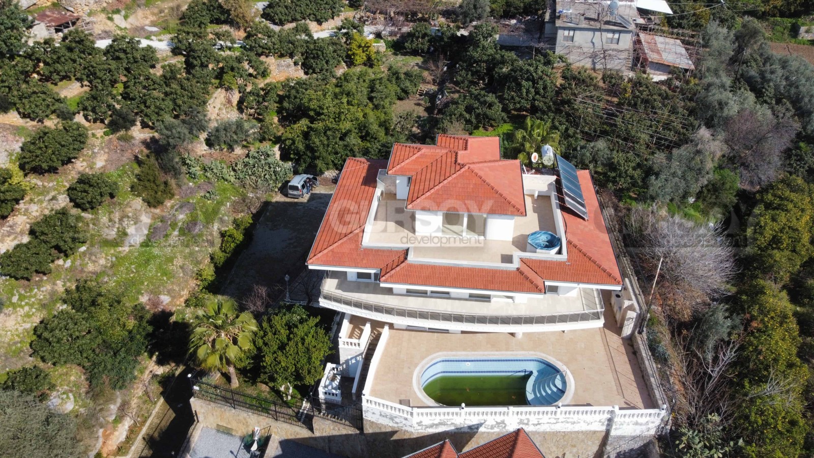 Планировка виллы предусматривает 6 спален и одну большую гостиную с вместительной кухней открытого типа, которая имеет функциональный кухонный гарнитур и остров, обеспечивающие много пространства для готовки пищи и хранения кухонных принадлежностей. Предусмотрено шесть спален, балконы и терраса с джакузи. Площадь виллы составляет 560 м2. Вилла имеет калориферную систему обогрева, интернет, антенну, кондиционеры марки LG.