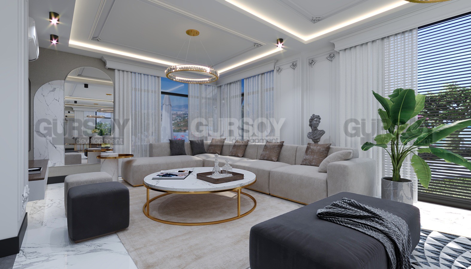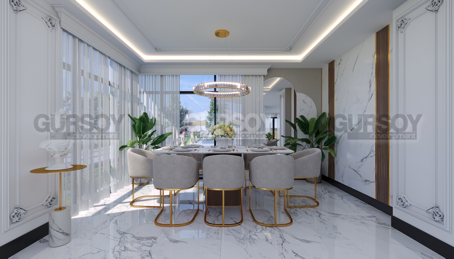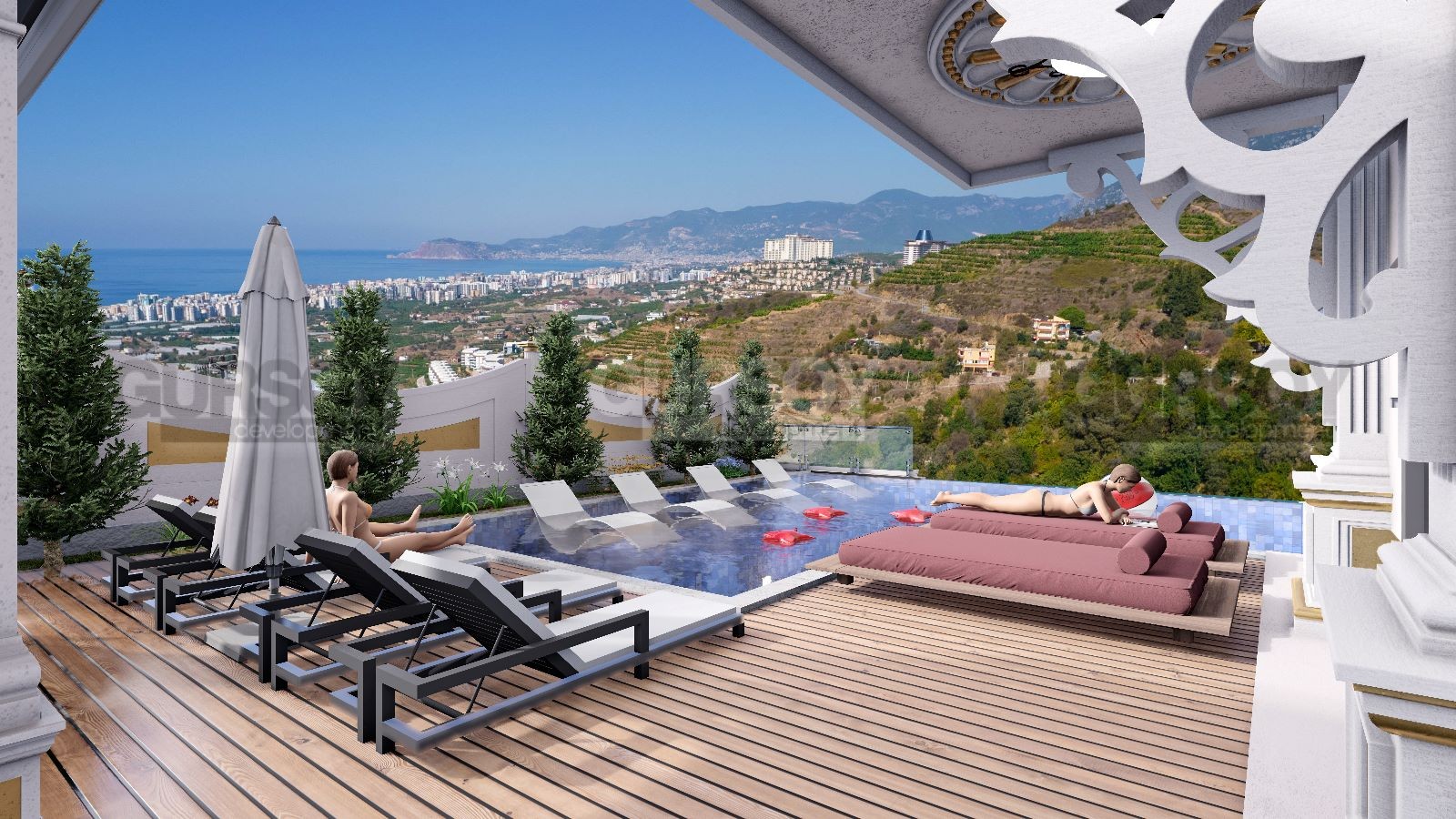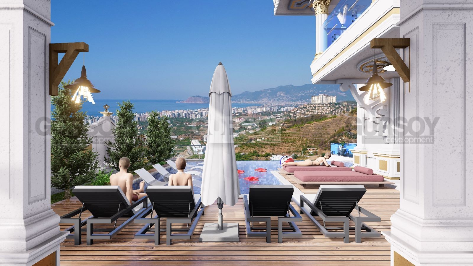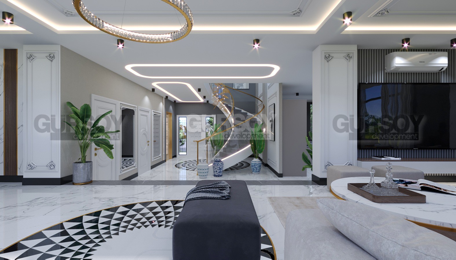 Вилла предлагает роскошную планировку 5+2 и общую площадь 450 квадратных метров. Она включает пять изысканных спален, семь ванных комнат, две просторные гостиные, объединенные с кухней, гардеробную, прачечную и лифт для удобства передвижения по всему зданию. Особенностью виллы являются шикарные террасы, с которых открываются превосходные панорамные виды.