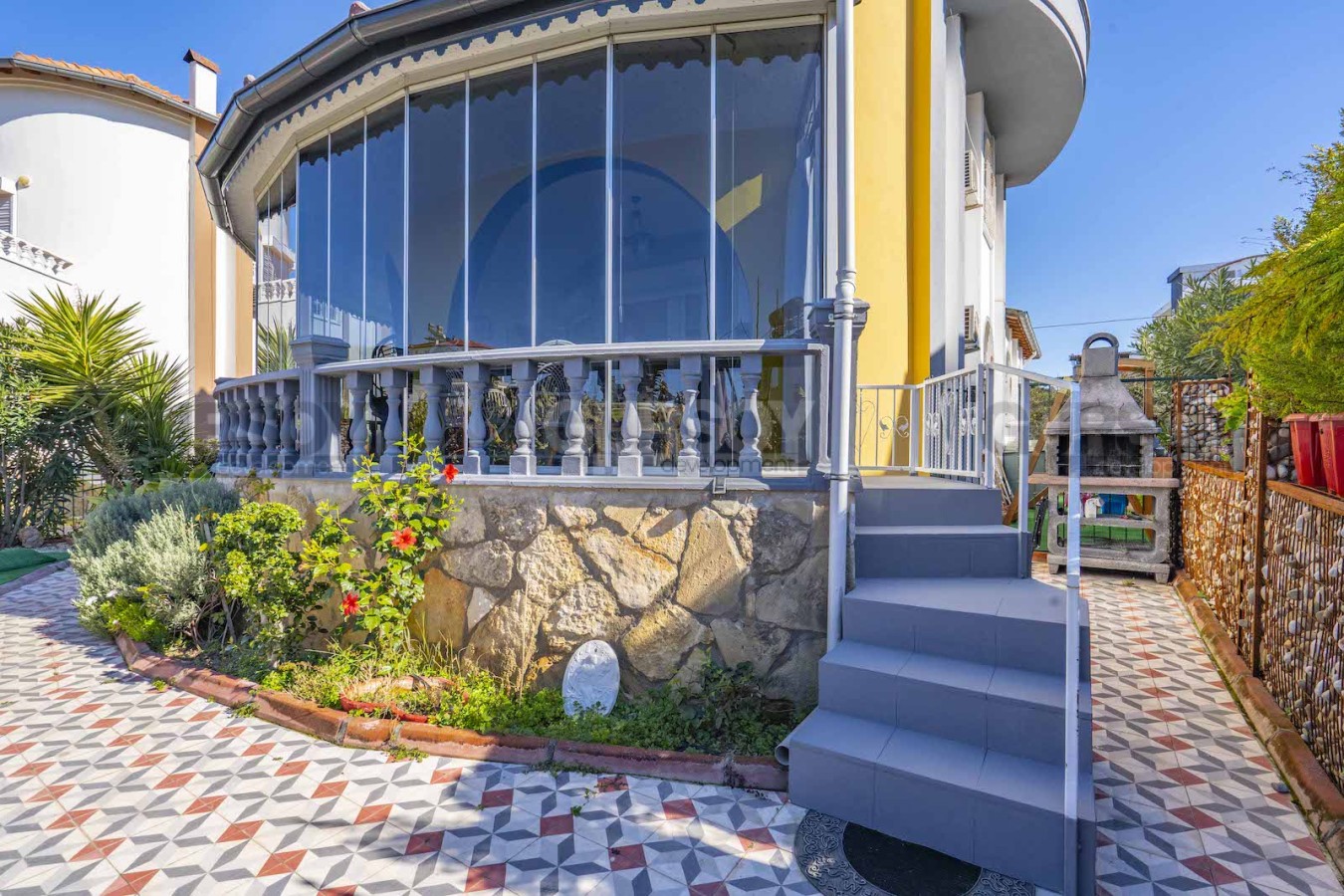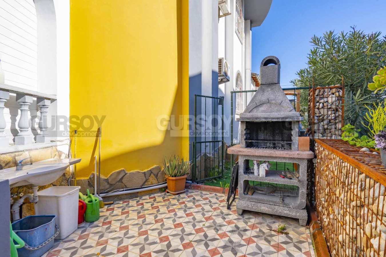 Согласно планировке 3+1, 200м2 в вилле: гостиная, совмещенная с кухней открытого типа, 3и спальни, 3и ванных комнаты, 3и балкона. У виллы есть собственный сад, зона барбекю.