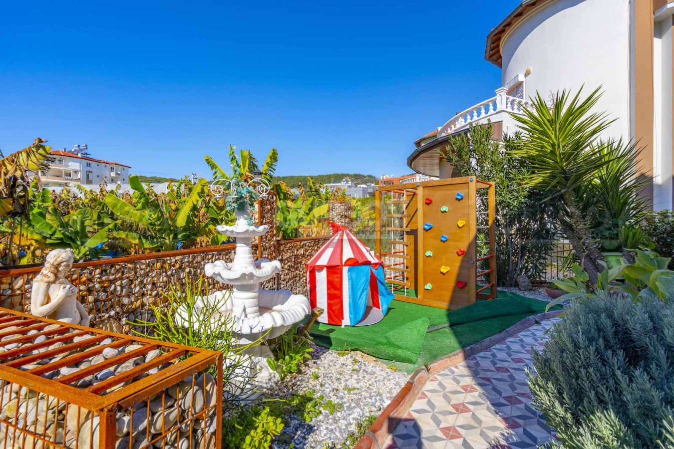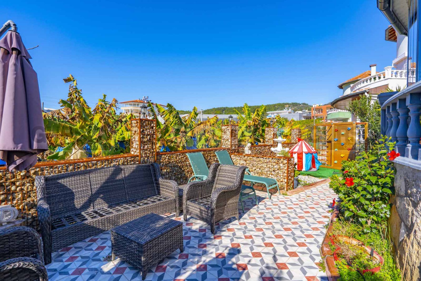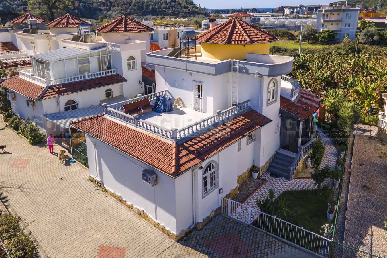 Вилла предлагается со всей необходимой мебелью и техникой, возможно заехать и жить. Дизайн интерьера солнечный и необычный. На территории комплекса есть парковка.