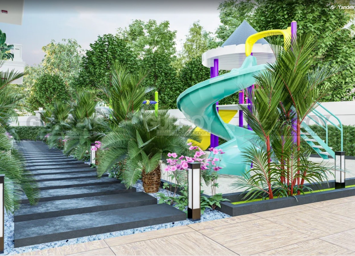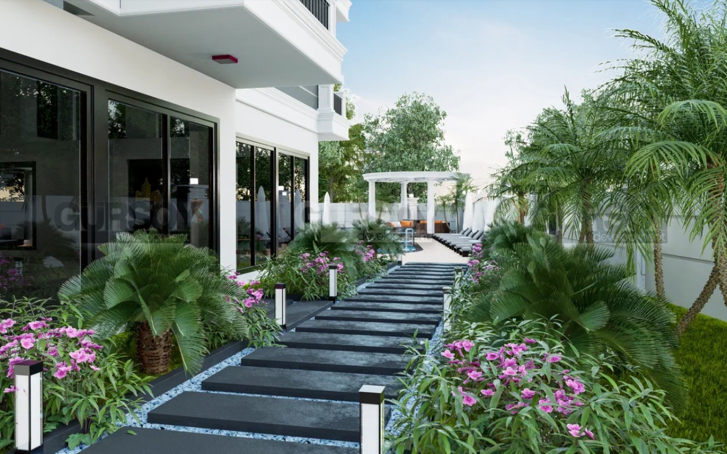 Инфраструктура: открытый бассейн (100 м²), детская площадка, пейзажный вид и зеленые насаждения на заднем дворе, парковка, камелия, зона для барбекю, фитнес-зал, сауна, парная, генератор электроэнергии, камеры видеонаблюдения.